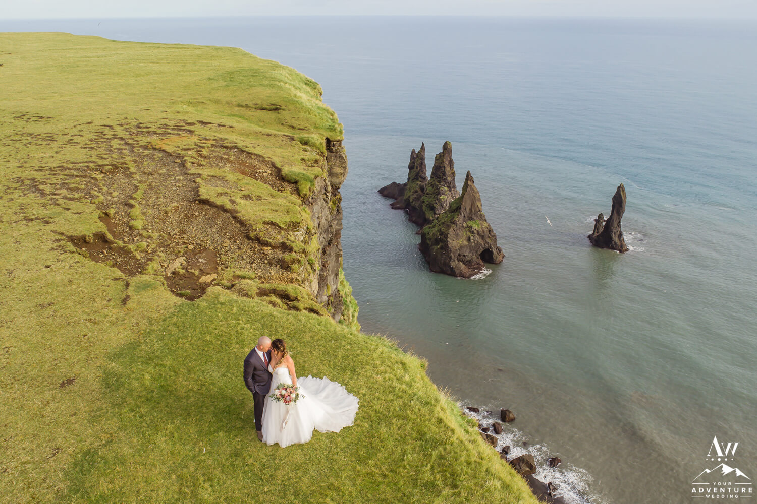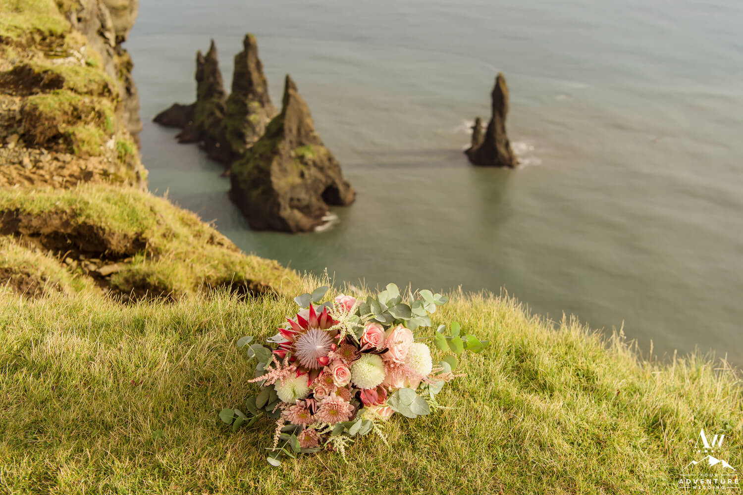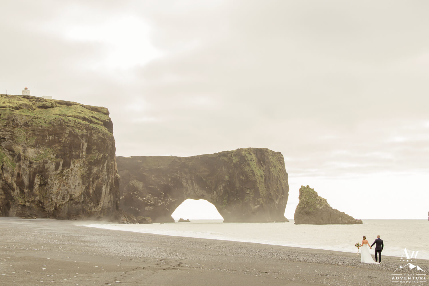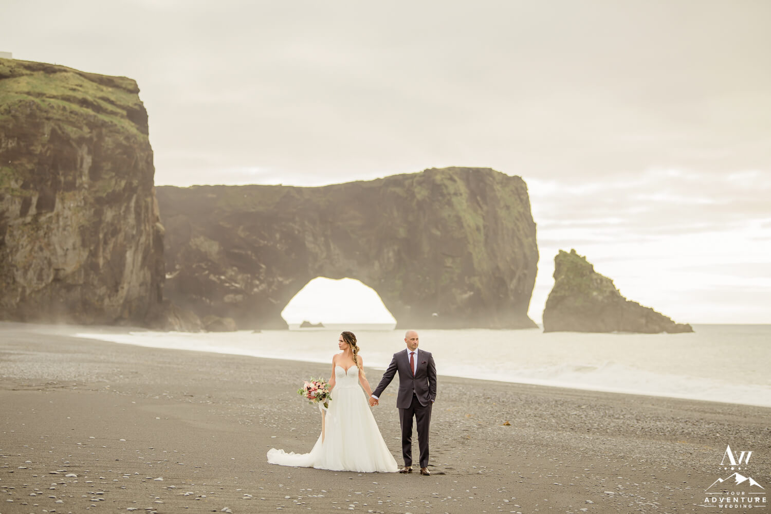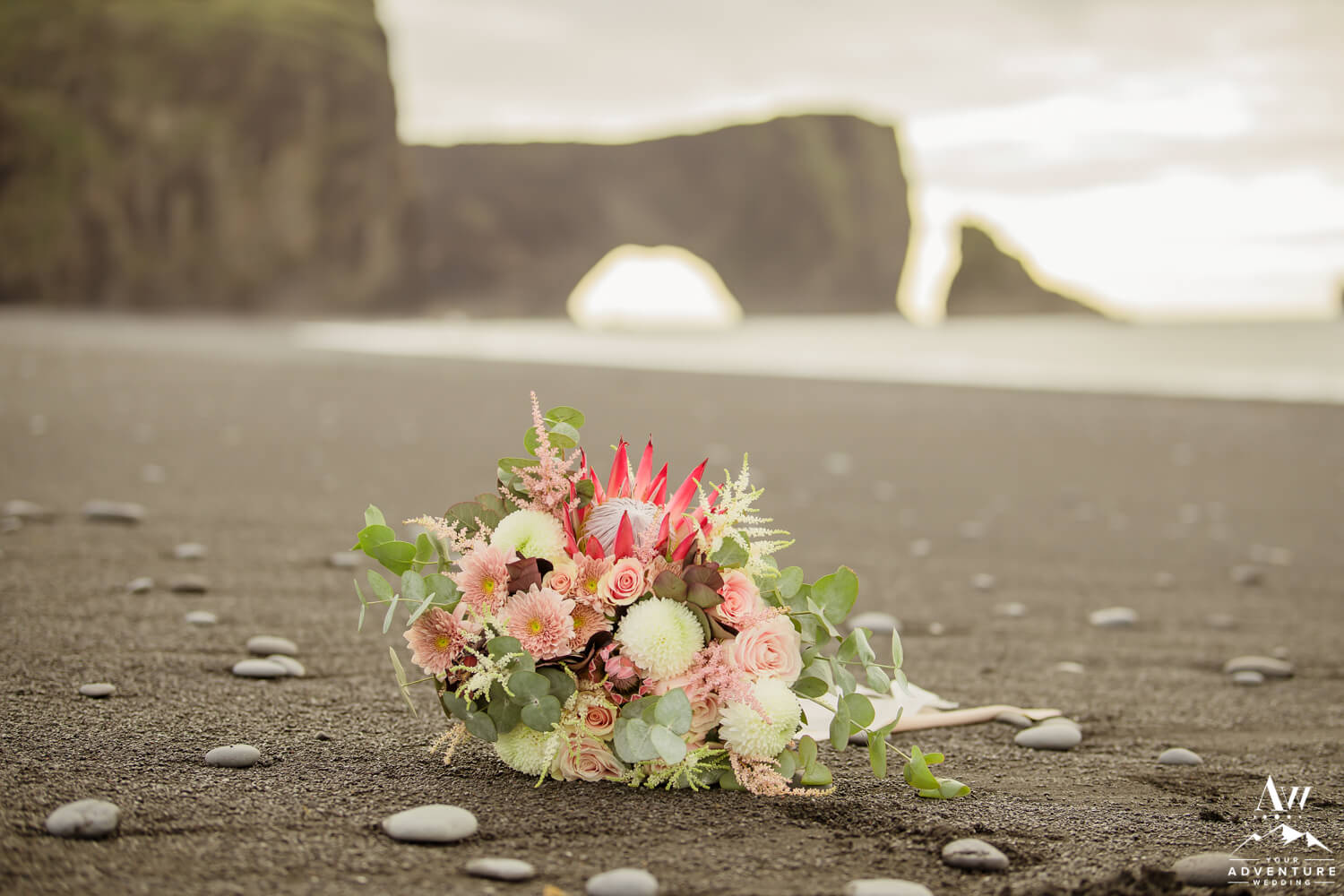 After everyone loaded into the super jeeps, they were on their way to their private property Iceland wedding ceremony location. Being so captivated by unique landscapes, they decided on having their ceremony on the private beach in front of Dyrhólaey sea arch. It was magical with the morning sun shinning everywhere! Subsequently when the ceremony concluded the group delighted in a luxury champagne toast complete with Icelandic pastries including kleinur, macarons, artisan chocolates, and colorful fruit!