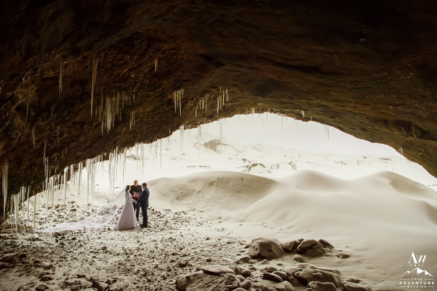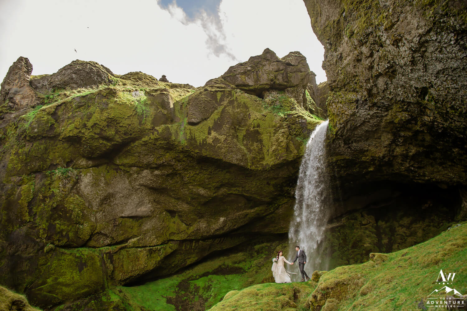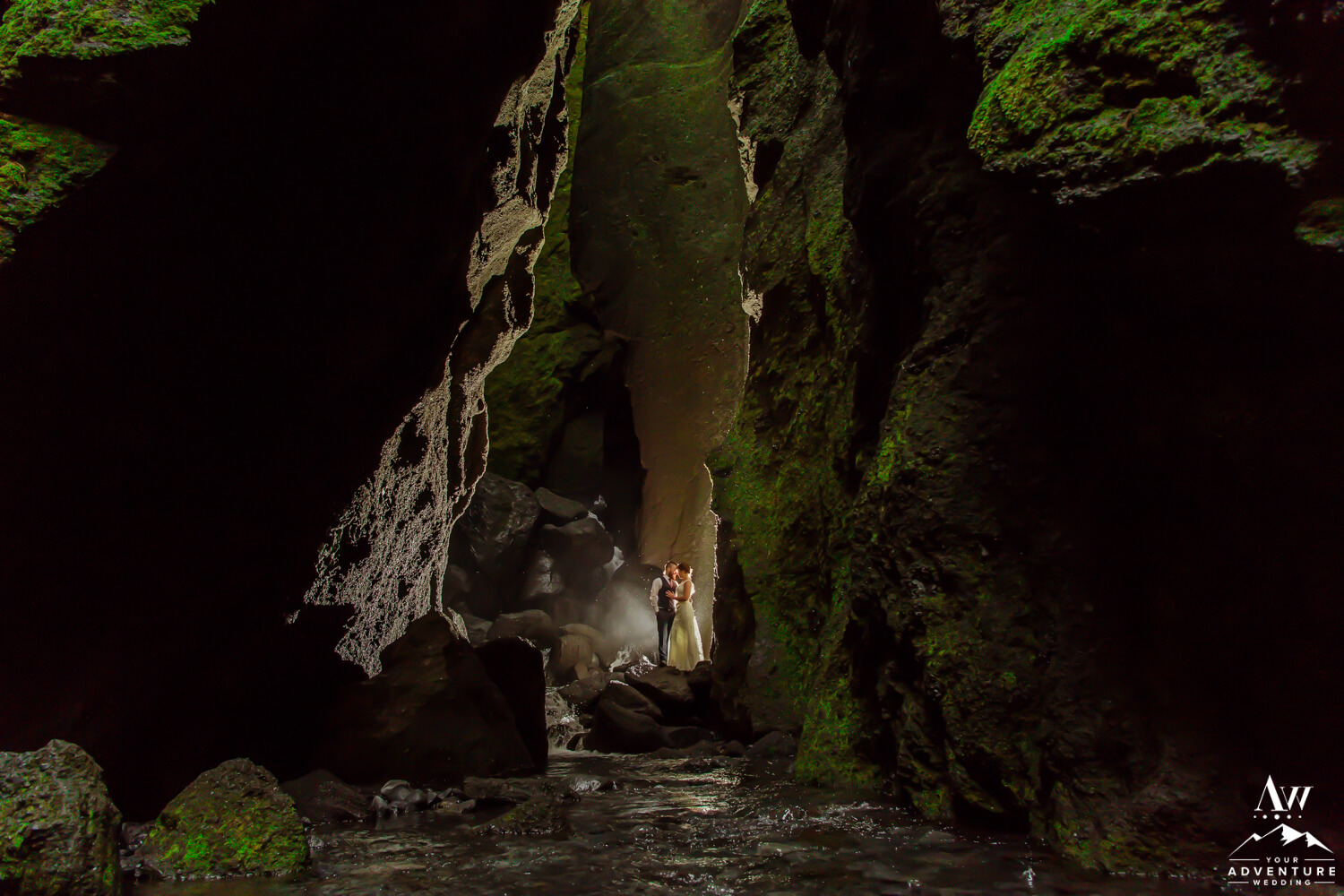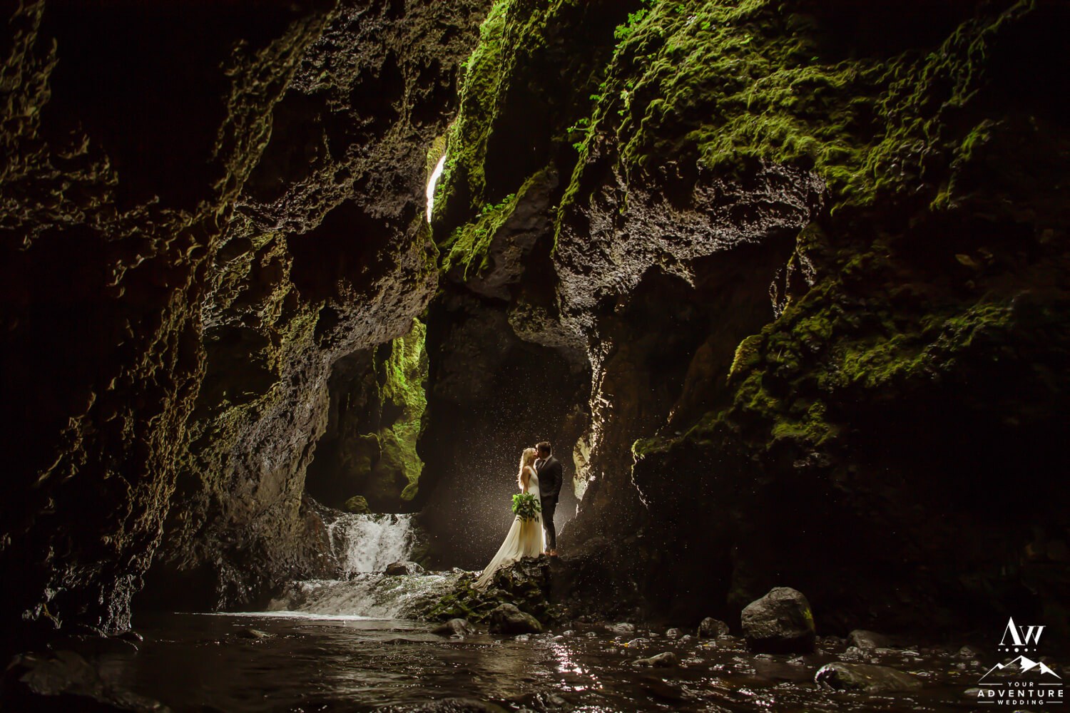 In February, Spencer and Amanda held a half day Iceland adventure wedding experience. Having a ceremony at a private black sand beach waterfall was extraordinary! Following they had a luxury champagne toast, explored a narrow canyon and hidden cave!