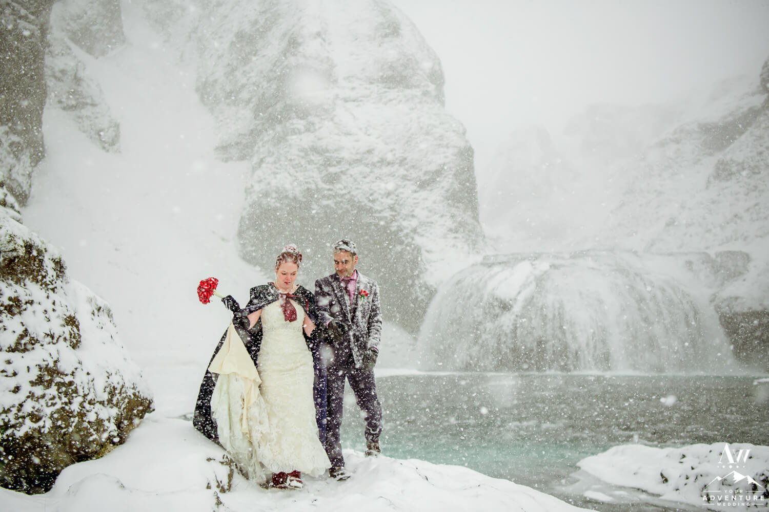 One of our favorite March weddings, to date! To illustrate, these two rocked out a waterfall wedding ceremony followed by a blizzard and stunning glacier adventures together. You must check out their full Google review of their journey with us too!