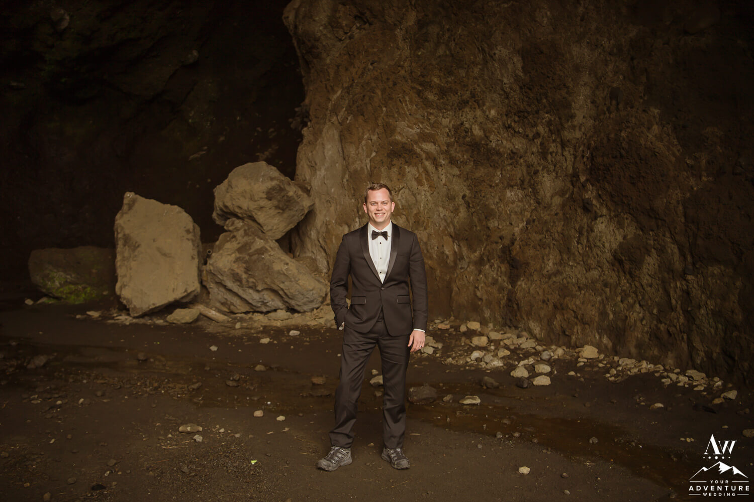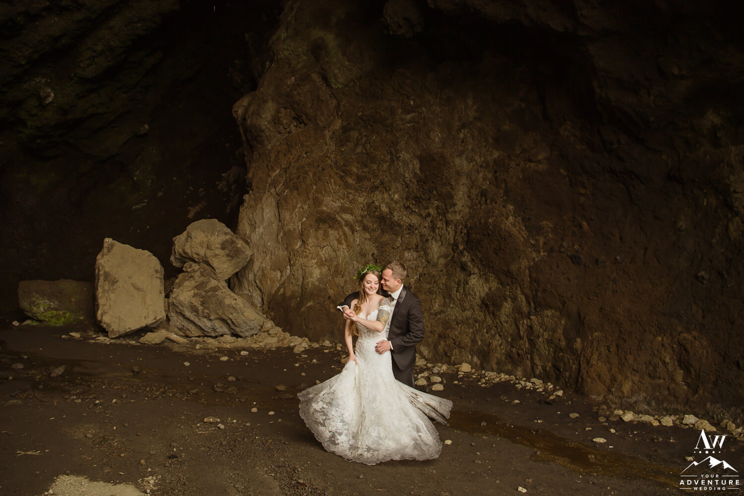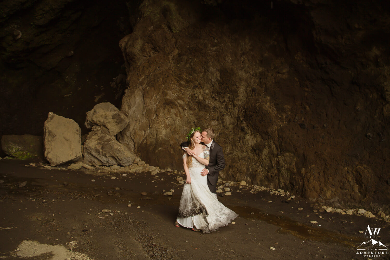 Taking a few minutes away from the wind and rain, the lovers found shelter inside of a natural cave. Totally the inspiring thing about eloping in Iceland too… You can do whatever you want during the day to celebrate! Maybe you drink champagne, beer from a Viking horn, share a dance in a cave, or steal kisses and cuddle to warm each other up. Your show, your rules!