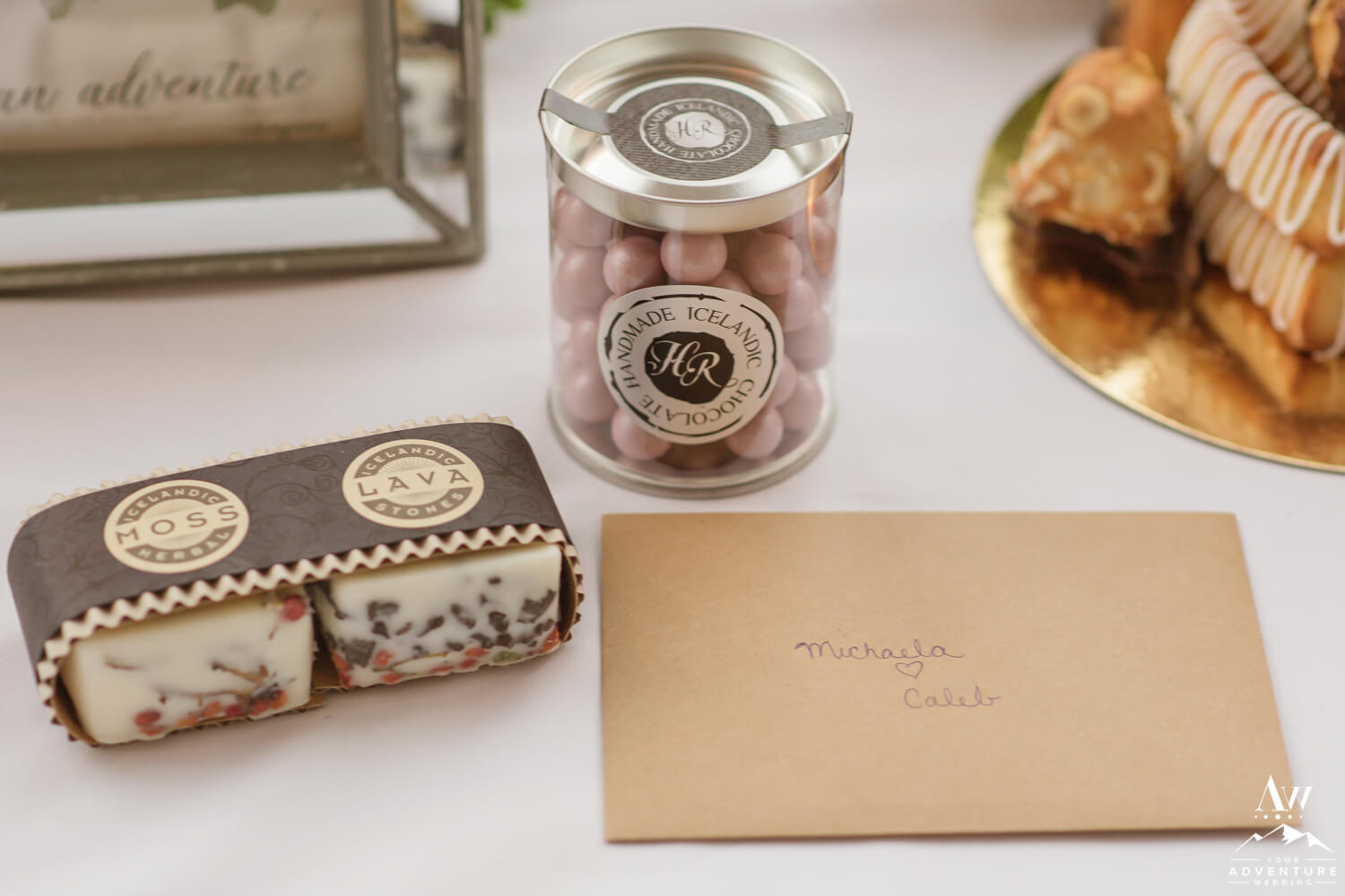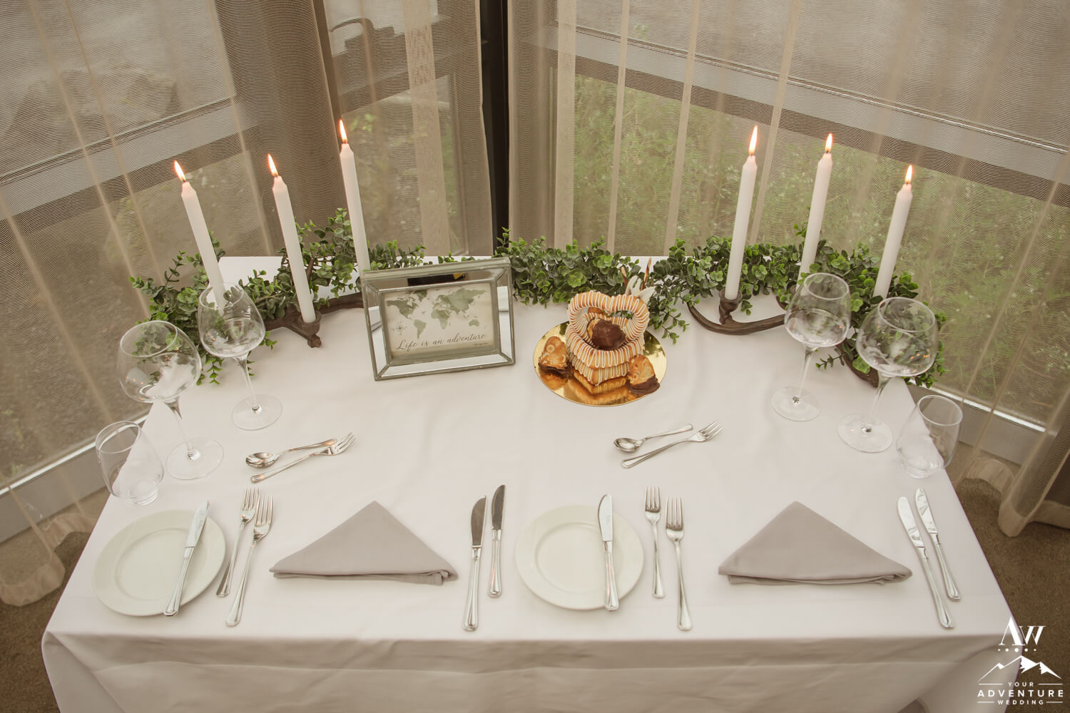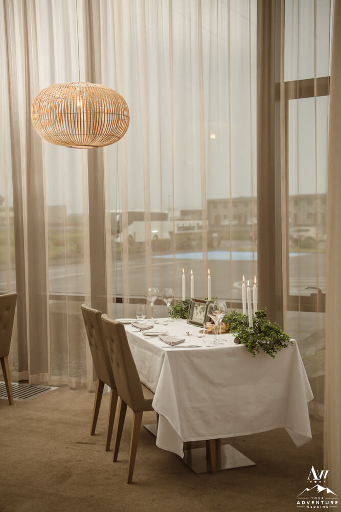 Once the elopement expedition concluded, these two newlyweds had time to rest and refresh! Awaiting them that evening was a simply styled elopement reception table inside The Berg restaurant (compliments of our Iceland Wedding Planner team). Just because you are eloping, does not mean you can’t partake in local tradition of having a kransakaka! It’s okay to have leftovers 😉 Hello midnight snack!