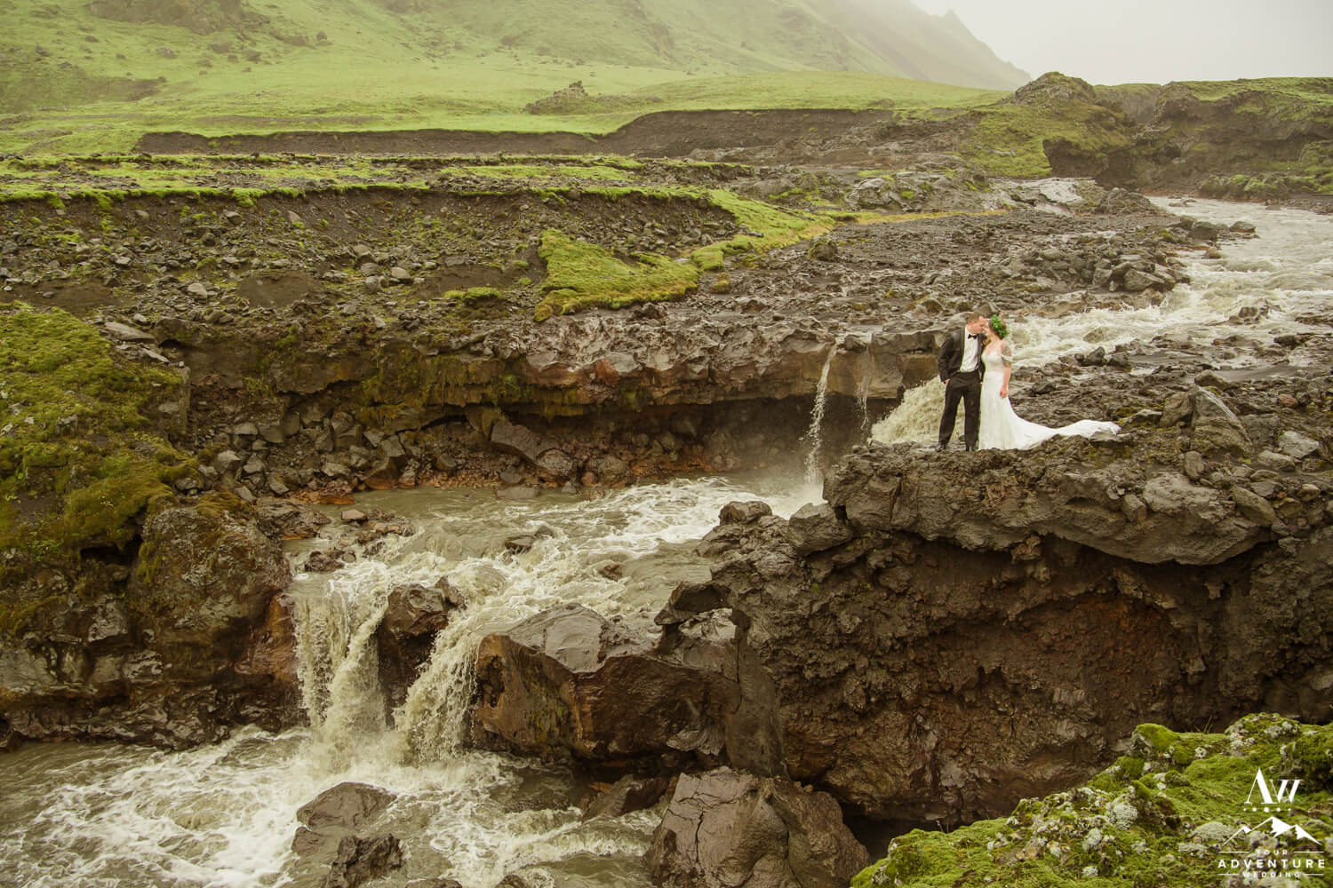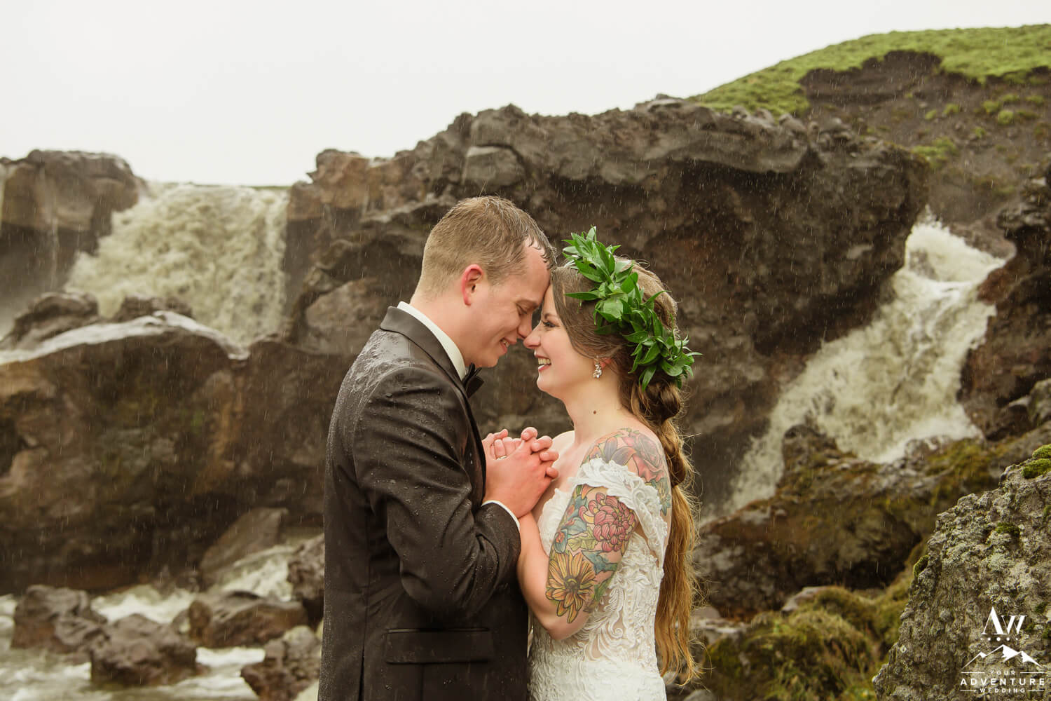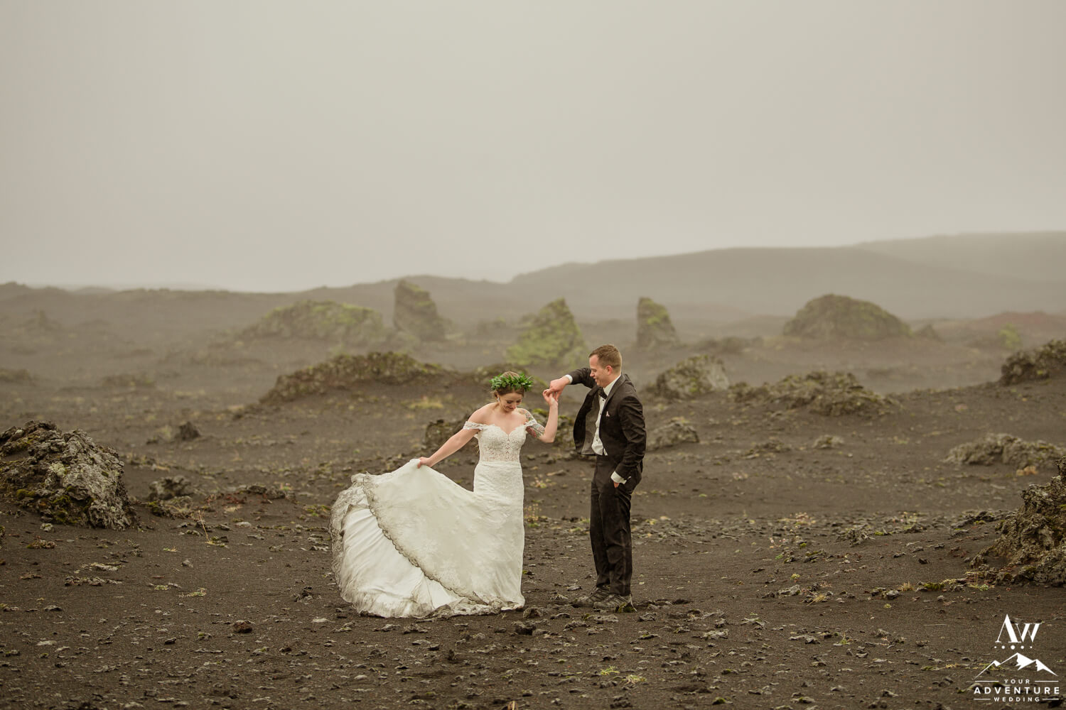Truly there is something freeing about running around in the rain with the one you love! Our fabulous groom would agree with that statement too… For example, he took every opportunity to grab his girl and give her a few spins around the lunar landscapes that line the highlands. And look at how EPIC these Iceland elopement photos are with the rain, it looks so DREAMY!!