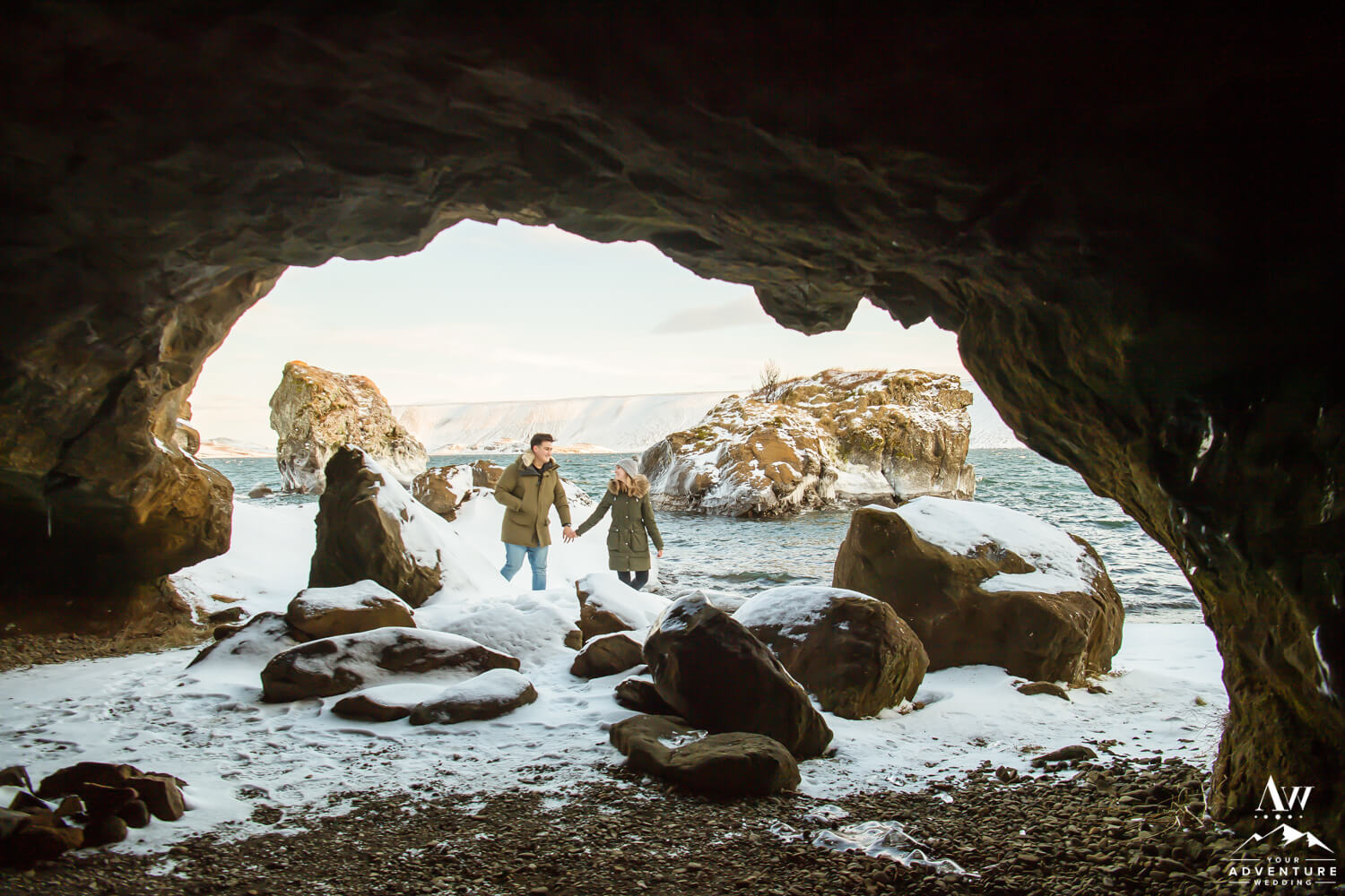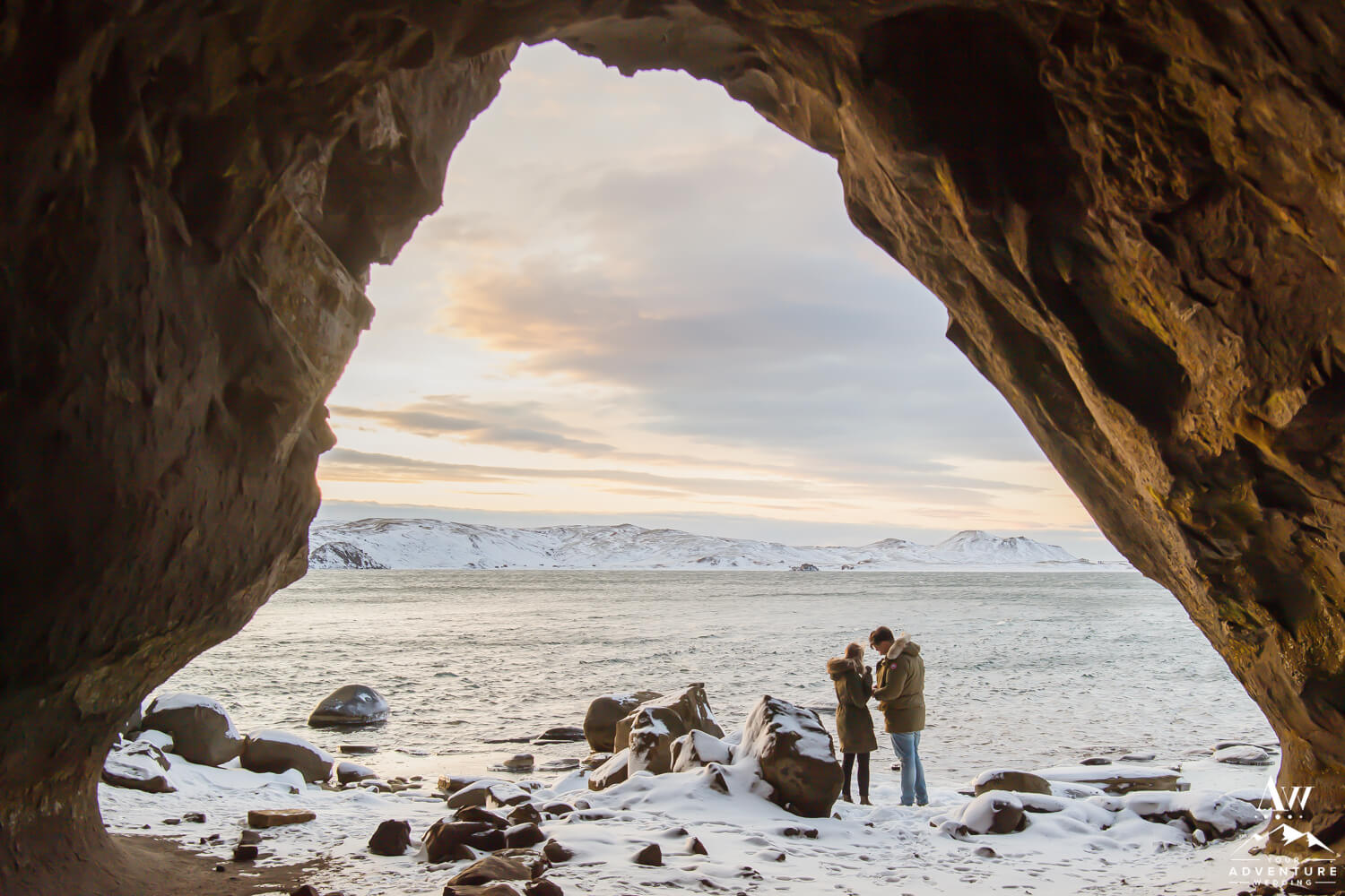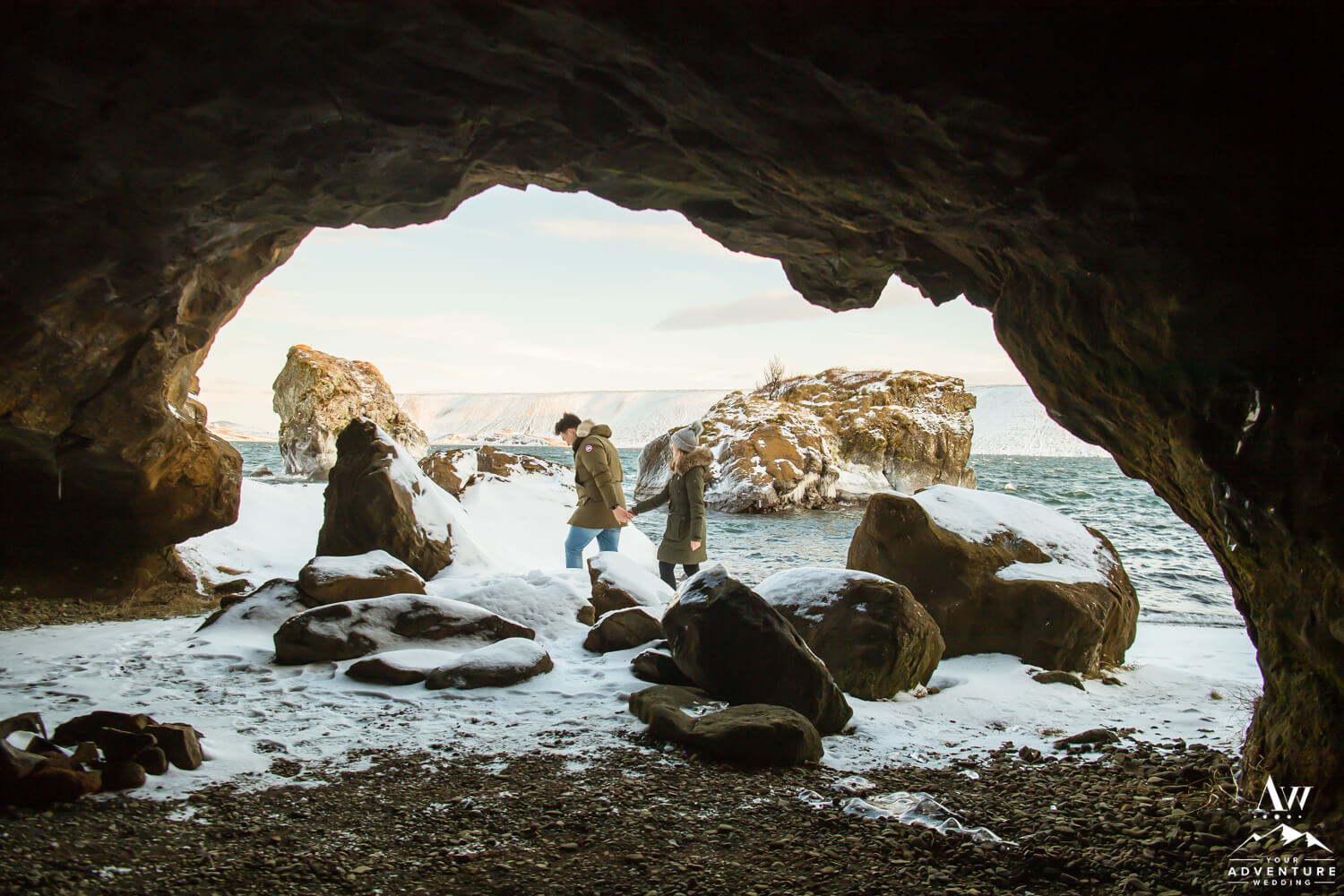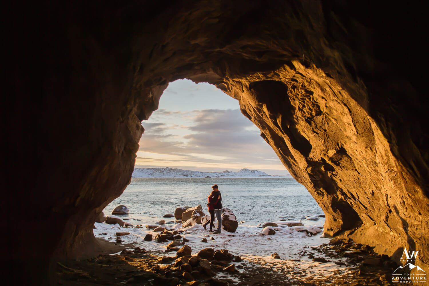 Let’s get back to Matthew and Anita! These two met our talent Iceland proposal photographer under the impression they were getting an offbeat tour experience. However, after hiking and arriving to the cave that December afternoon, the photographer asked if she could have Matthew’s phone to take a photo for them to remember because the light was so nice. While she was telling direction, she switched to her professional camera and Matthew got down on one knee!