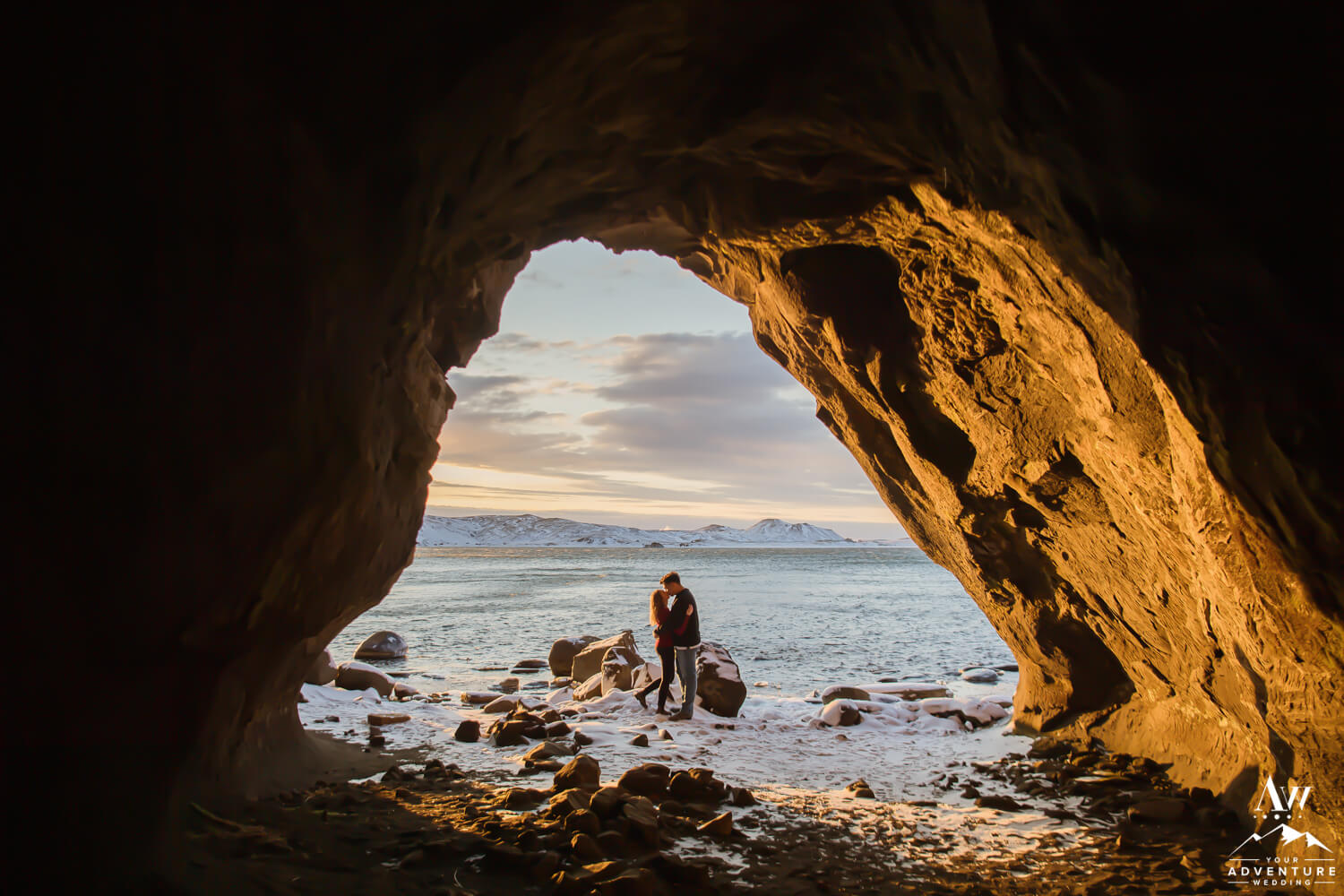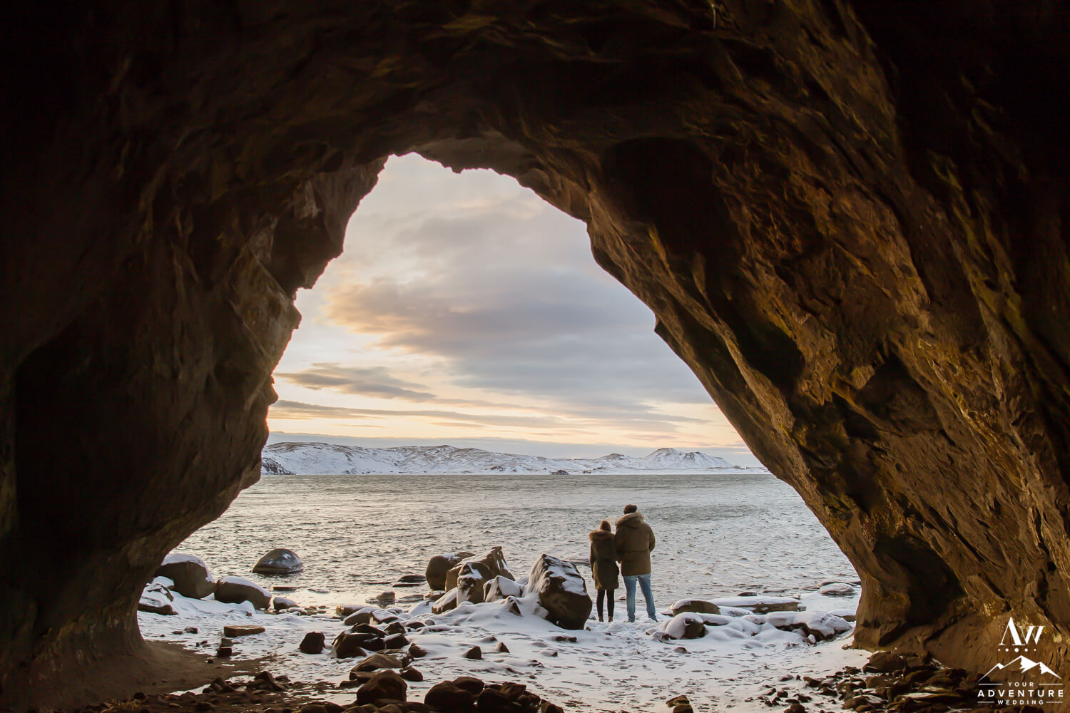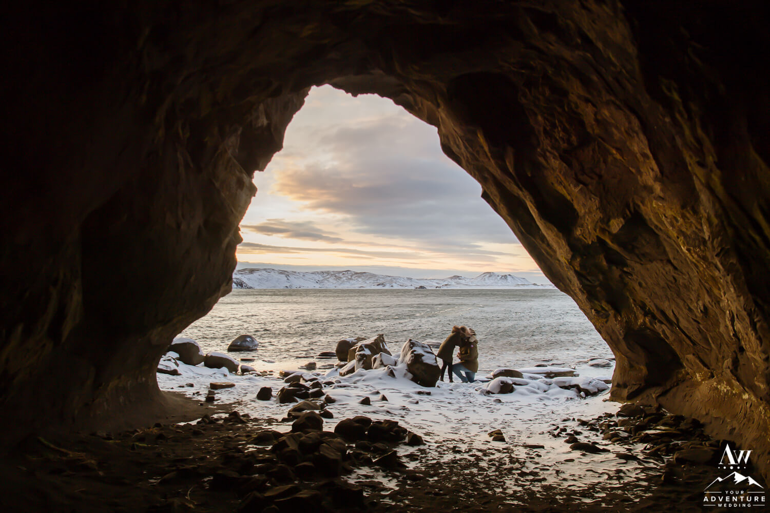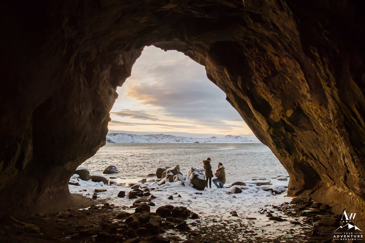 Let’s get back to Matthew and Anita!  These two met our talent Iceland proposal photographer under the impression they were getting an offbeat tour experience.  However, after hiking and arriving to the cave that December afternoon, the photographer asked if she could have Matthew’s phone to take a photo for them to remember because the light was so nice.  While she was telling direction, she switched to her professional camera and Matthew got down on one knee!