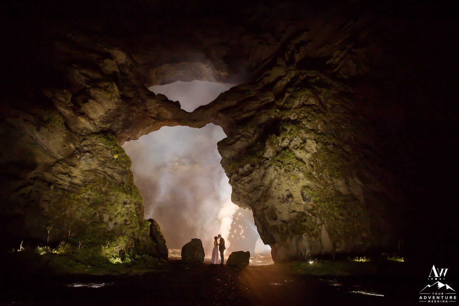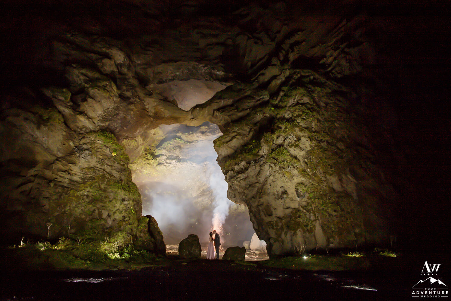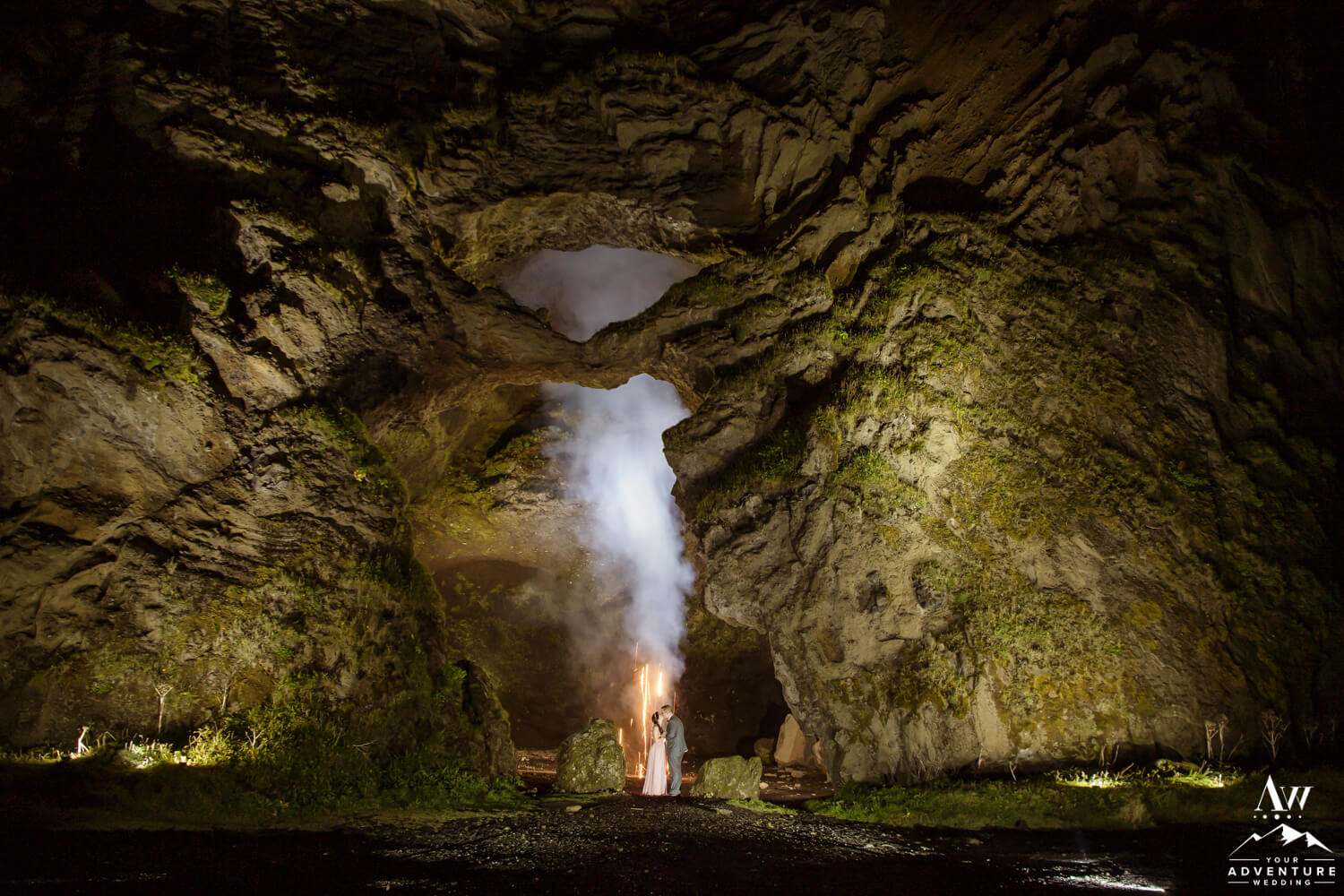 Firm believers in coming full circle for the day, our Iceland elopement photographers always offer a nighttime shoot. Whether it is simple or elaborate we love creating something special to end the night (as long as our couples still have energy!)! Since there were no Northern Lights coming out to play that September evening, we crafted something special in a cave for these two to end the night literally and figuratively with a BANG!
