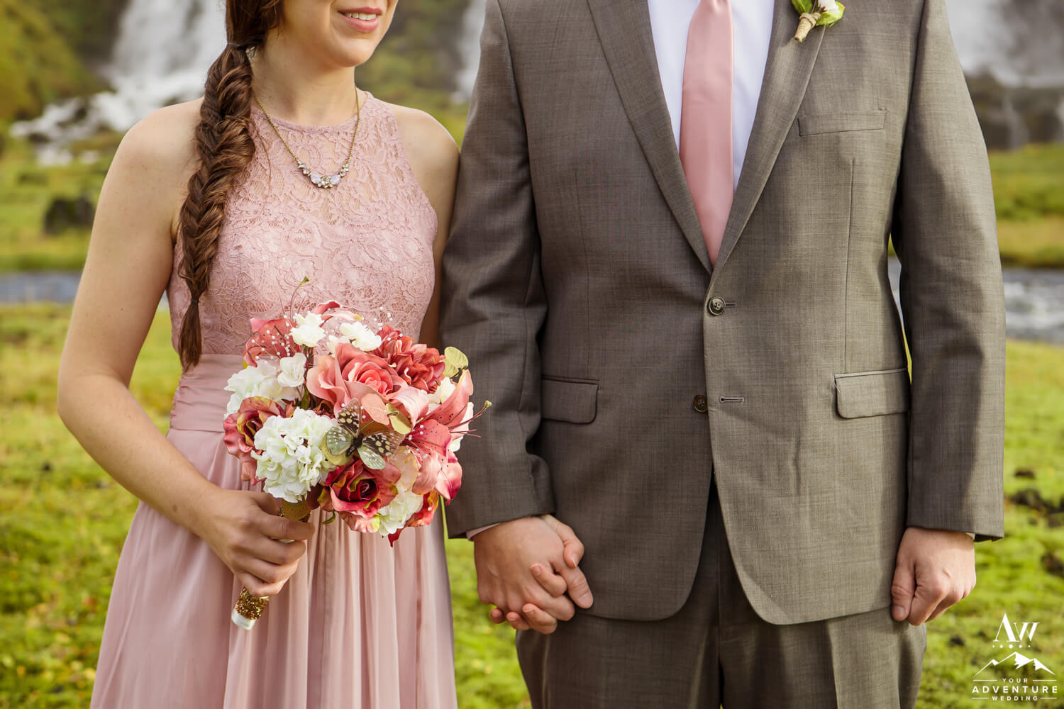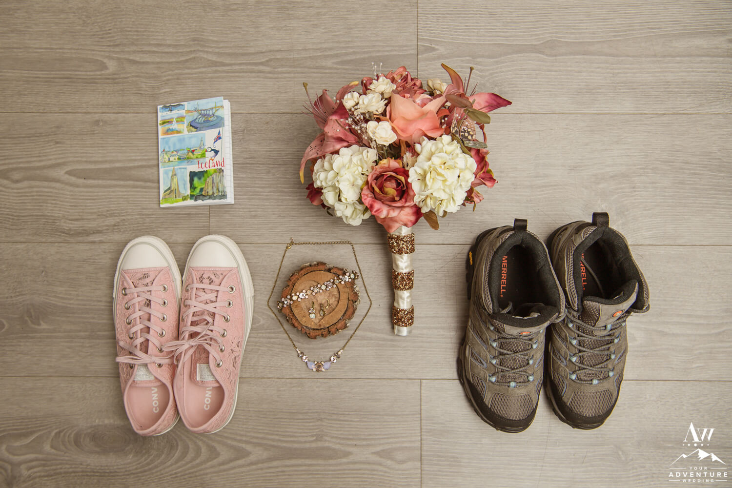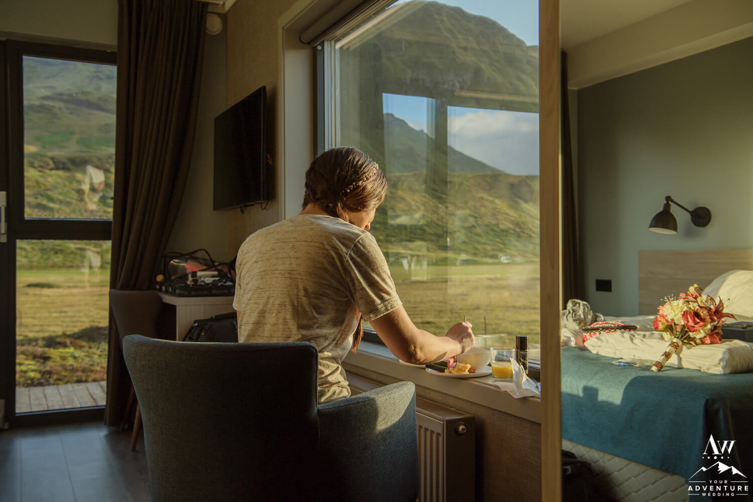 Scott and Coral’s adventurous elopement began before sunrise at Hotel Kria in Vik. Our teams hair, makeup and photographer all went to work! Totally love that Coral went against tradition and chose a wedding dress that was colorful and oh-so HER! On that same note, we love that Scott’s groom details incorporated pink too! Getting ready together creates a super warm vibe as you begin your adventure together.