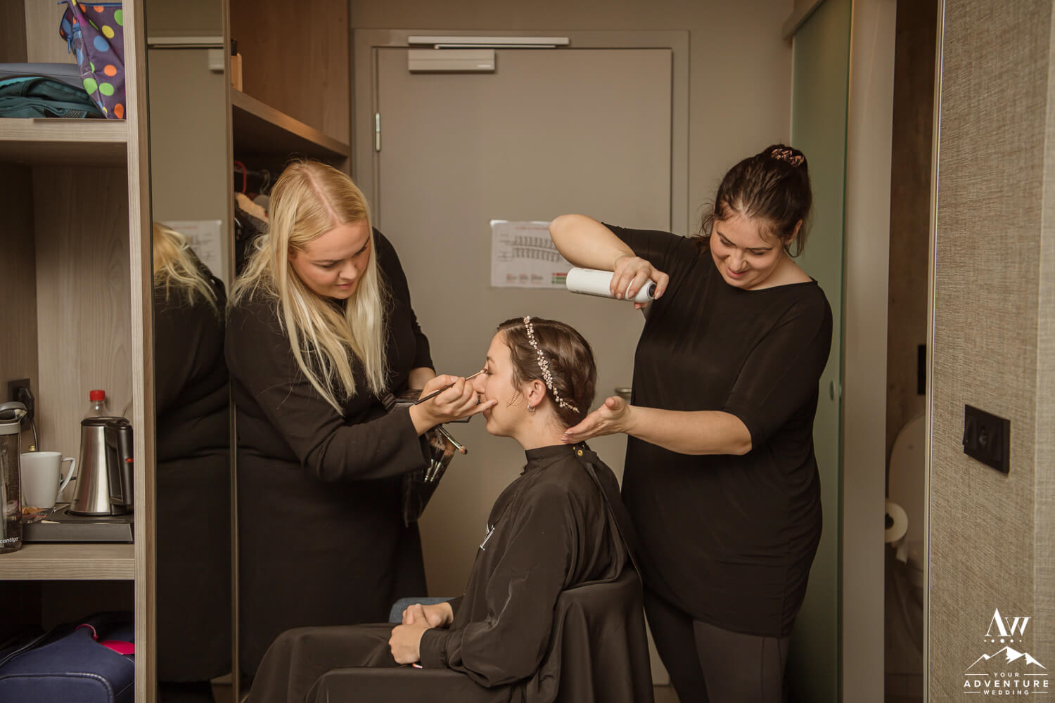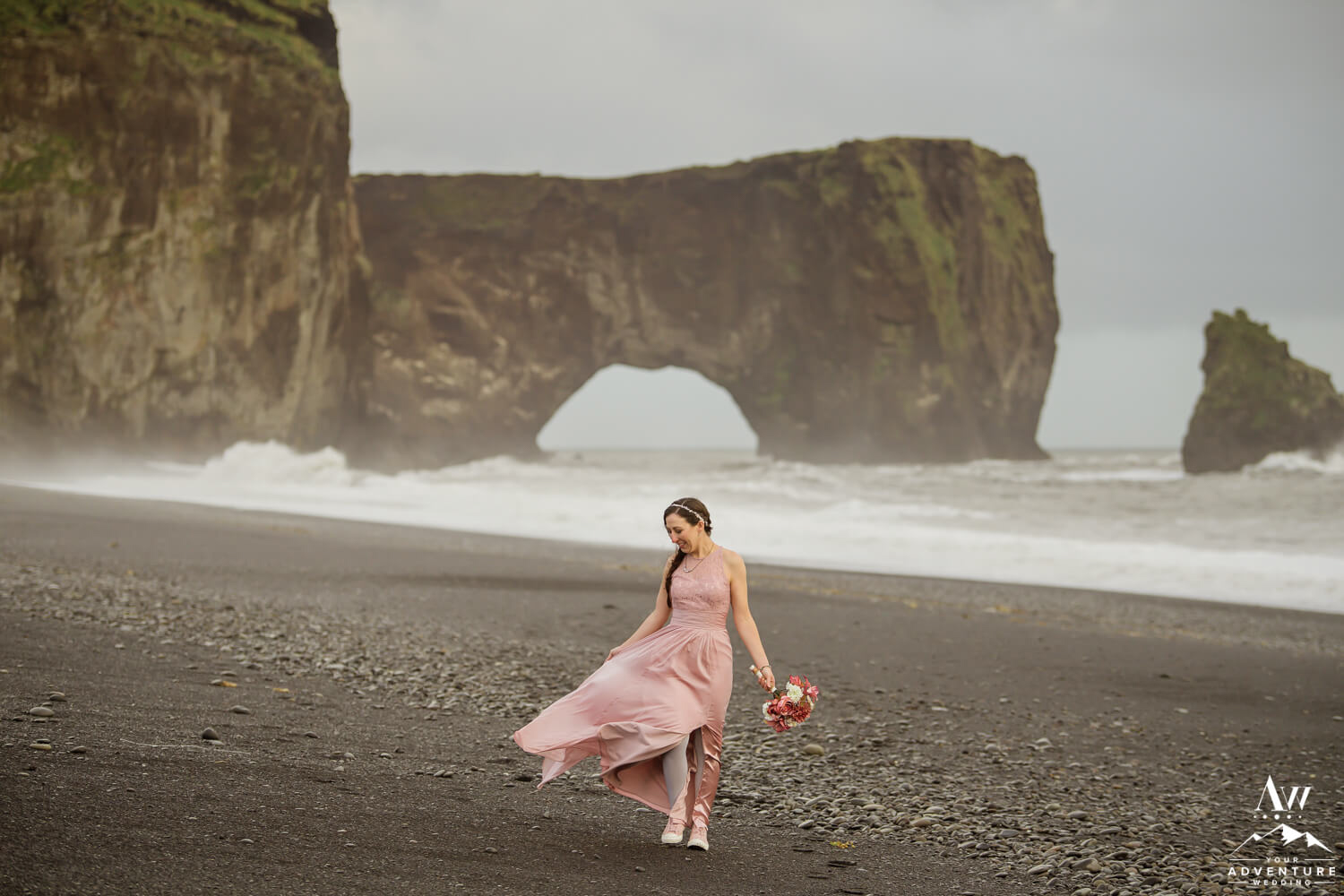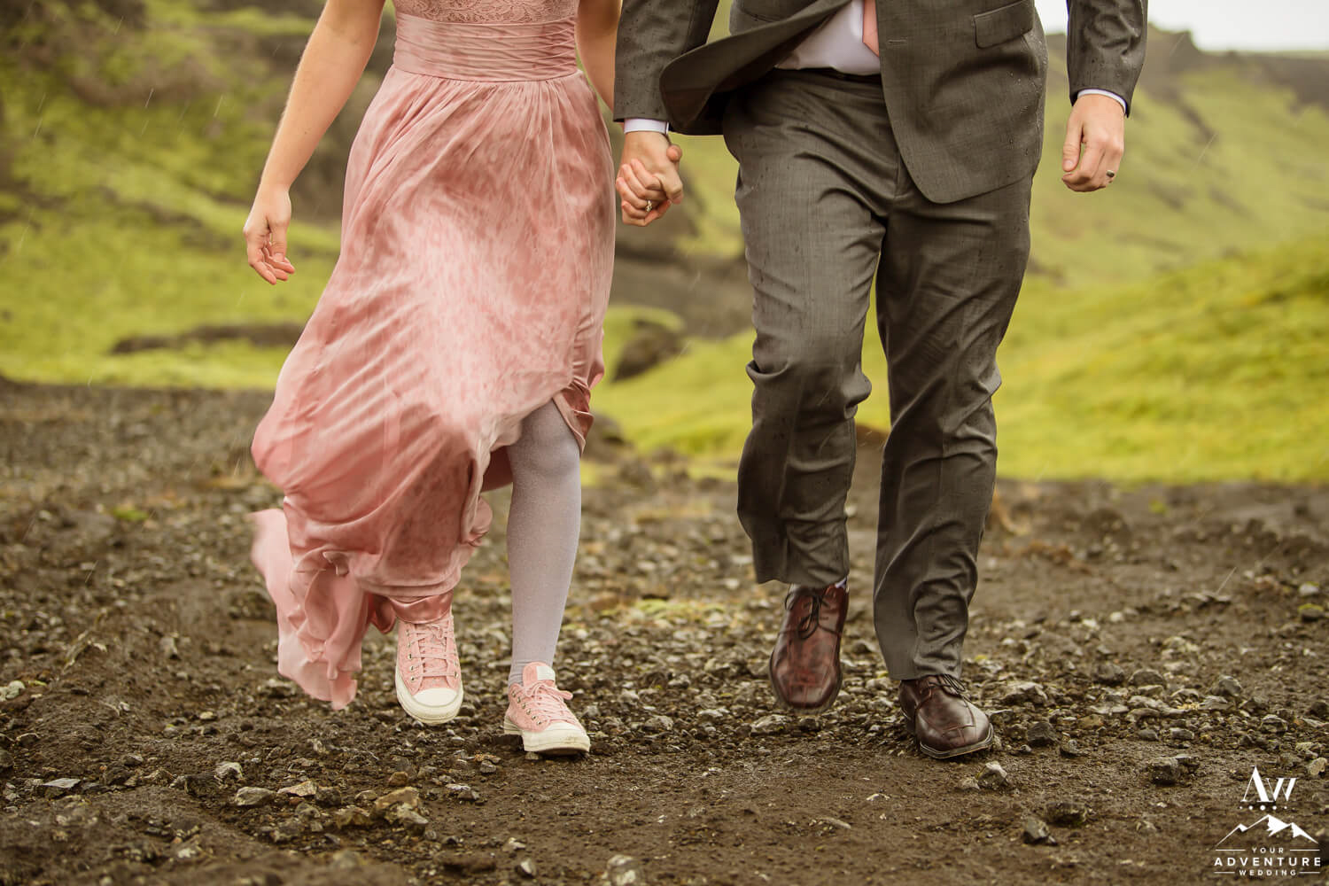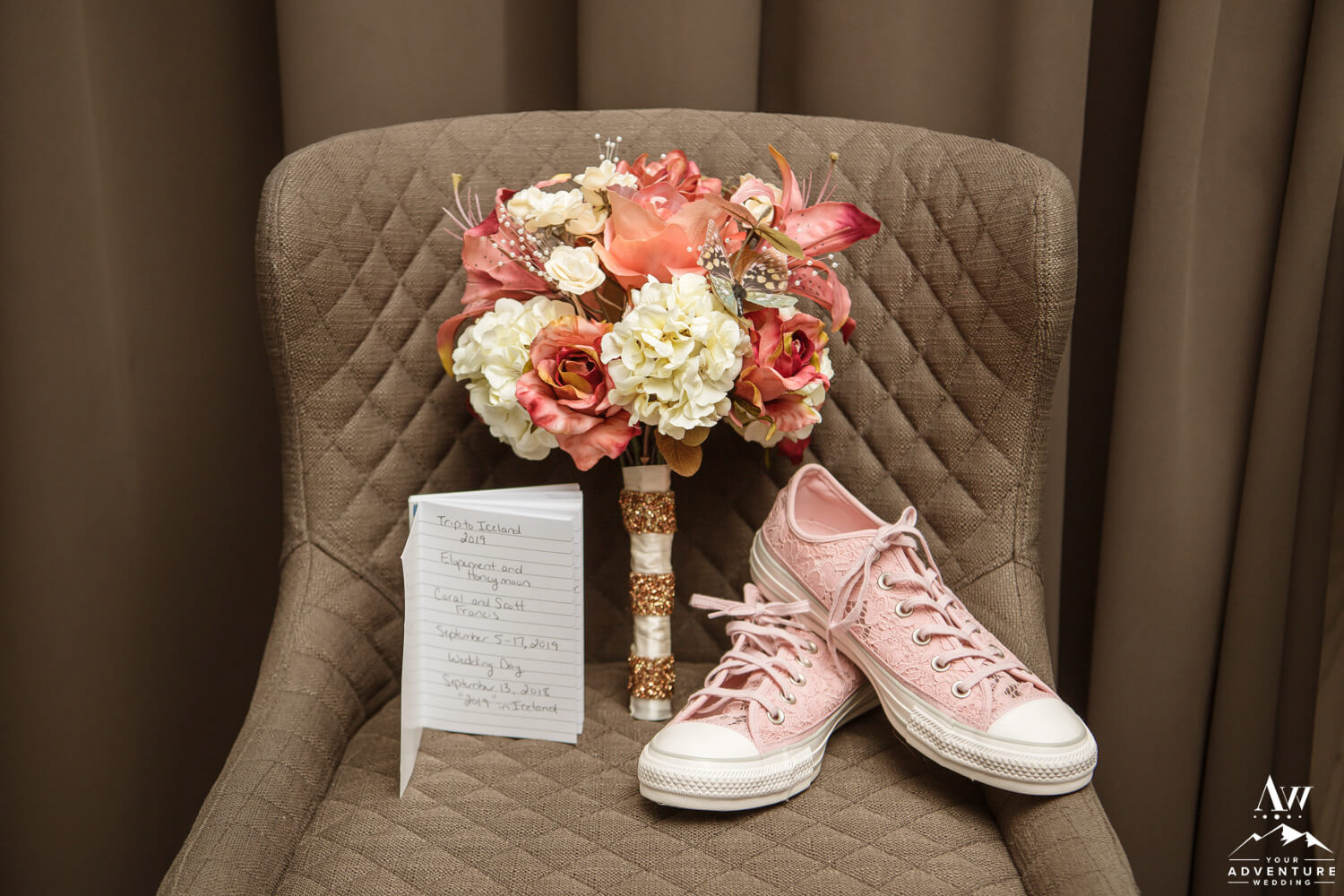 Scott and Coral’s adventurous elopement began before sunrise at Hotel Kria in Vik. Our teams hair, makeup and photographer all went to work! Totally love that Coral went against tradition and chose a wedding dress that was colorful and oh-so HER! On that same note, we love that Scott’s groom details incorporated pink too! Getting ready together creates a super warm vibe as you begin your adventure together.