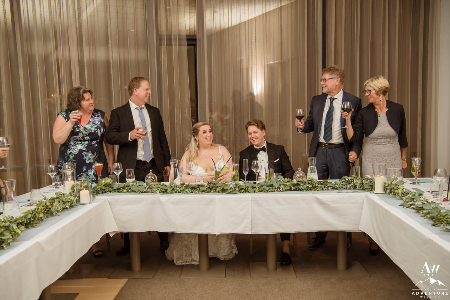 Following their 10 hour adventure day, the group had a chance to rest, power nap, hot showers, etc to then meet again for a Iceland wedding reception dinner. The Berg in Vik played host to such a lovely occasion. There they delighted in all sort of delicious local cuisine and even finished the night with a beautiful and delicious traditional Iceland wedding cake!