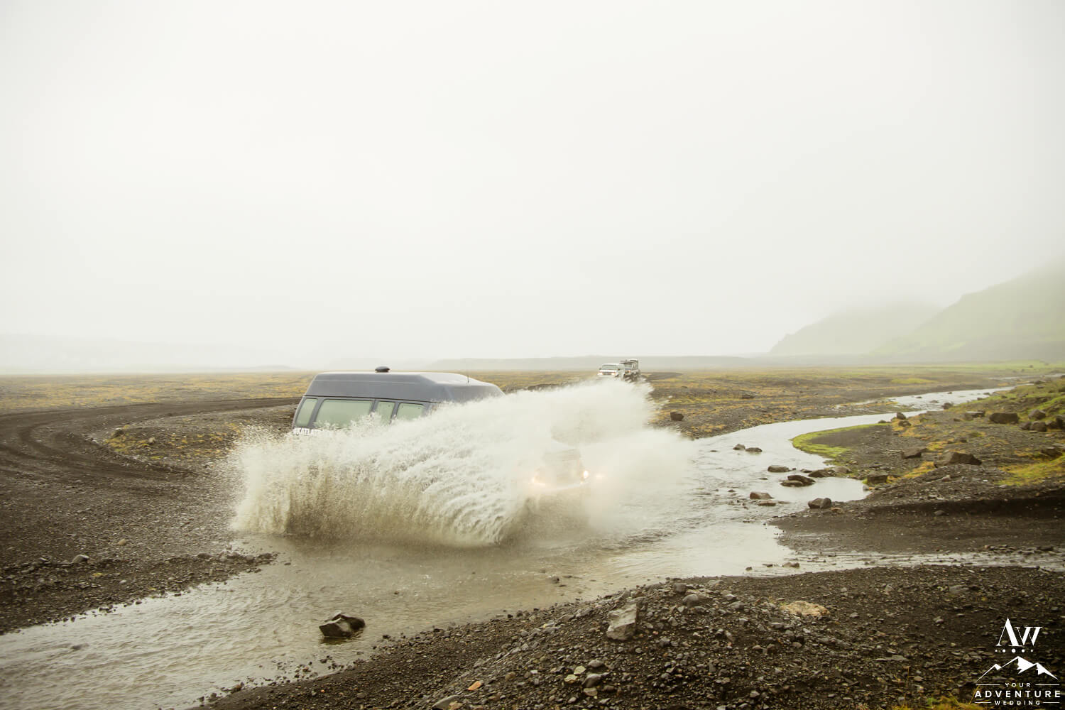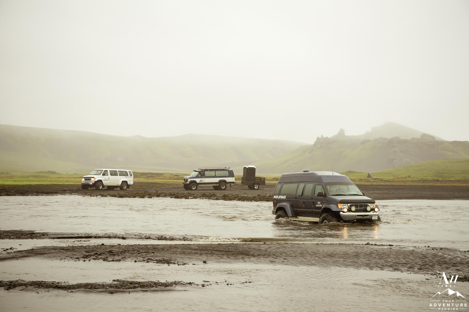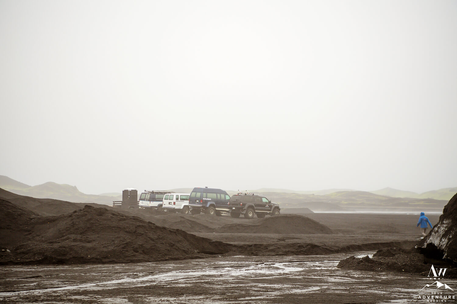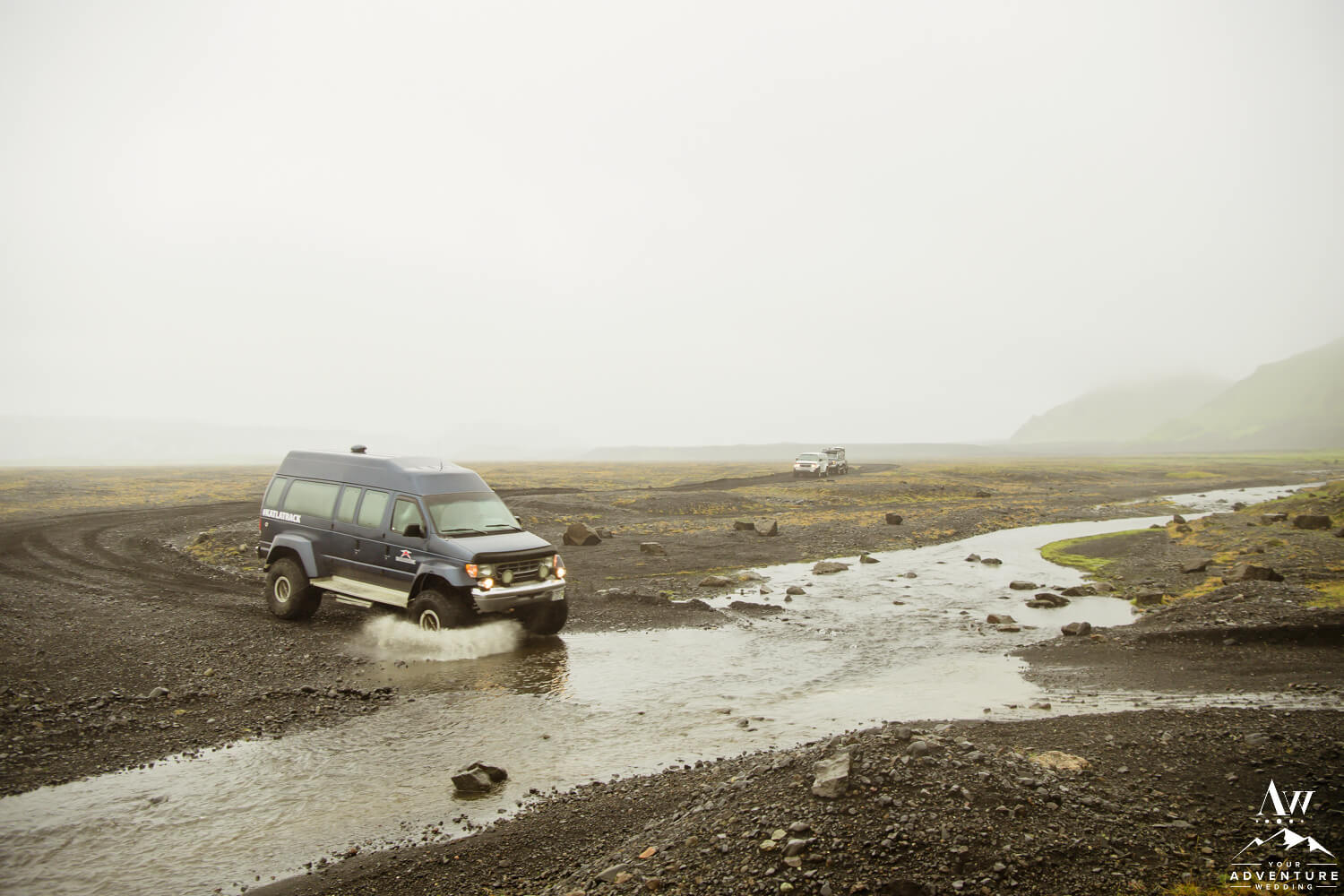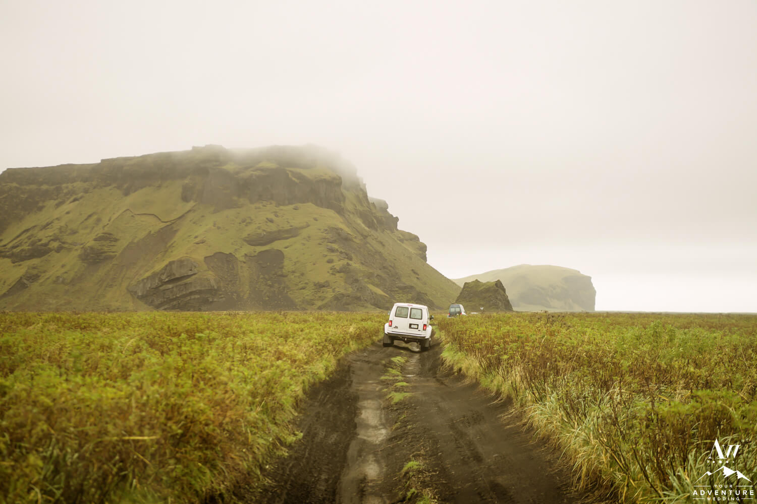 As we alluded to above, visiting a sub-glacial volcano area can fill you full of fear. On the other hand, heading into our offbeat side of the glacier our Iceland Wedding Planner team goes into is nothing but fun! Which means we venture down a private property road, wisk by crazy shaped mountains along the black sands, and even cross a river or two!