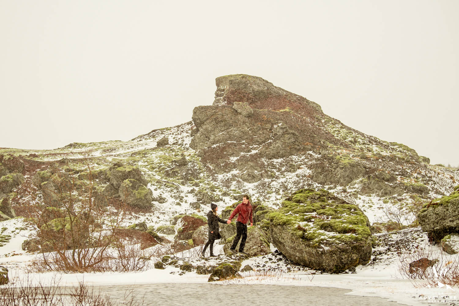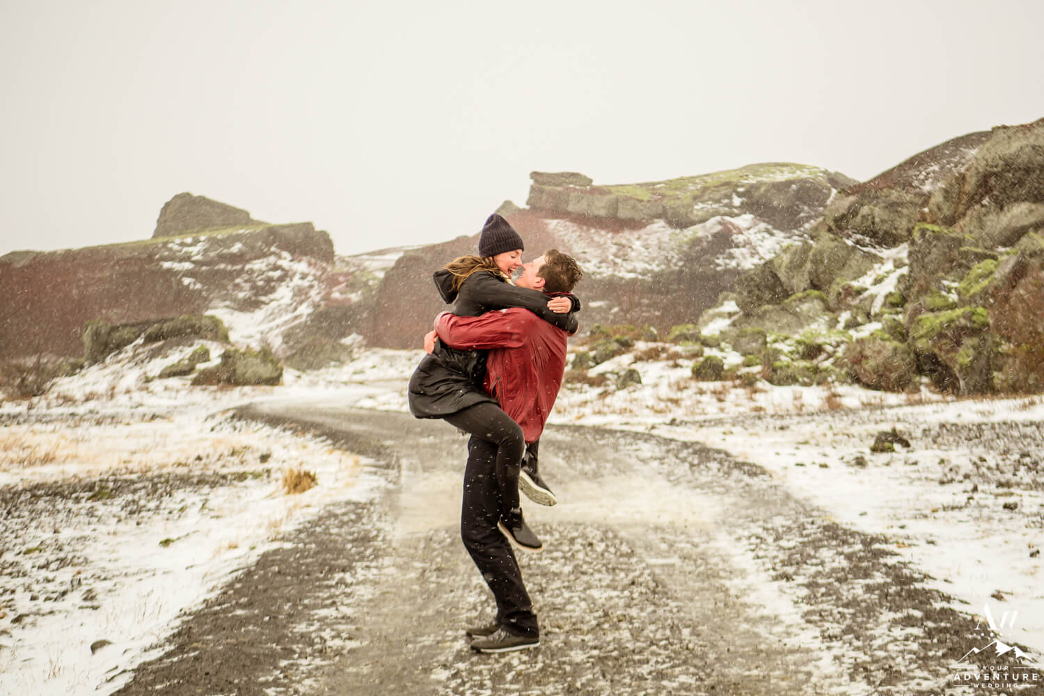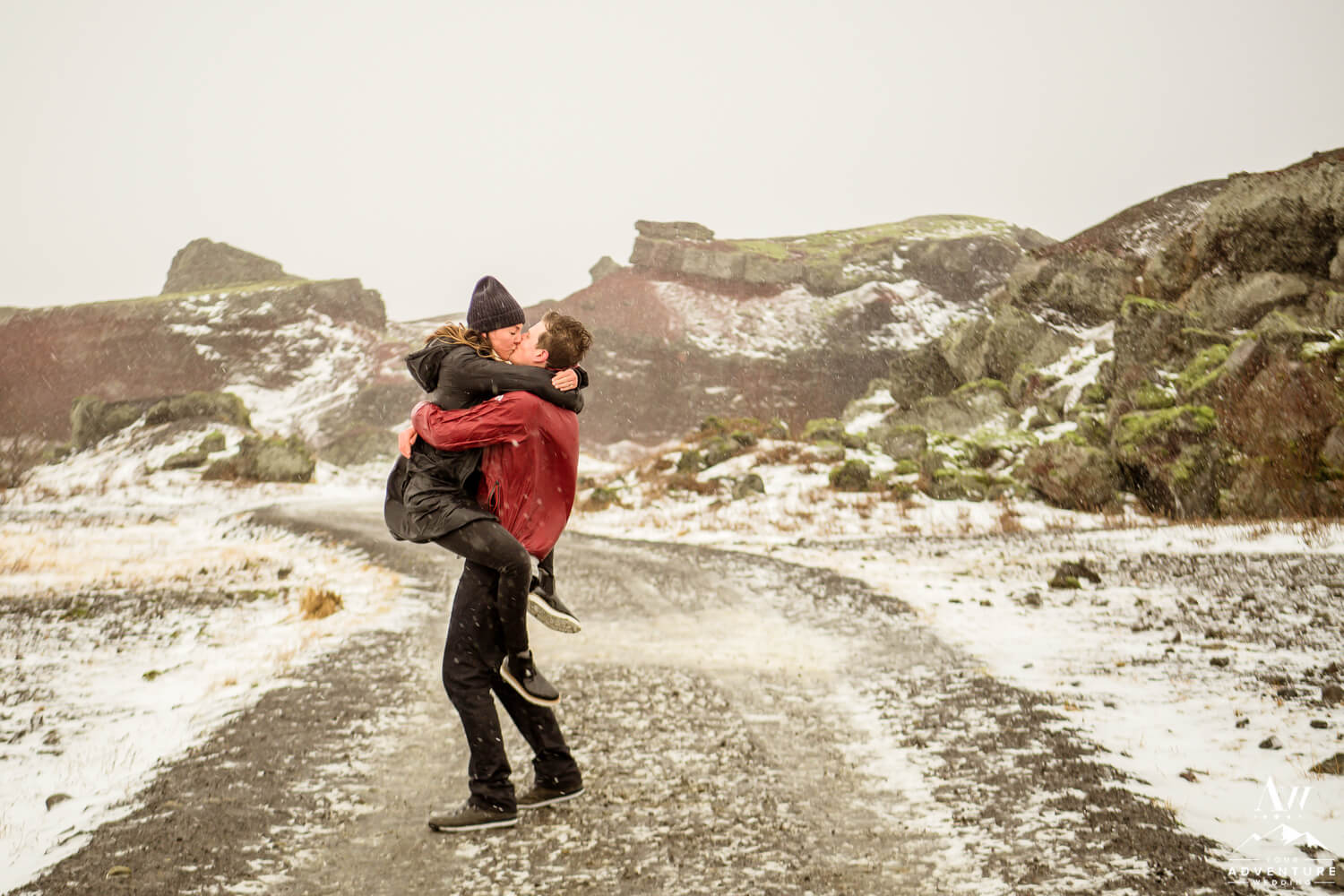 The weather in Iceland didn’t bother these two one bit! They seemed to just play harder as the mix of rain and snow fell. To illustrate, Michael and Sara are both adventurous and are truly at their happiest while taking in incredible scenery. So planning a day discovering offbeat areas with our team during their Heiðmörk marriage proposal photo session was right up their alley!