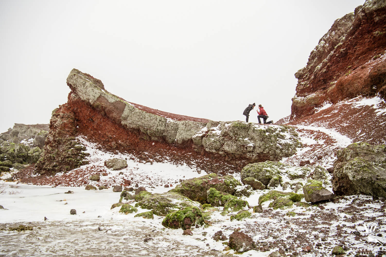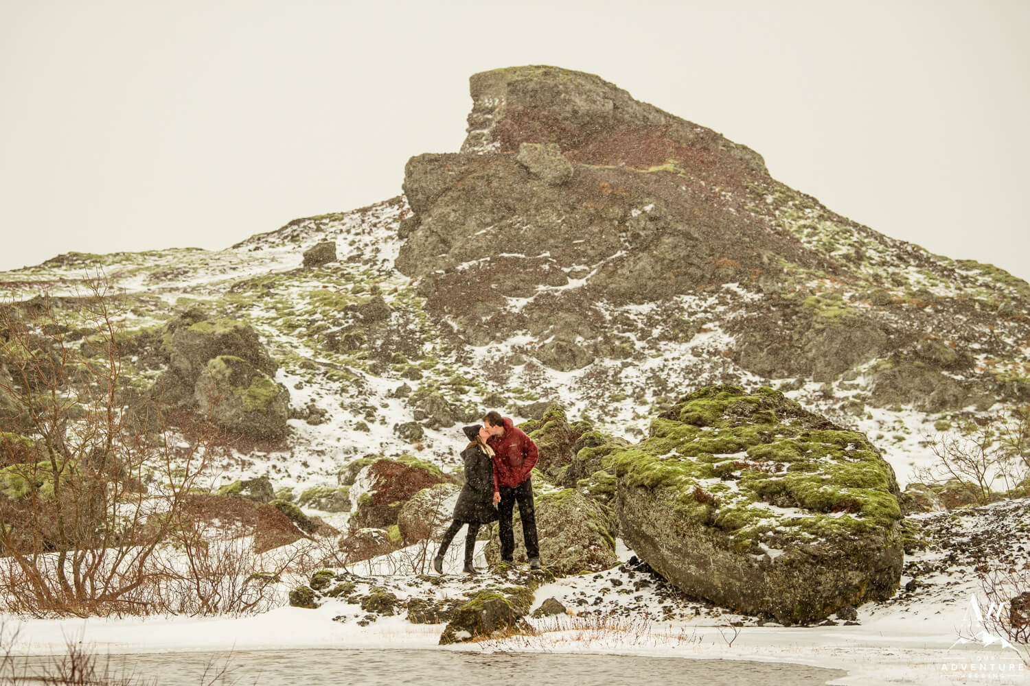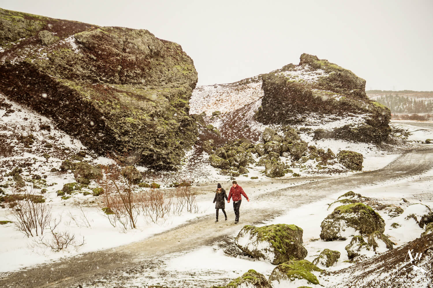 The weather in Iceland didn’t bother these two one bit! They seemed to just play harder as the mix of rain and snow fell. To illustrate, Michael and Sara are both adventurous and are truly at their happiest while taking in incredible scenery. So planning a day discovering offbeat areas with our team during their Heiðmörk marriage proposal photo session was right up their alley!
