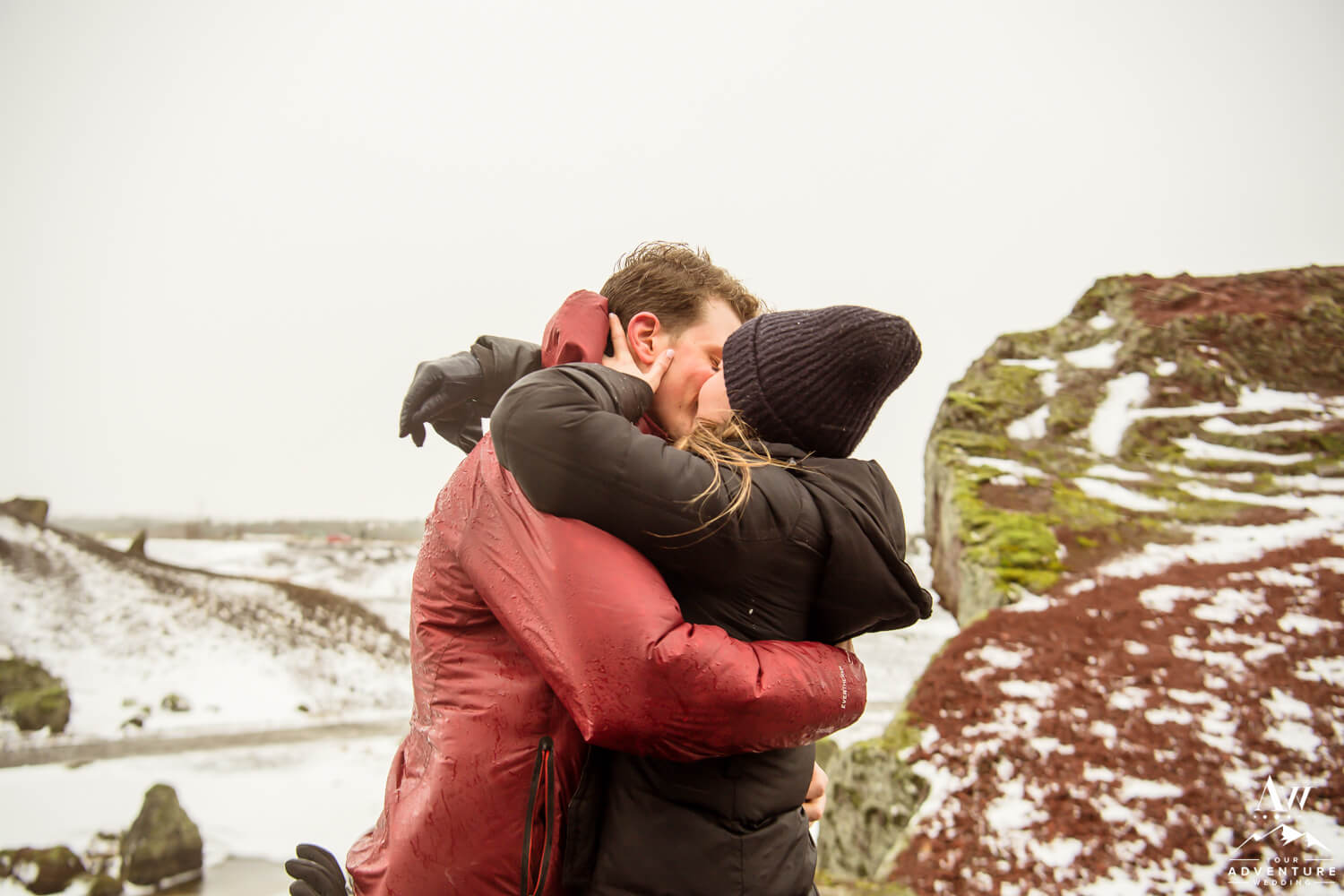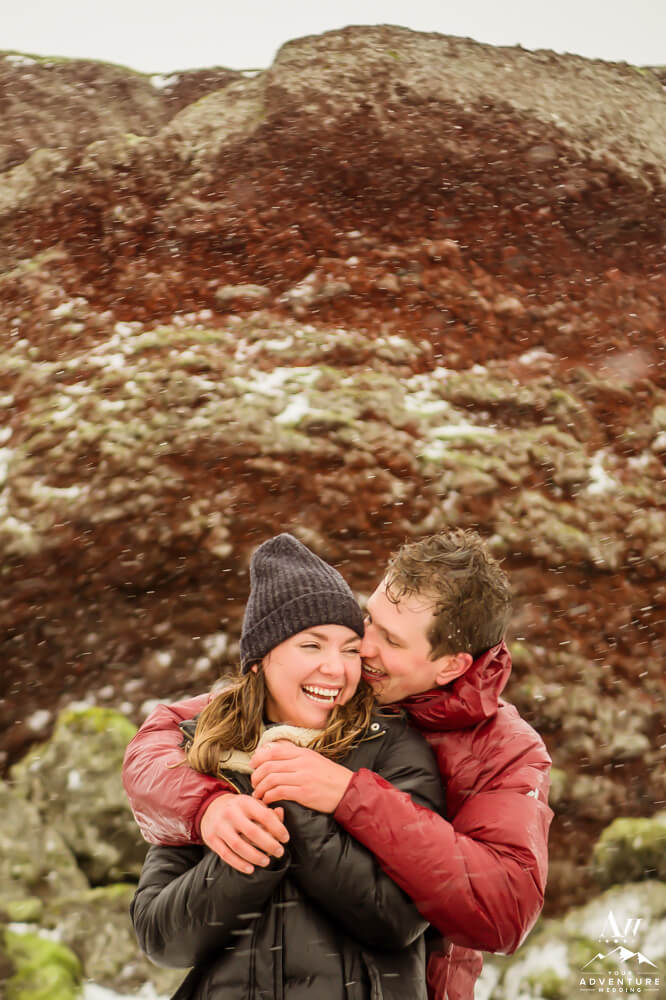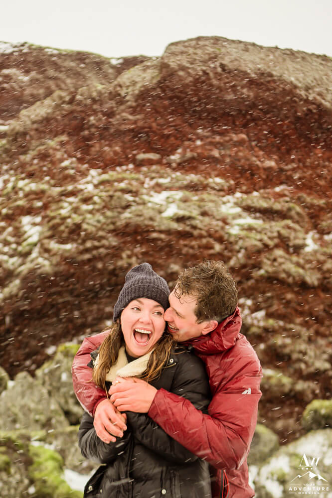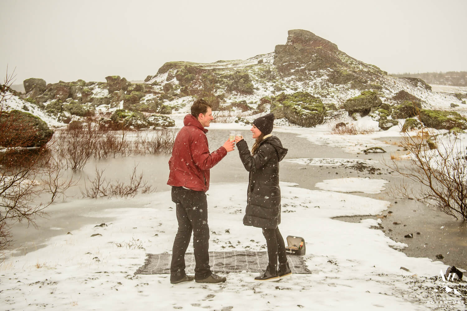 Endless laughs, cuddles, and connections followed every single step of the way, it was inspiring! A sweet little mini picnic awaited them in-between Iceland proposal photos and exploring the area. Fair to say they thoroughly enjoyed in the midst of the snowy conditions!