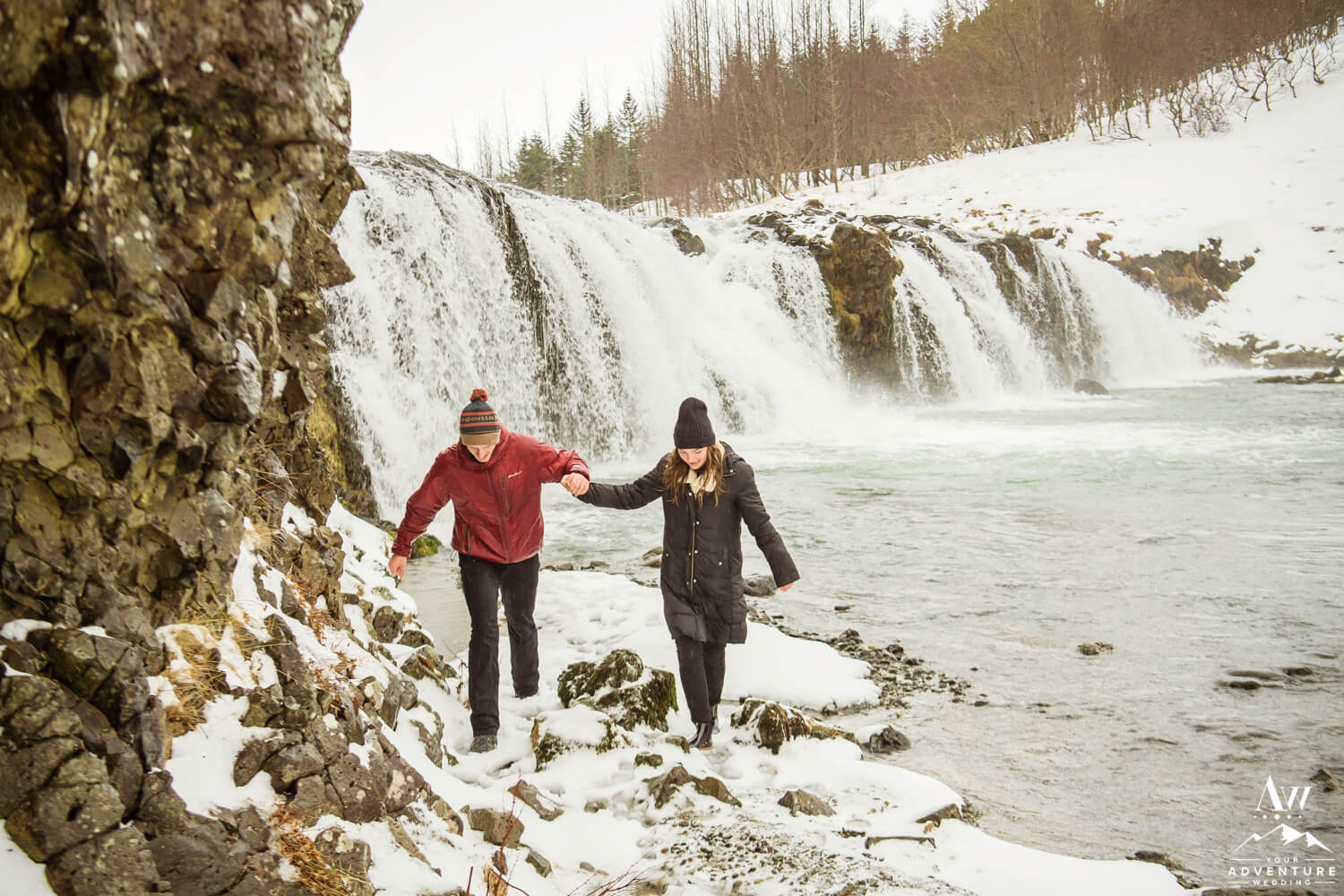 Next on the their Heiðmörk marriage proposal turned Iceland engagement session was discovering a sweet little waterfall! The super cool thing about this waterfall is that you can not only explore the base but also take a short trek to the top.