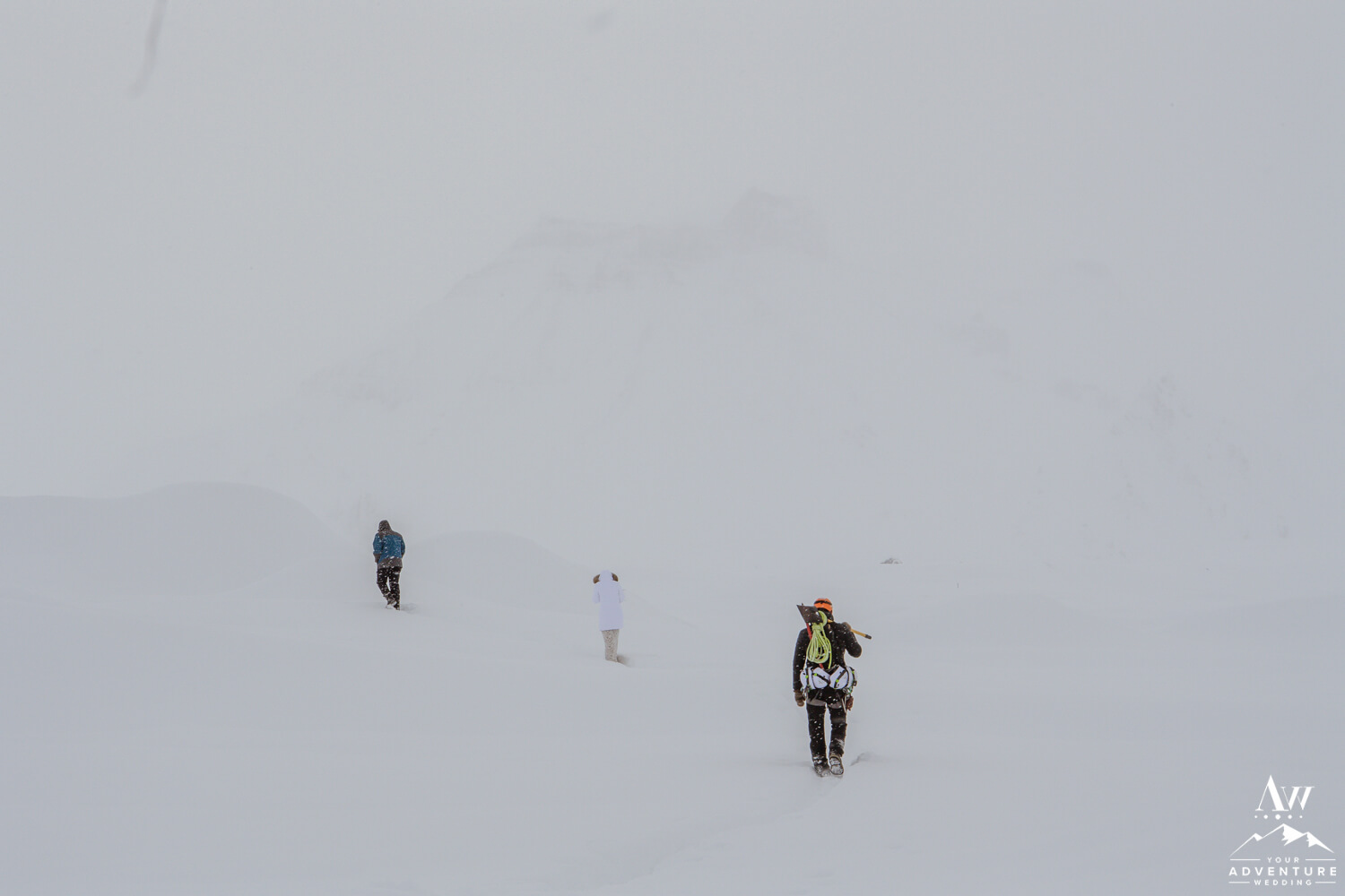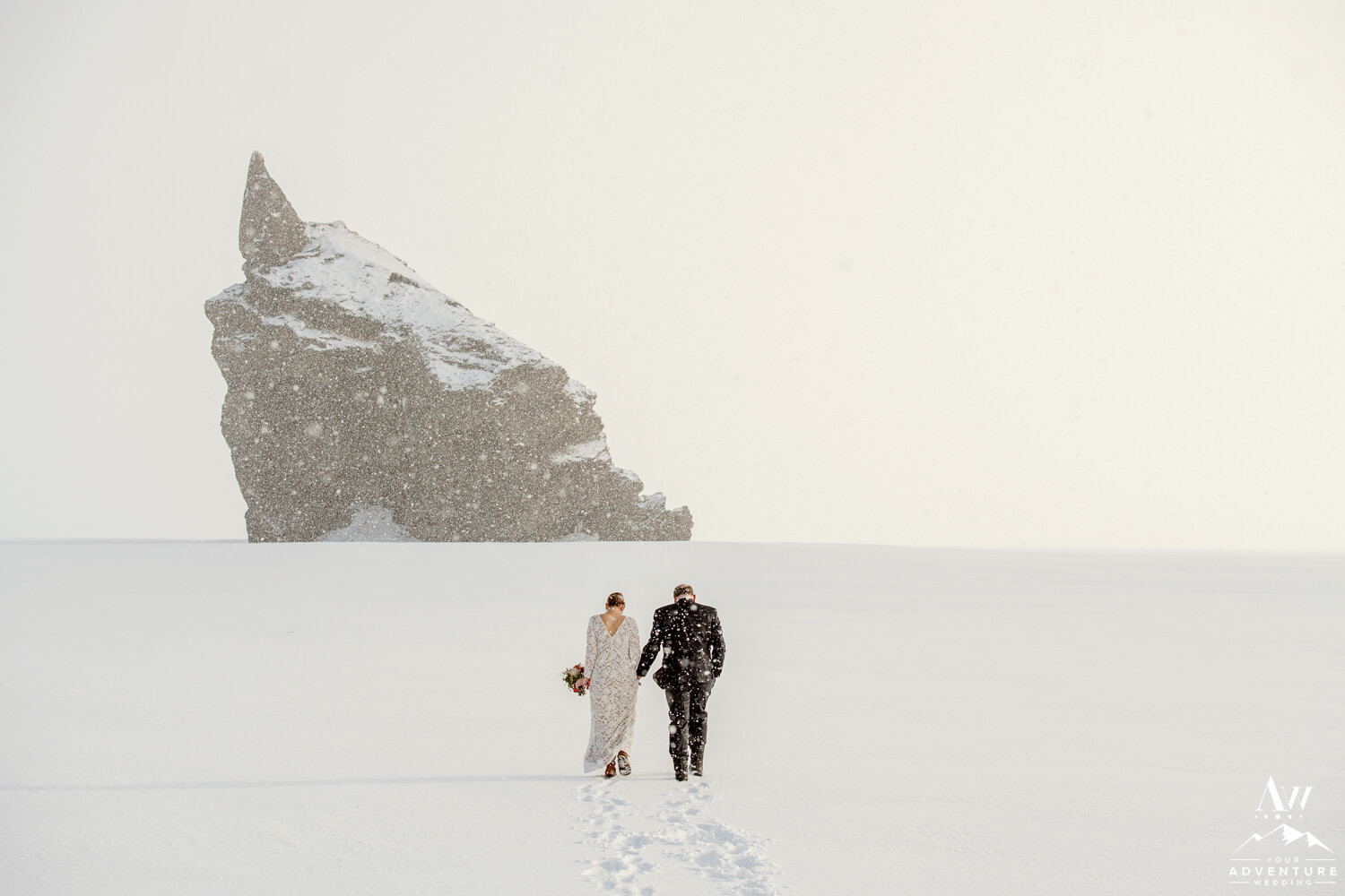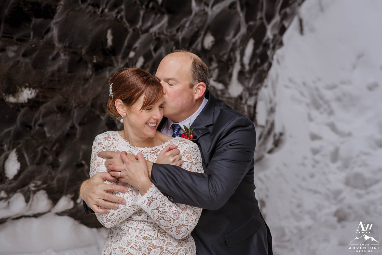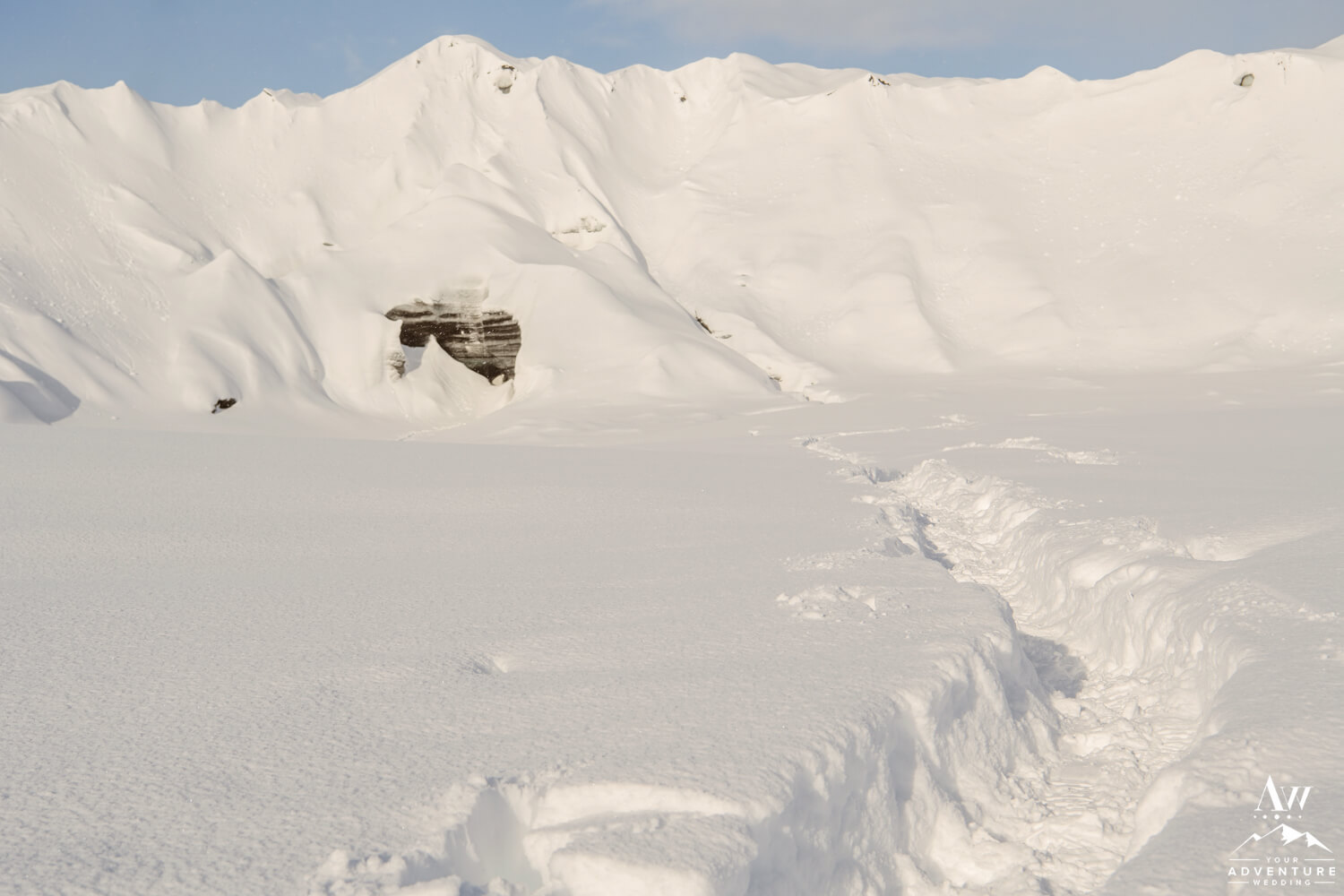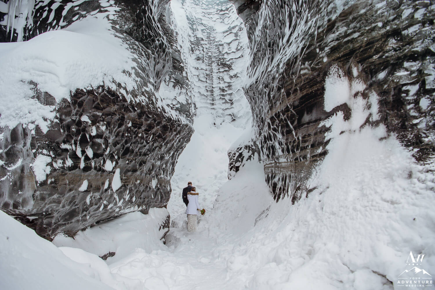 Meanwhile, hiking to your ceremony location is one of the most inspiring things we think you can do. Firstly, you all know we’re huge fans of hiking elopements! Secondly, hiking to a natural ice cave that is 100% private, zero tourists lurking about, and a path to get there created JUST FOR YOU two that morning is even more MAGICAL somehow. Thirdly, this icy elopement ceremony even had their own platform for the ceremony dug out moments before it began! Suddenly though during their exploration time in the ice cave blizzard conditions quickly came in adding more excitement!