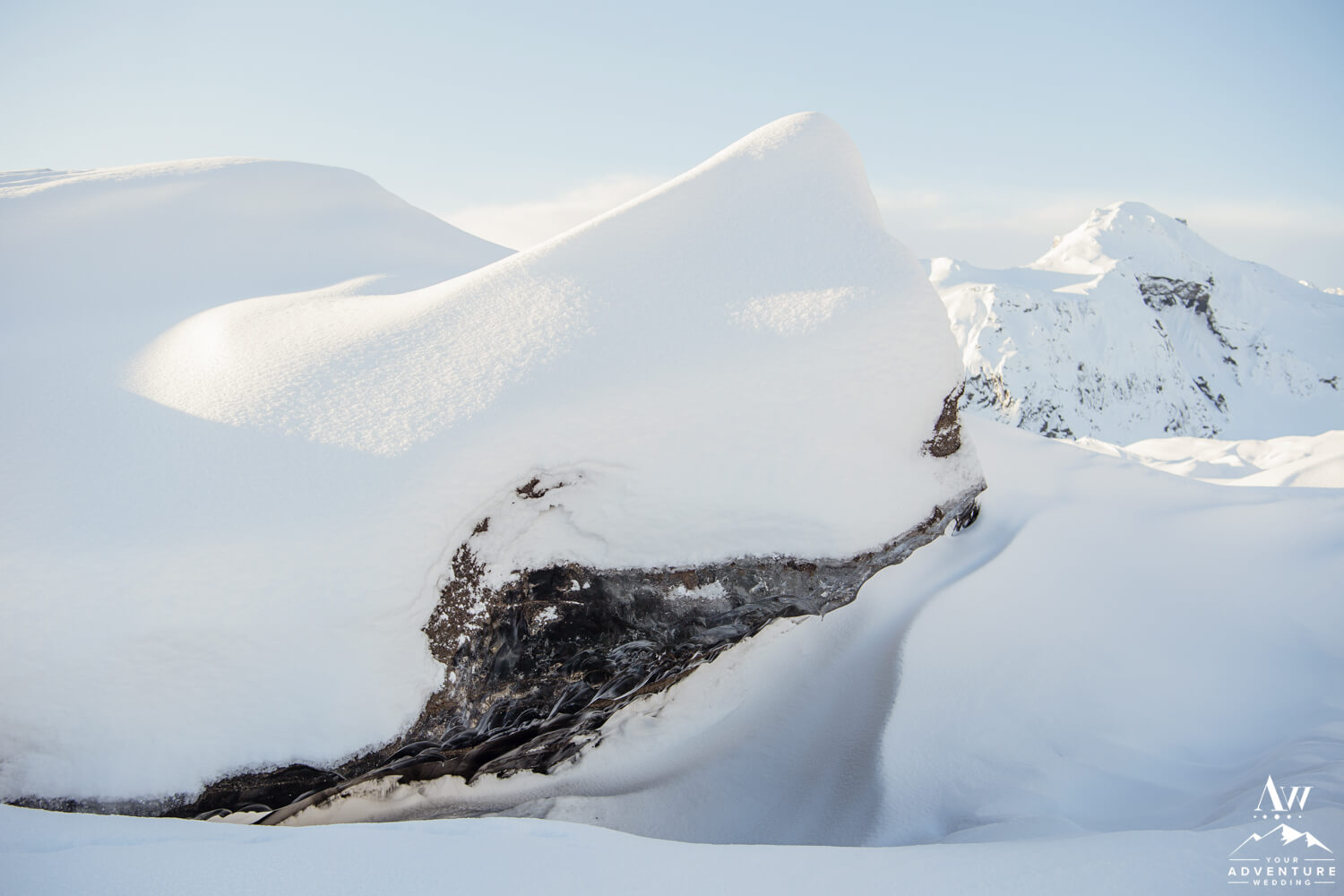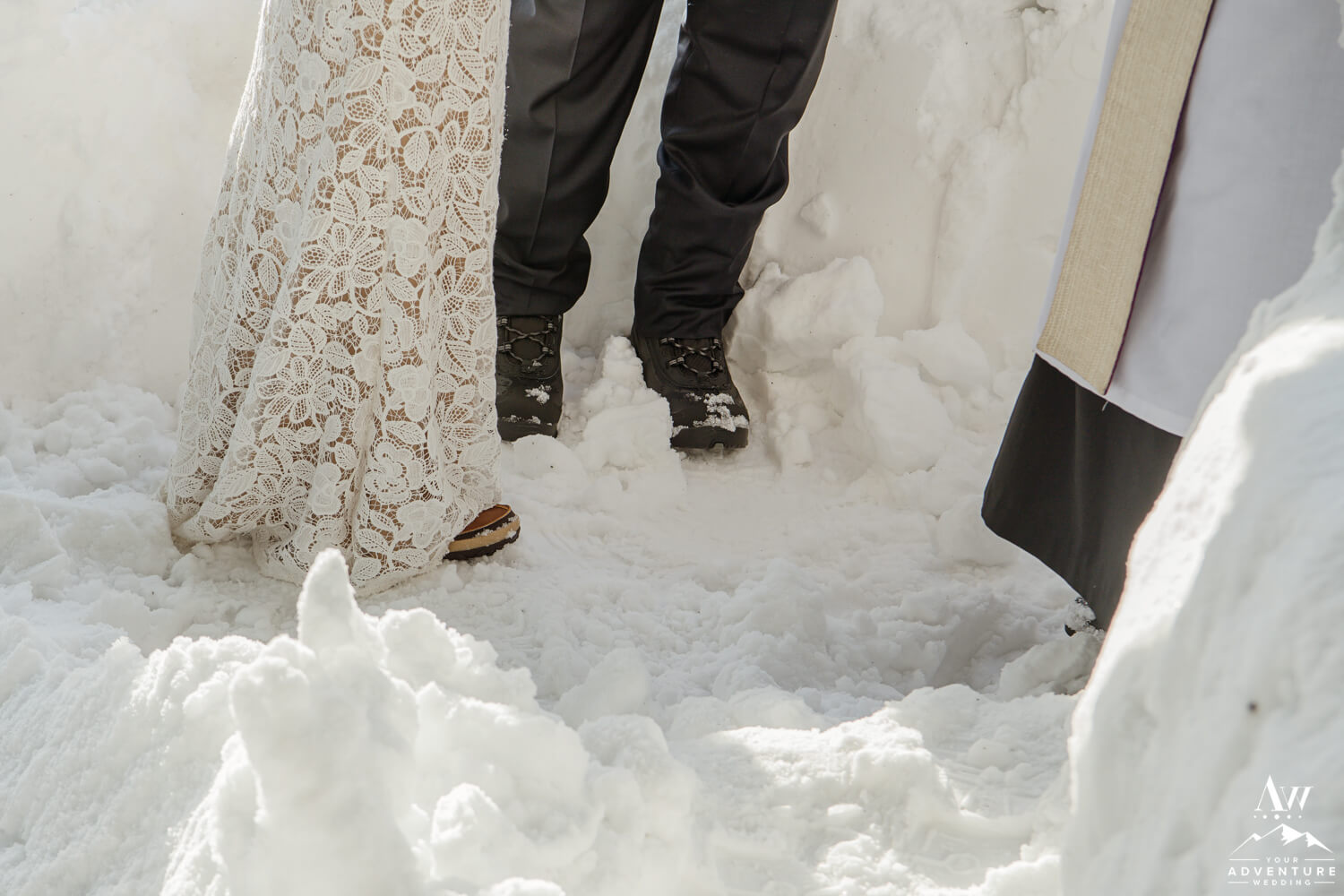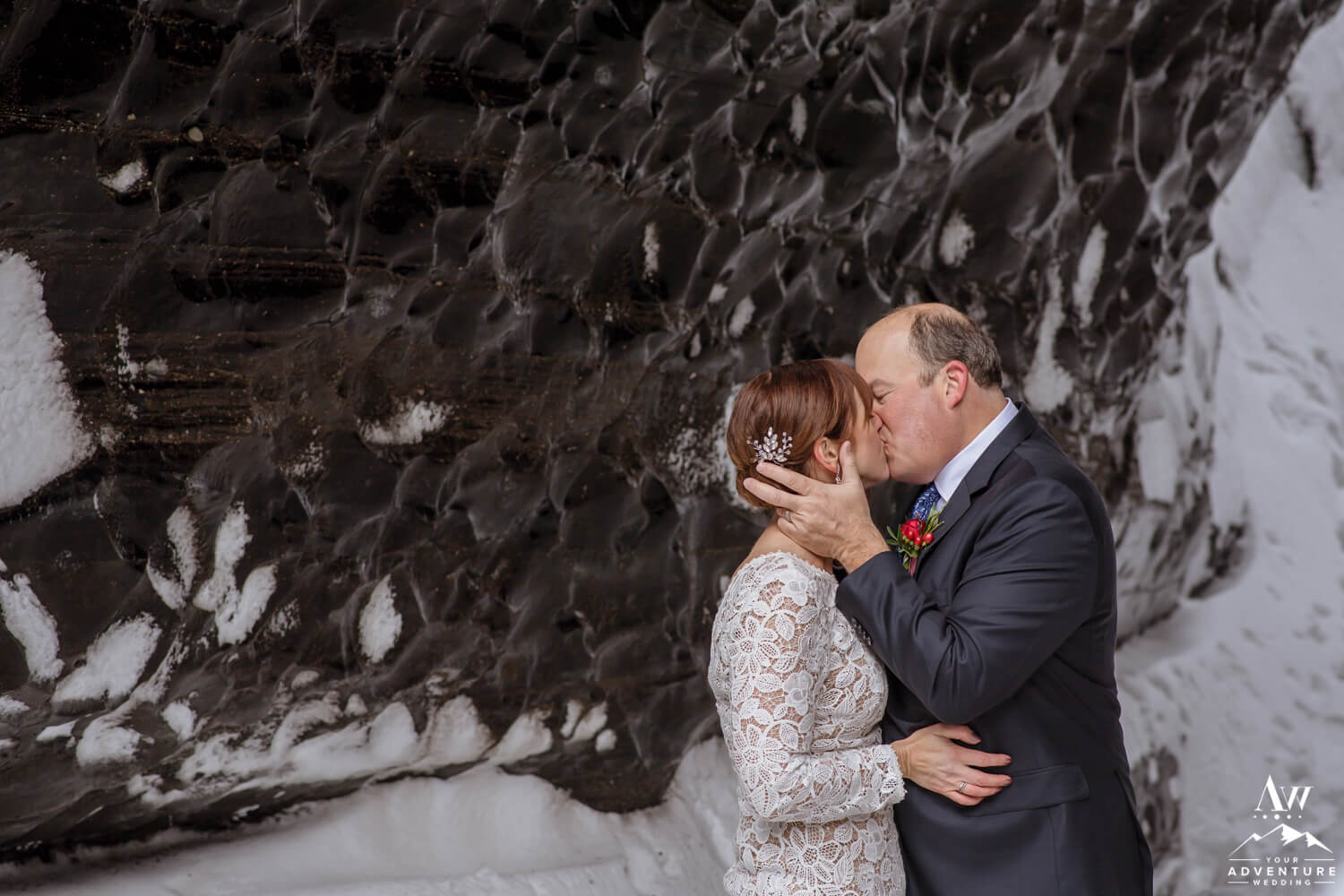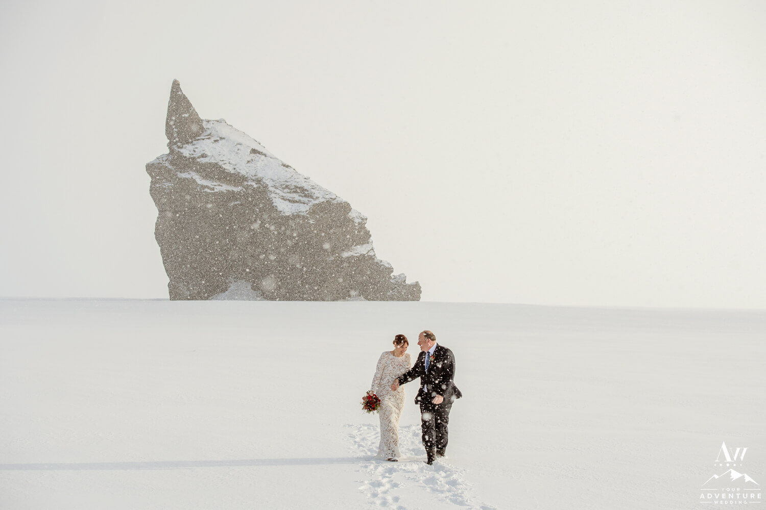 Meanwhile, hiking to your ceremony location is one of the most inspiring things we think you can do. Firstly, you all know we’re huge fans of hiking elopements! Secondly, hiking to a natural ice cave that is 100% private, zero tourists lurking about, and a path to get there created JUST FOR YOU two that morning is even more MAGICAL somehow. Thirdly, this icy elopement ceremony even had their own platform for the ceremony dug out moments before it began! Suddenly though during their exploration time in the ice cave blizzard conditions quickly came in adding more excitement!