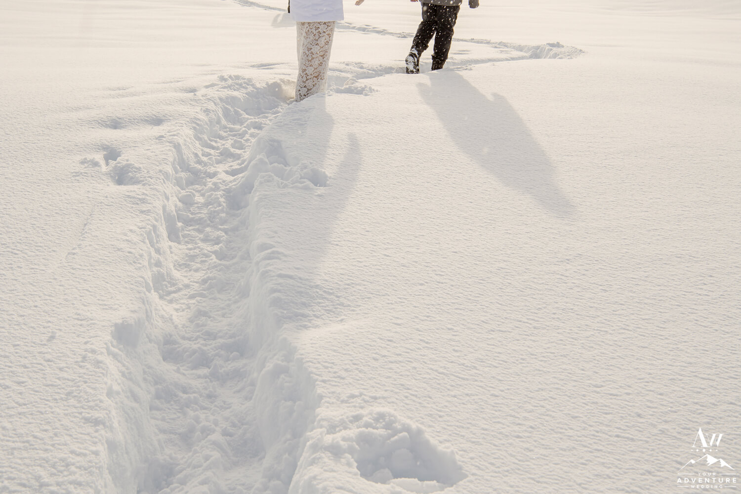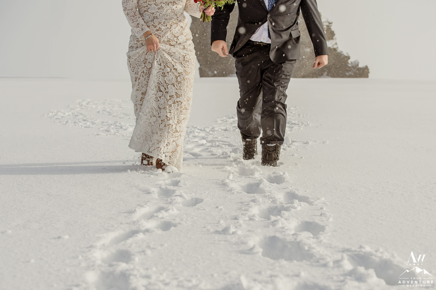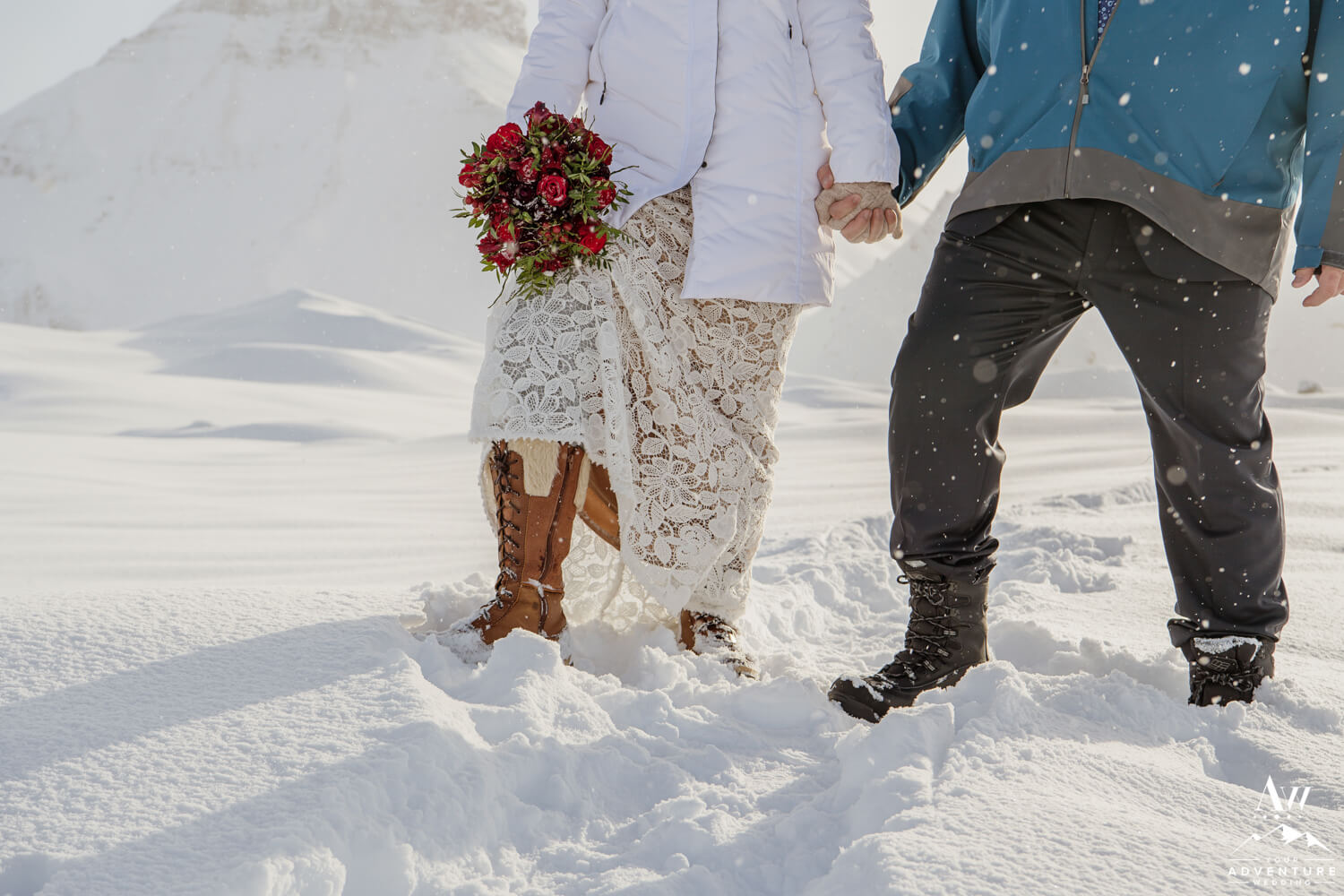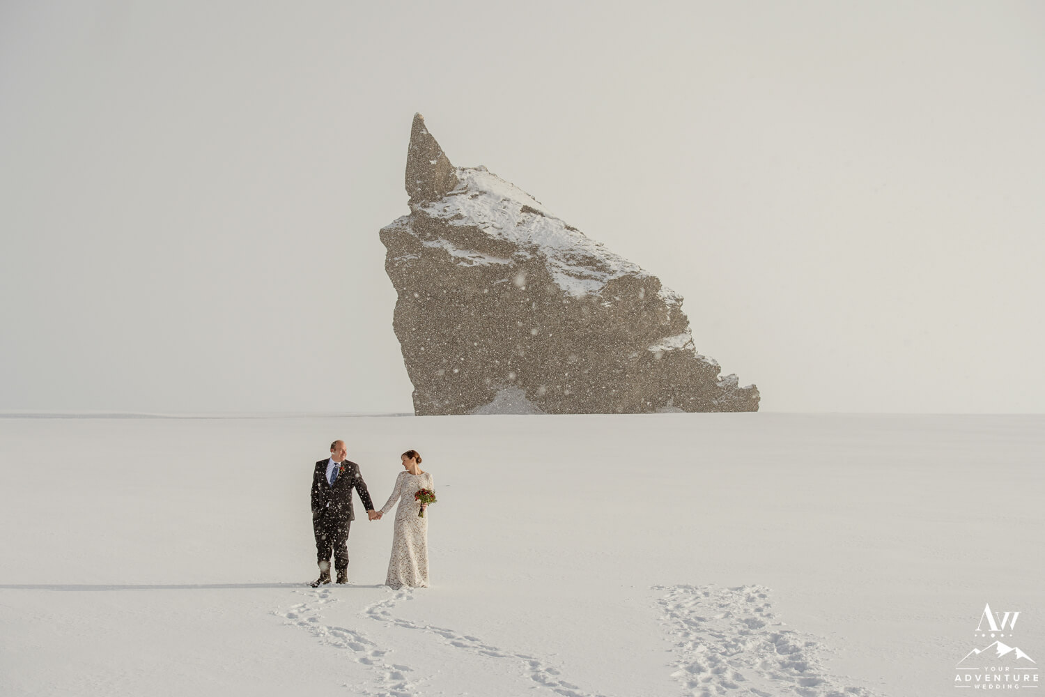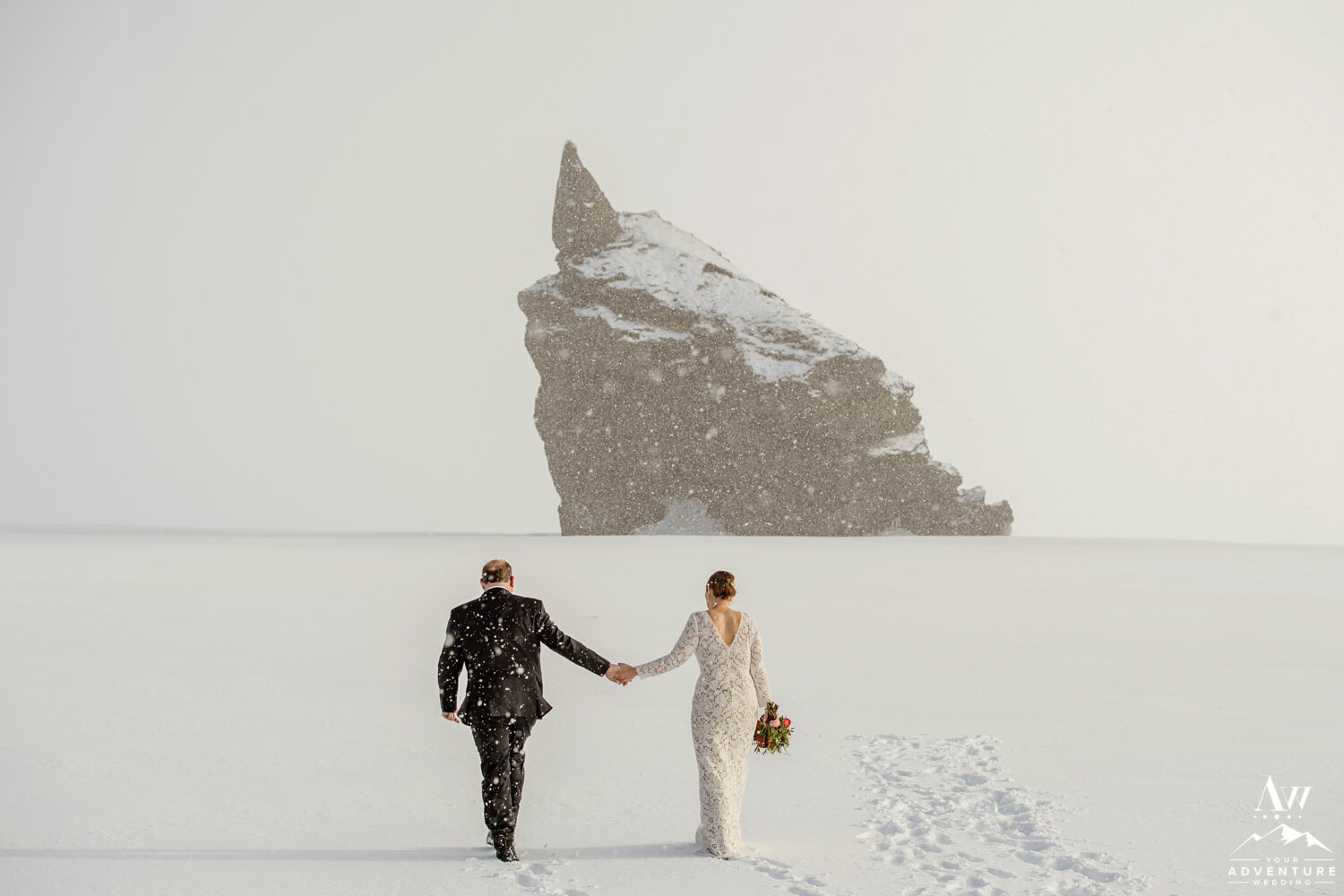 Meanwhile, hiking to your ceremony location is one of the most inspiring things we think you can do. Firstly, you all know we’re huge fans of hiking elopements! Secondly, hiking to a natural ice cave that is 100% private, zero tourists lurking about, and a path to get there created JUST FOR YOU two that morning is even more MAGICAL somehow. Thirdly, this icy elopement ceremony even had their own platform for the ceremony dug out moments before it began! Suddenly though during their exploration time in the ice cave blizzard conditions quickly came in adding more excitement!