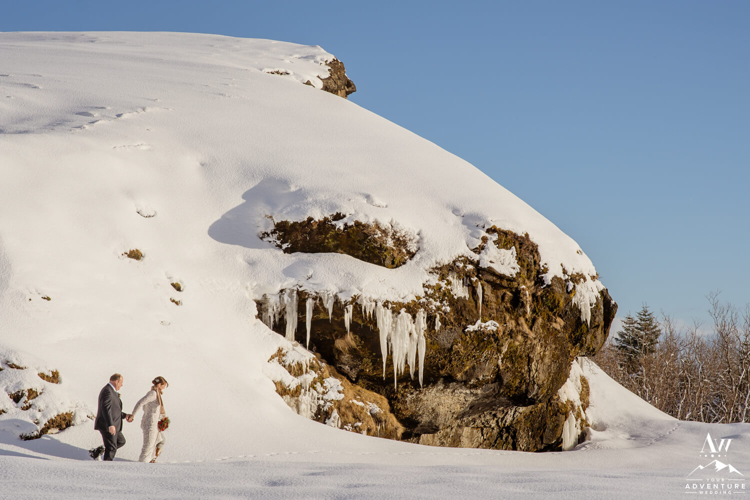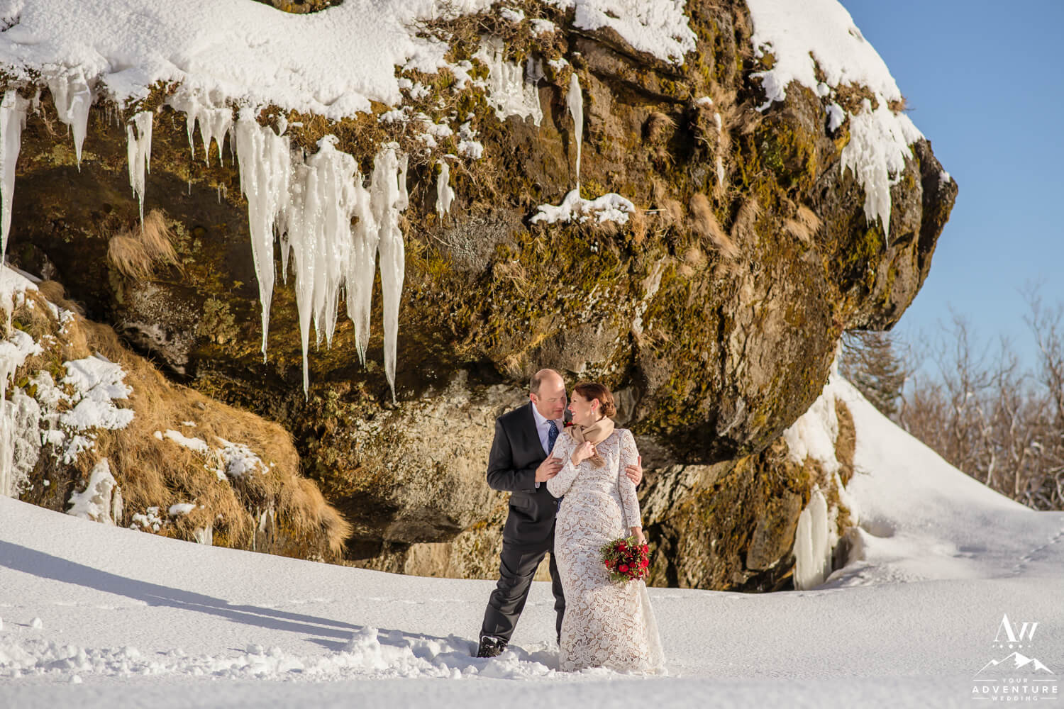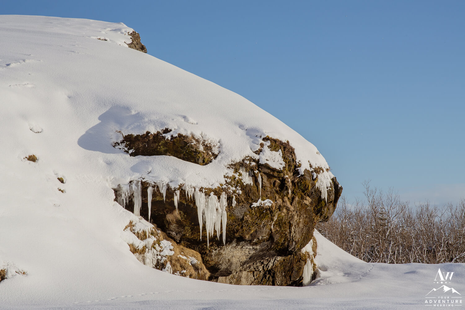 You do not have to go all the way to a glacier to experience ice in Iceland! For example, often during the month of February you can find beautiful icicles hanging throughout many natural features in the countryside. Which make for a stunning icy elopement backdrop!