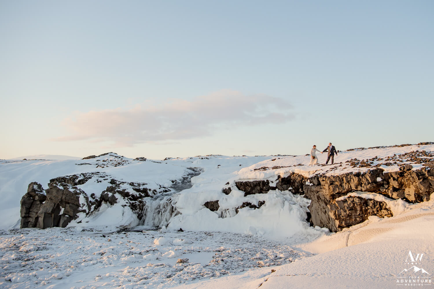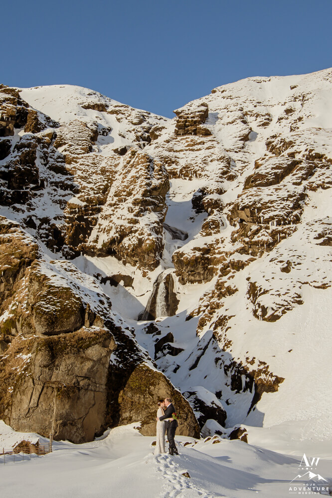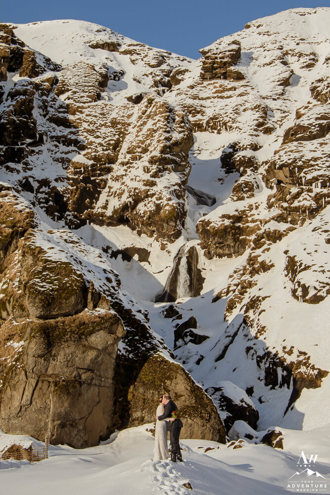 Staying with our theme of frozen features during this February wedding in Iceland… As they neared the end of their 8-10 hour icy adventure elopement they visited a unique place which is not often fully snow covered really ever! Seriously, we can count on one hand how many times we’ve witnesses this unique phenomena. The iciness, the colors, textures, and sunset all together made it a really fun journey! After all who doesn’t want to see a half frozen waterfall?!