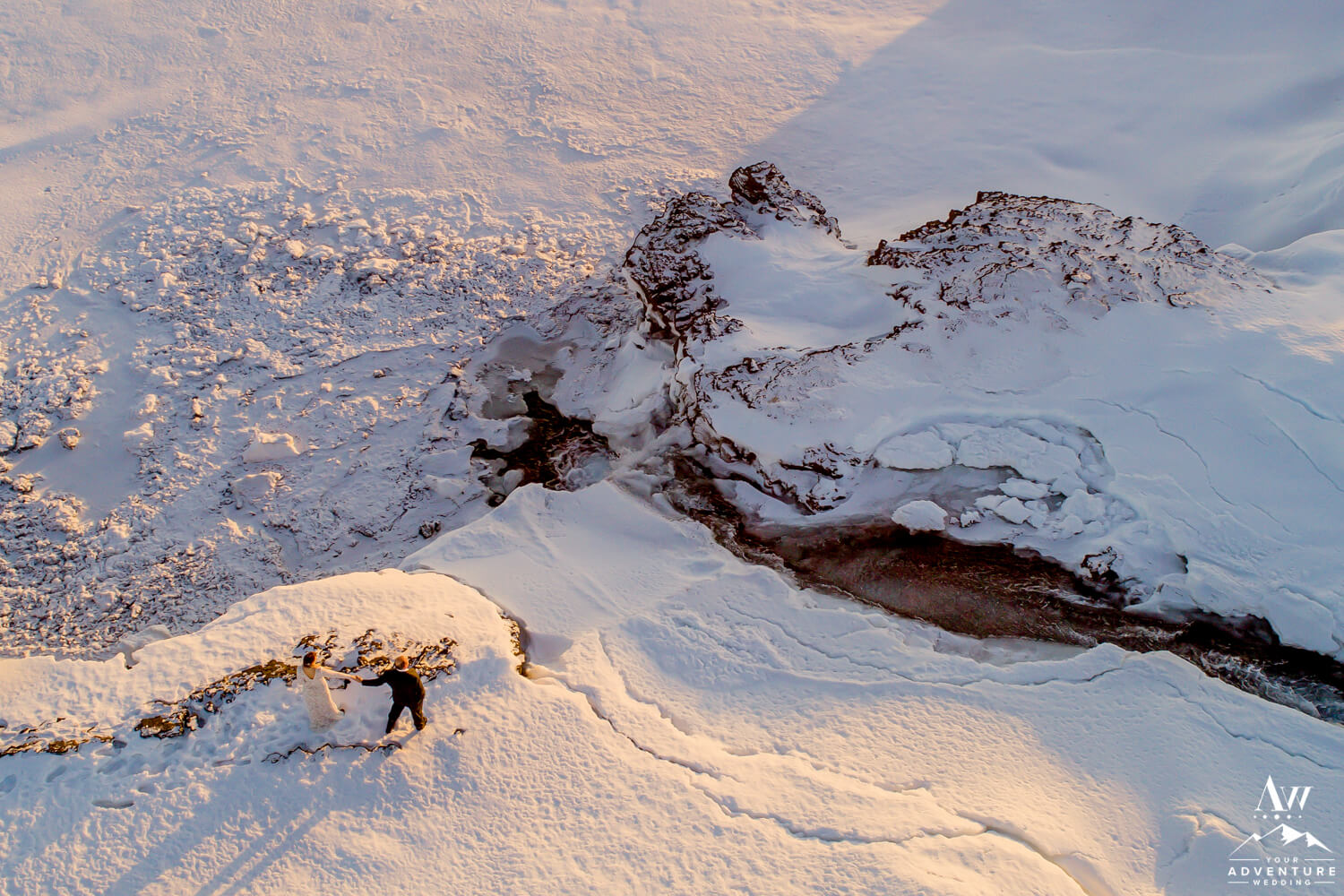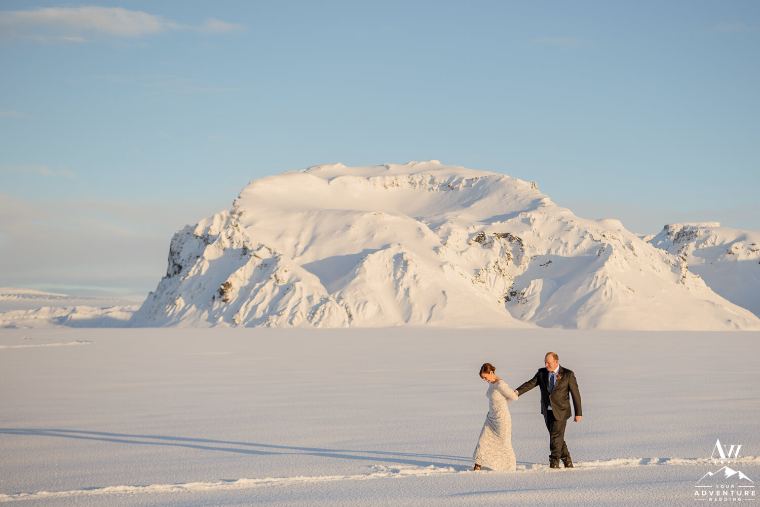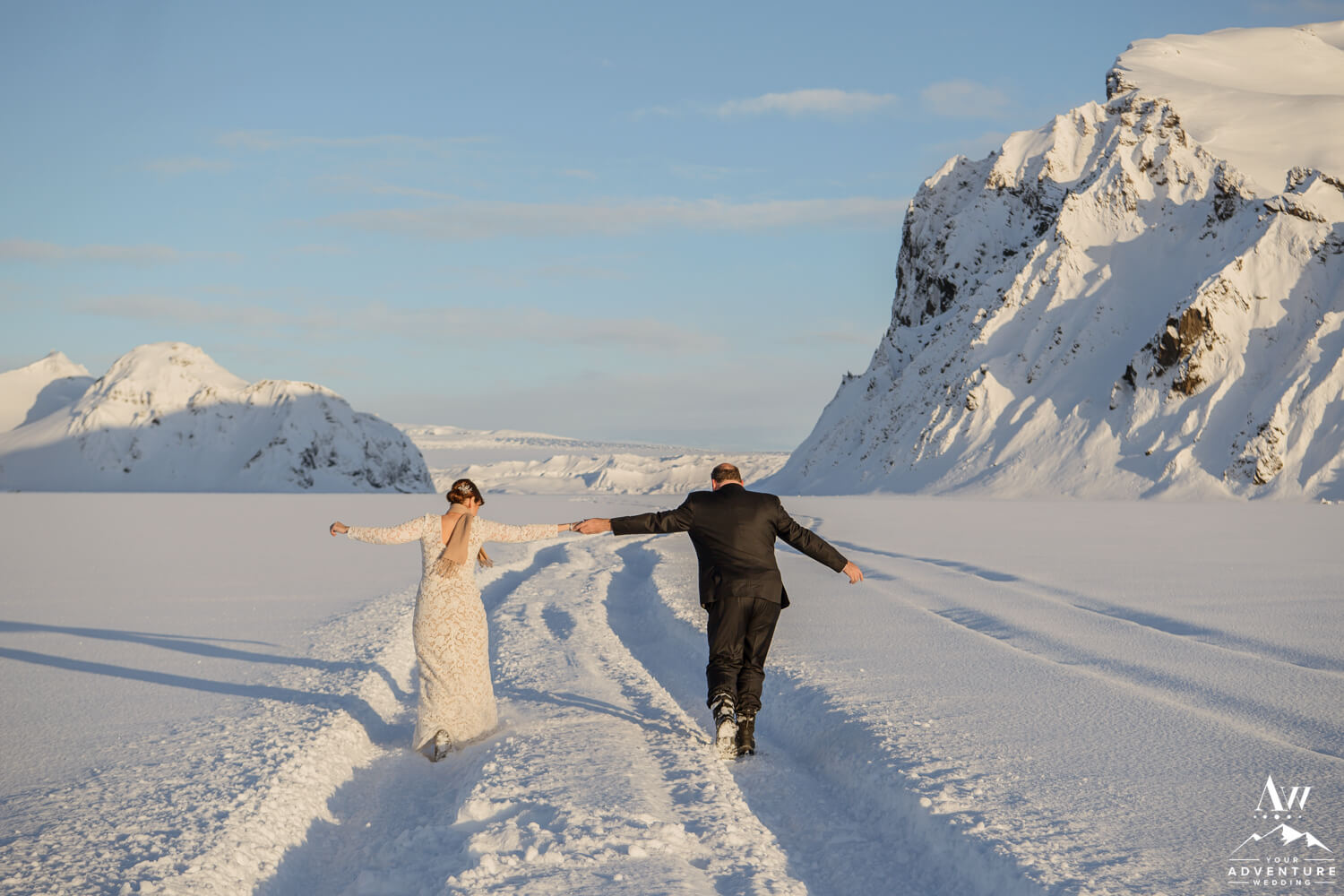 Lunchtime comes quick when you’re adventuring together! The newlyweds opted in for a traditional hot dog BBQ experience in one of our many private property natural caves. Remember, hot dogs in Iceland are not the dirty American ones you may be used to. Rather they are primarily made with lamb meat! Personally, you couldn’t pay me enough to eat an American hot dog, but an Icelandic one I’ll take down 2-3! Plus having a hot lunch during your icy elopement can be a total energy game changer! After lunch these lovers explored the nearby landscapes by running around hand in hand in the fresh snow!