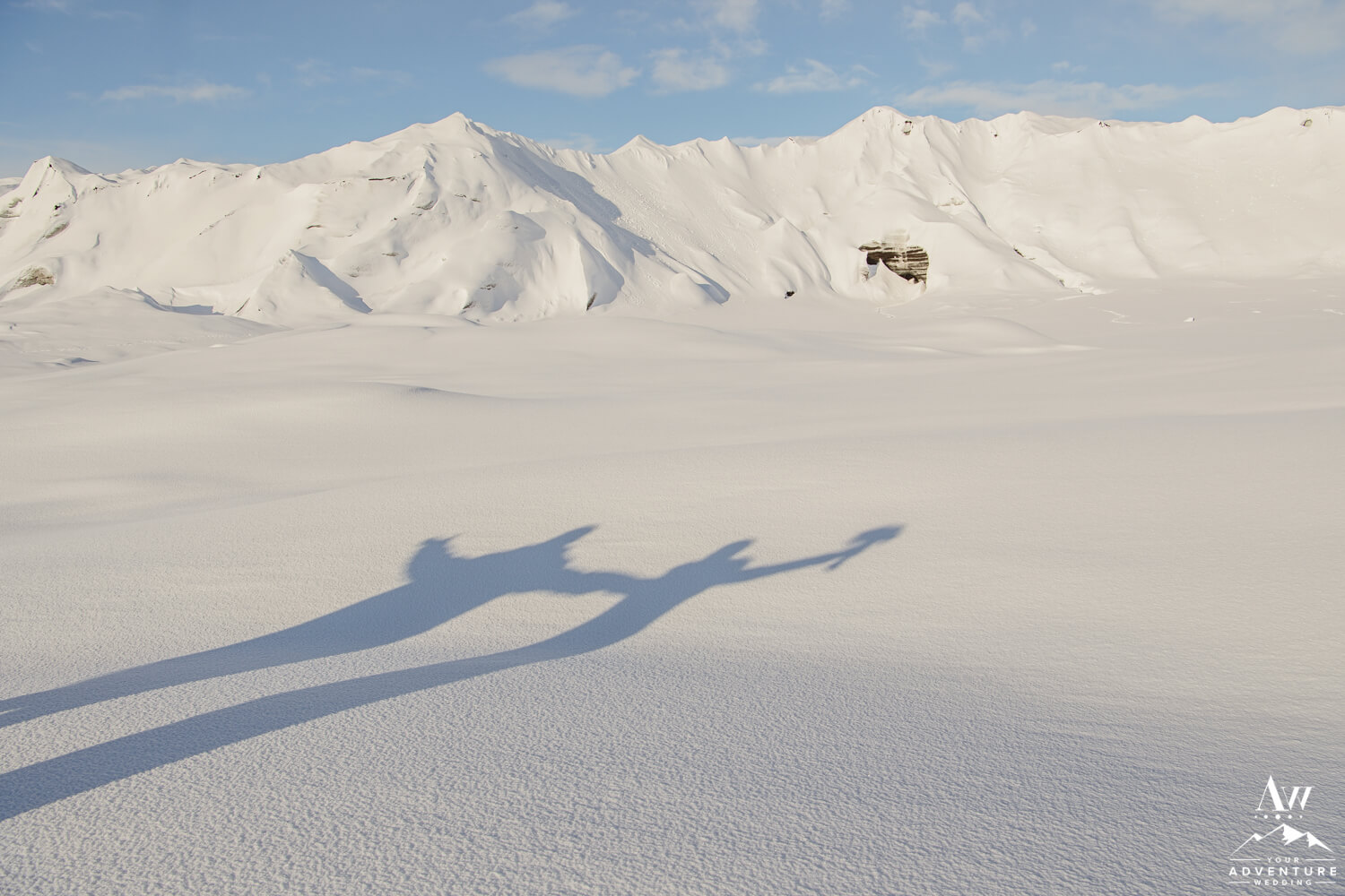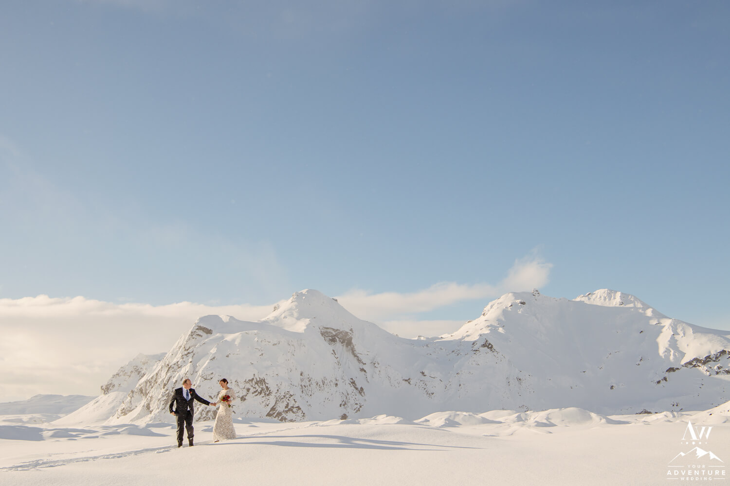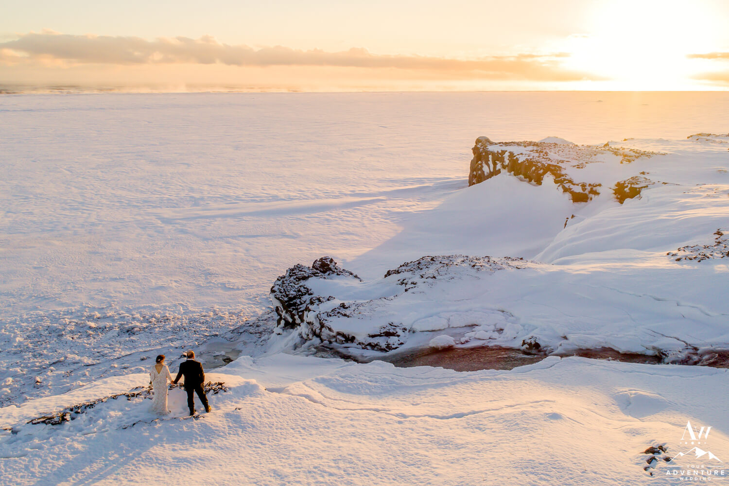 Lunchtime comes quick when you’re adventuring together! The newlyweds opted in for a traditional hot dog BBQ experience in one of our many private property natural caves. Remember, hot dogs in Iceland are not the dirty American ones you may be used to. Rather they are primarily made with lamb meat! Personally, you couldn’t pay me enough to eat an American hot dog, but an Icelandic one I’ll take down 2-3! Plus having a hot lunch during your icy elopement can be a total energy game changer! After lunch these lovers explored the nearby landscapes by running around hand in hand in the fresh snow!