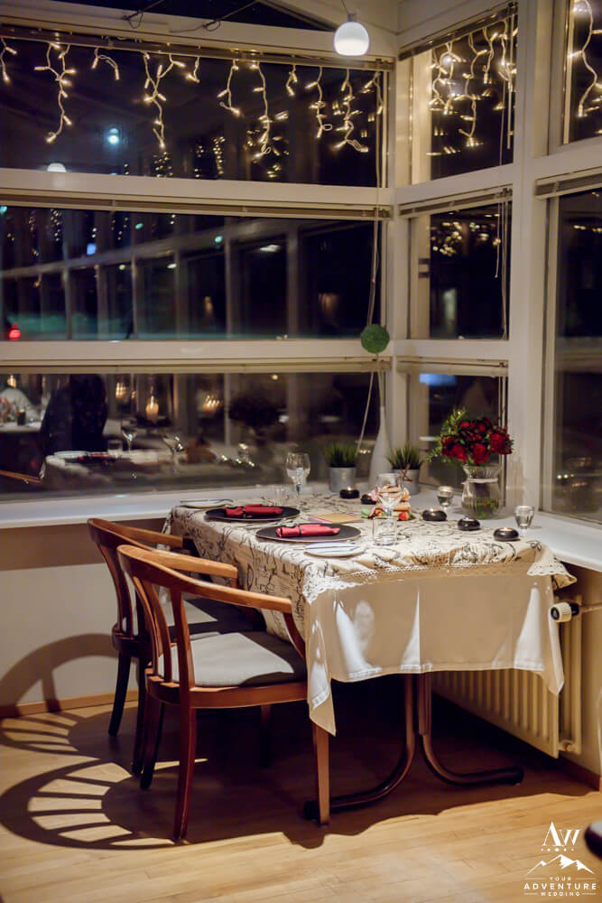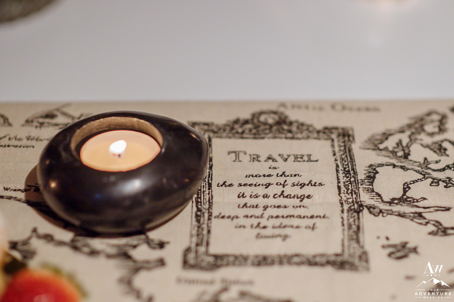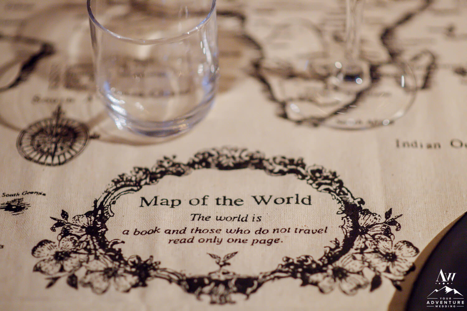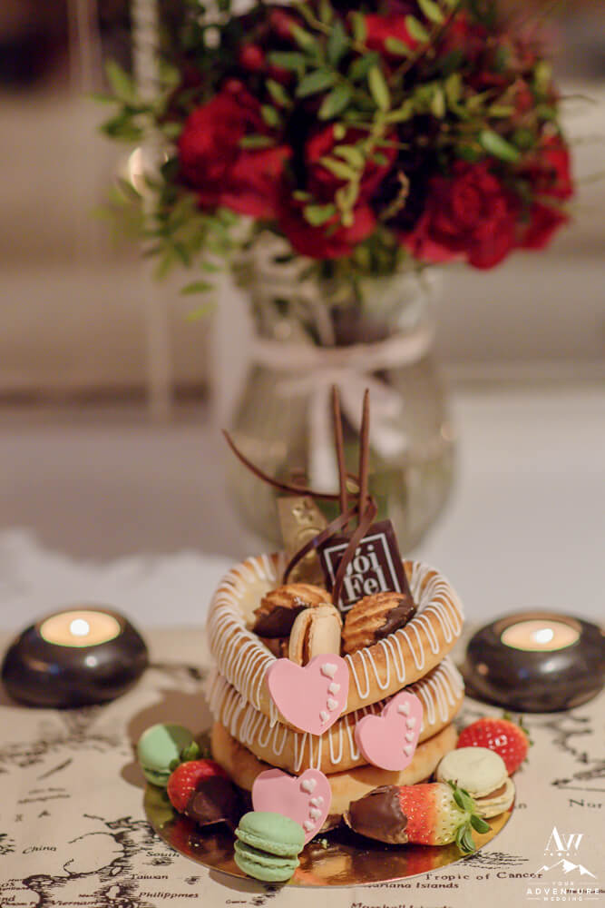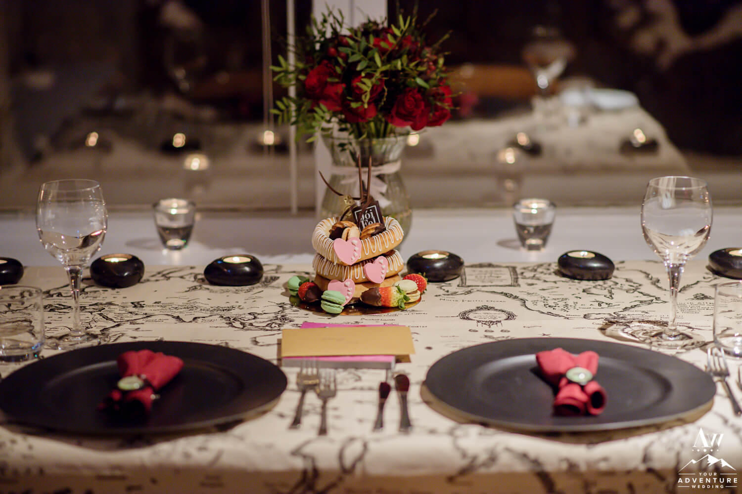Returning to the hotel after sunset, these two had some time to rest and refresh after their icy elopement adventure! Following, they came down to a surprise… A travel inspired sweetheart reception table! Complete with a traditional kransakaka too!