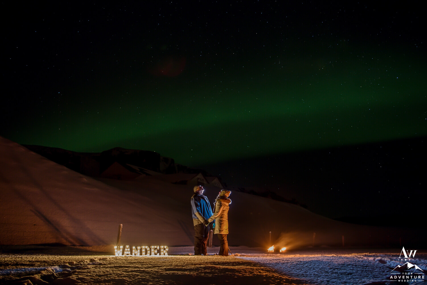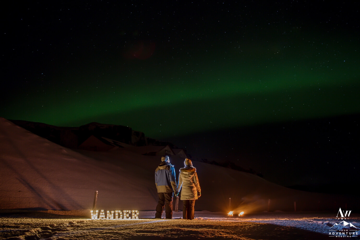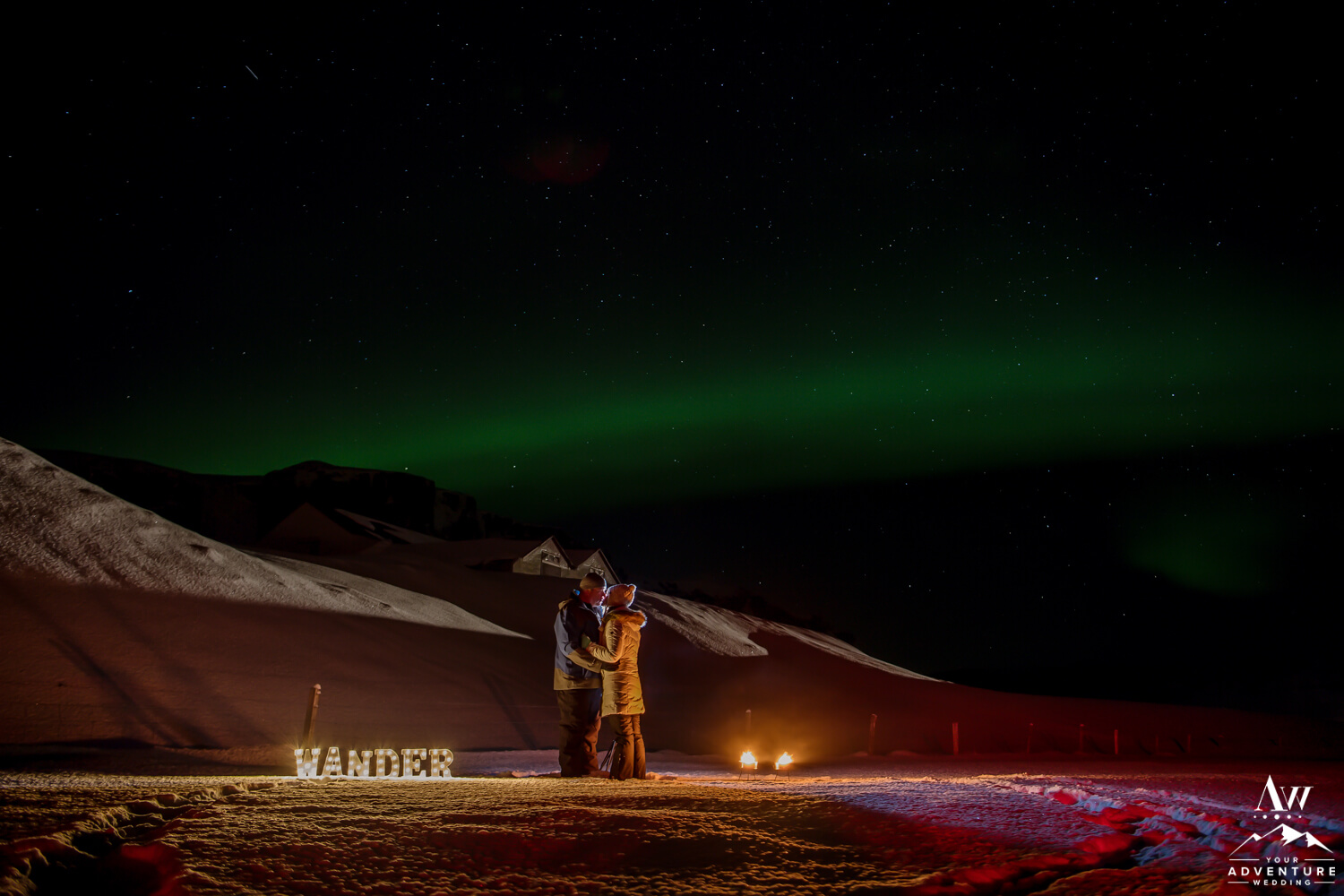 Lastly but not least, February is our favorite month to go Northern Lights hunting! After dinner these two were game to go out with our Iceland elopement photographer to see if they could find and create a lovely nighttime shot too!