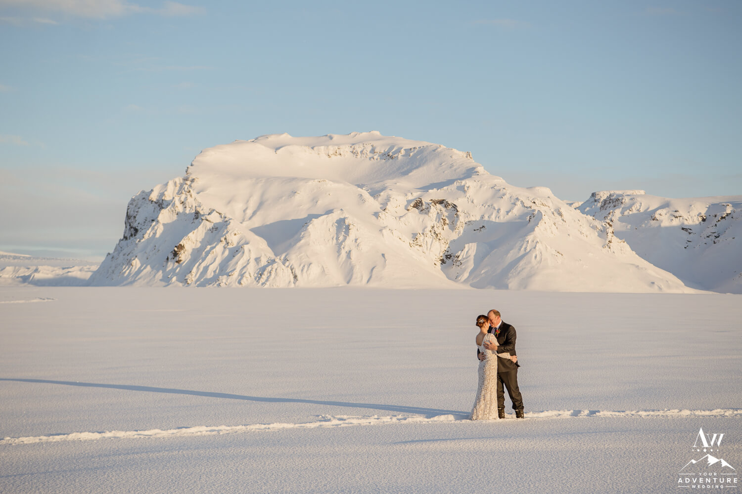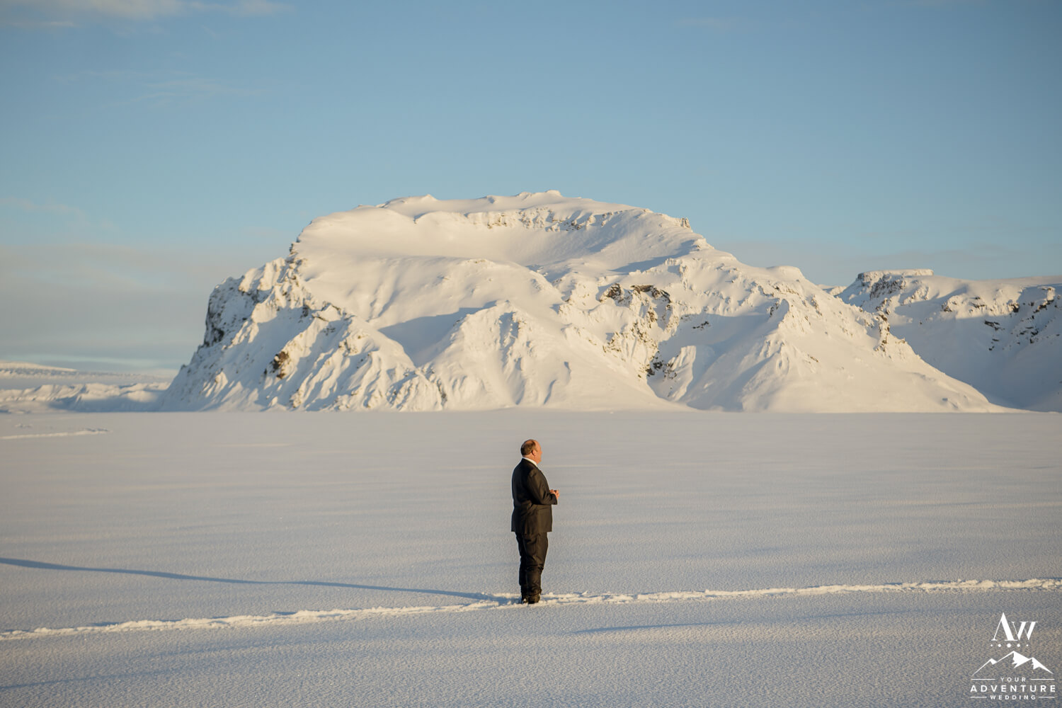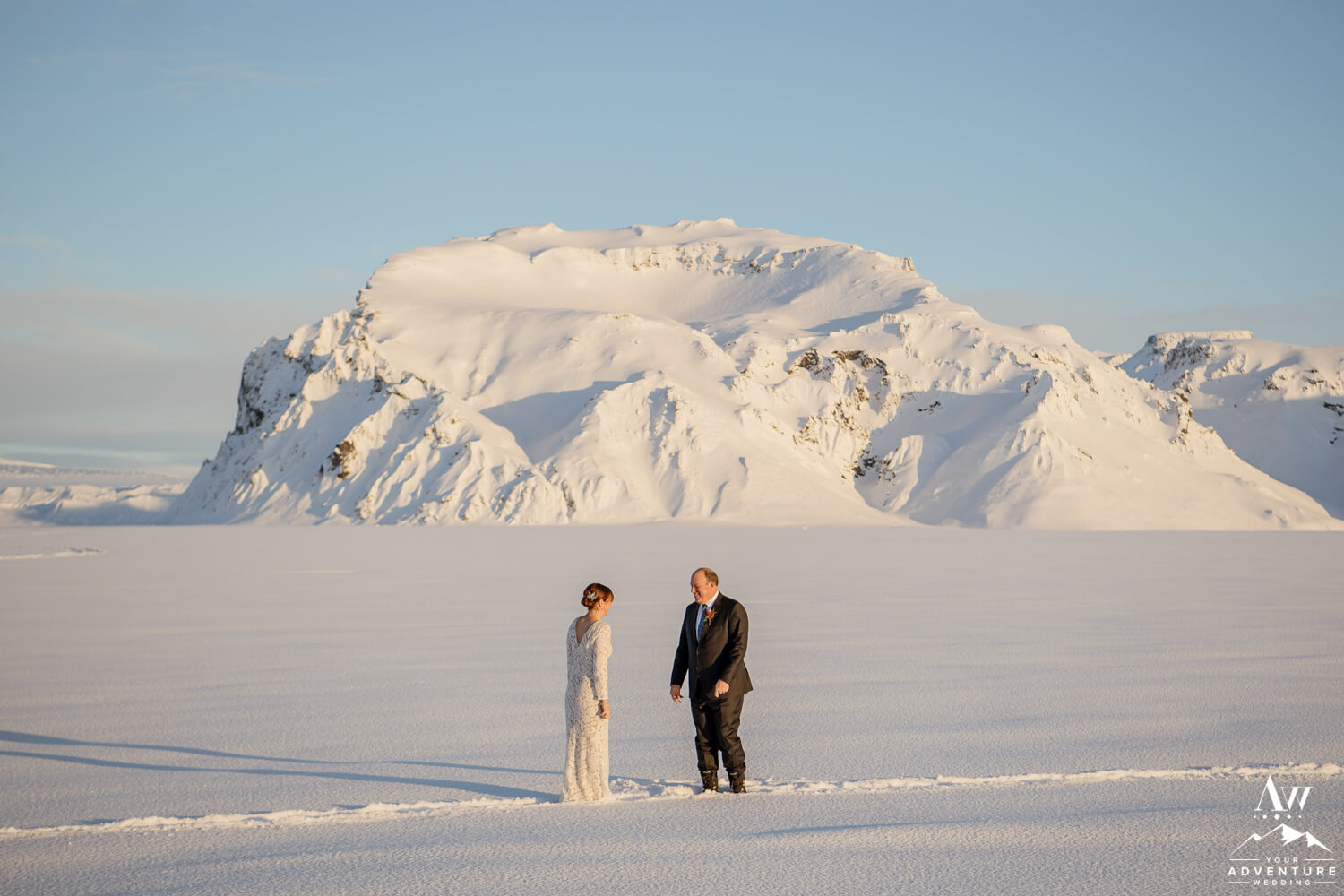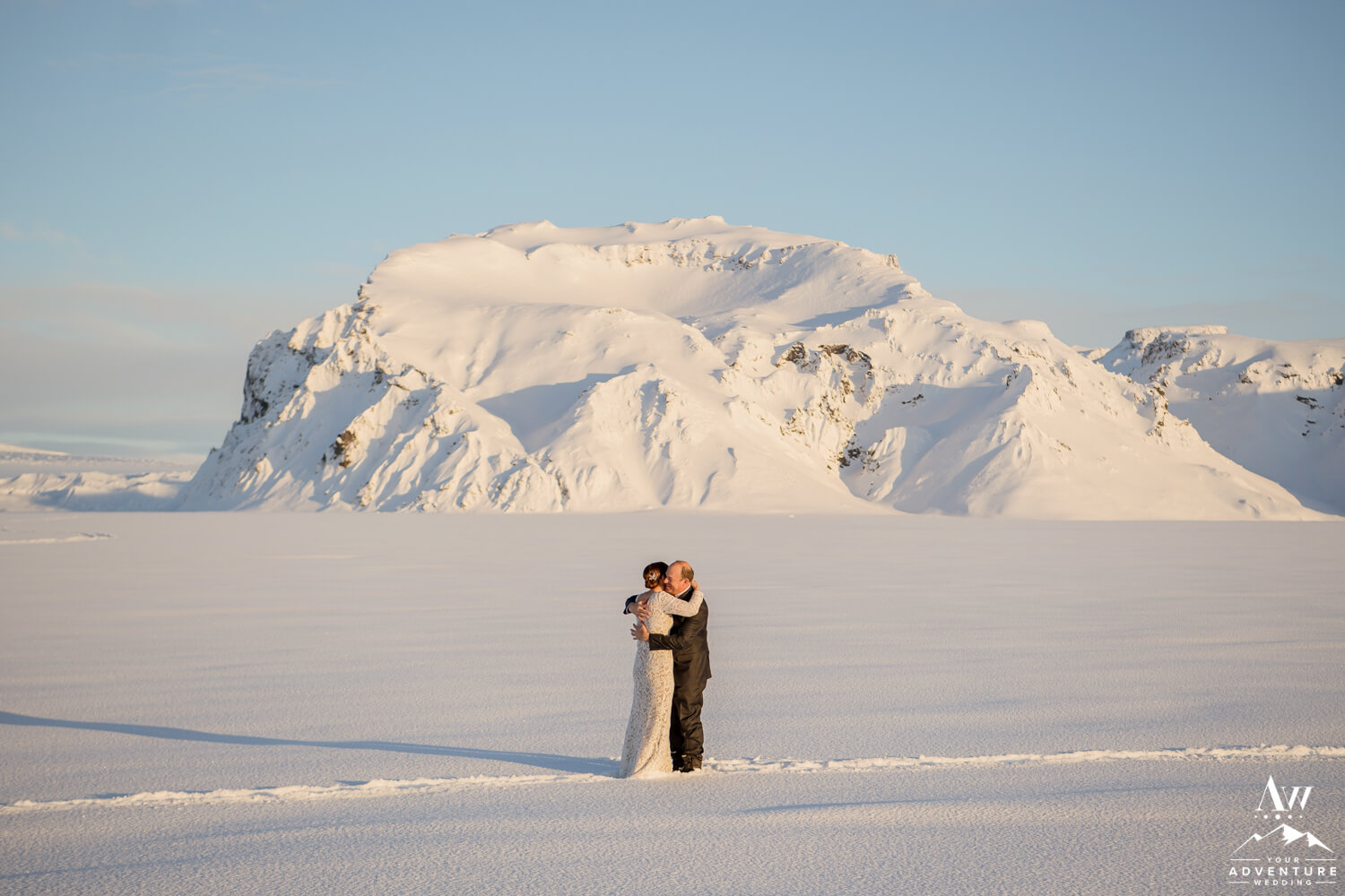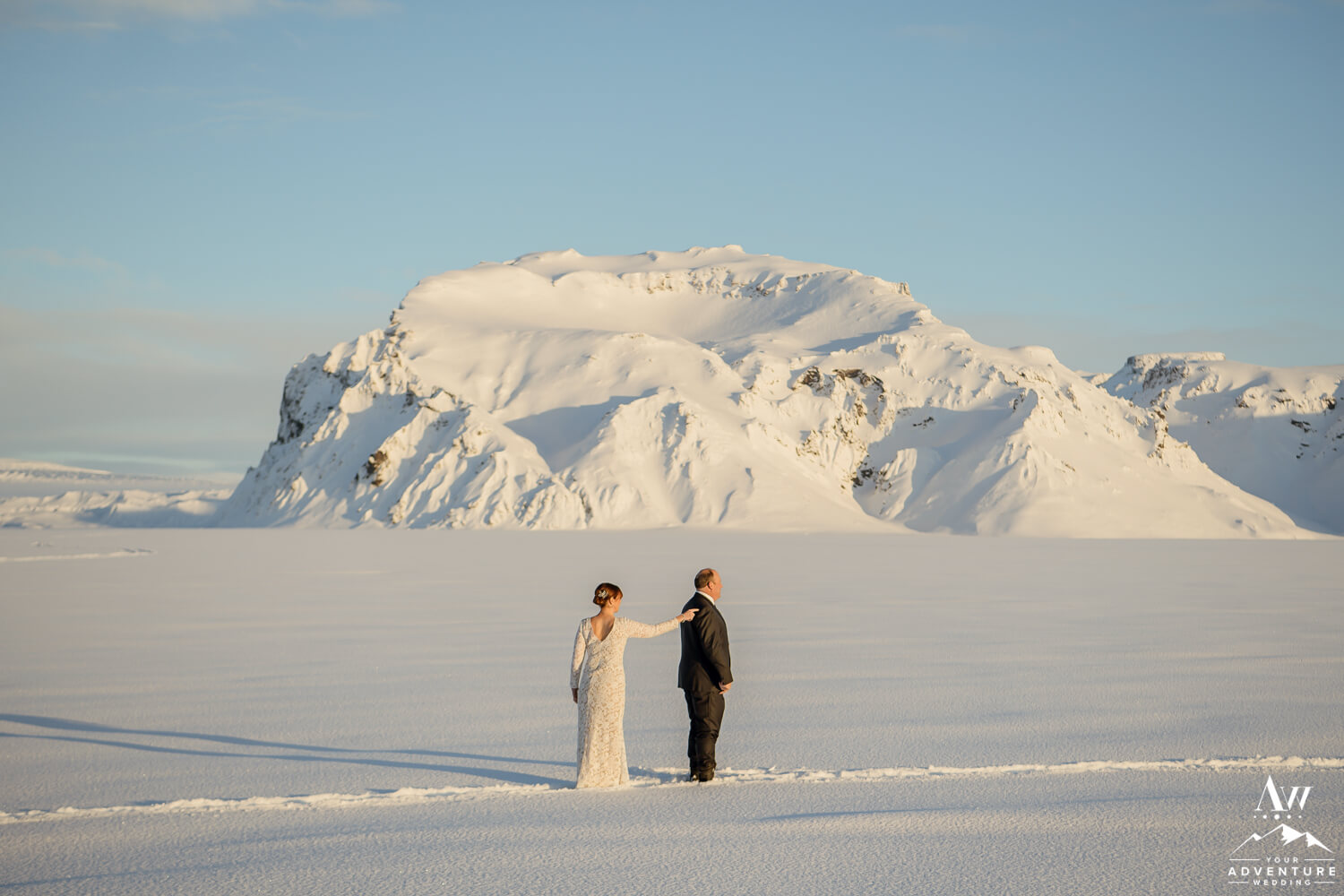 Believe it or not, you can still have a “first look” even when you elope AND get ready together! To illustrate, on the way to the icy elopement in an ice cave in Iceland, we paused for the glorious sunrise on one of our favorite mountains. The groom jumped out, the bride popped off her coat and unveiled the full beauty of her dress! Next she walked towards him in the snow and gave him a sweet little tap on the shoulder for him to get the full view of her entire gorgeous look! Super fun and sweet moment between the two!