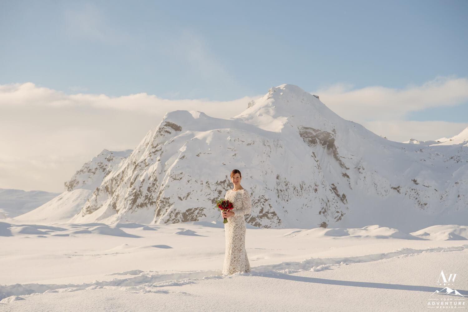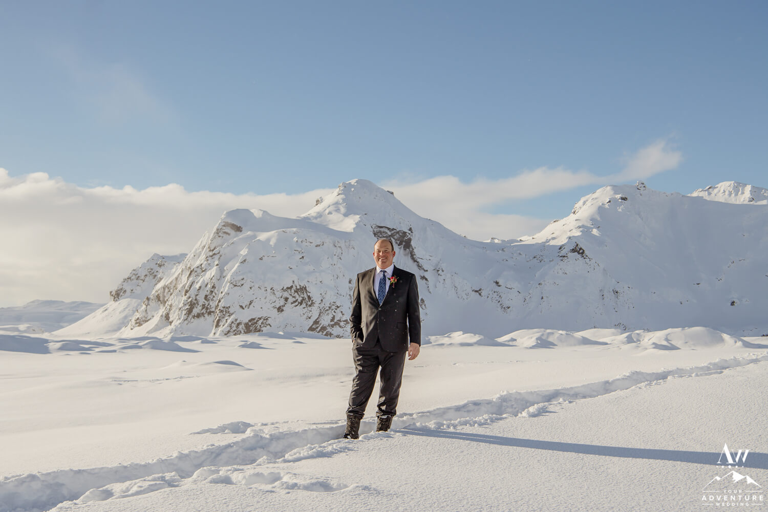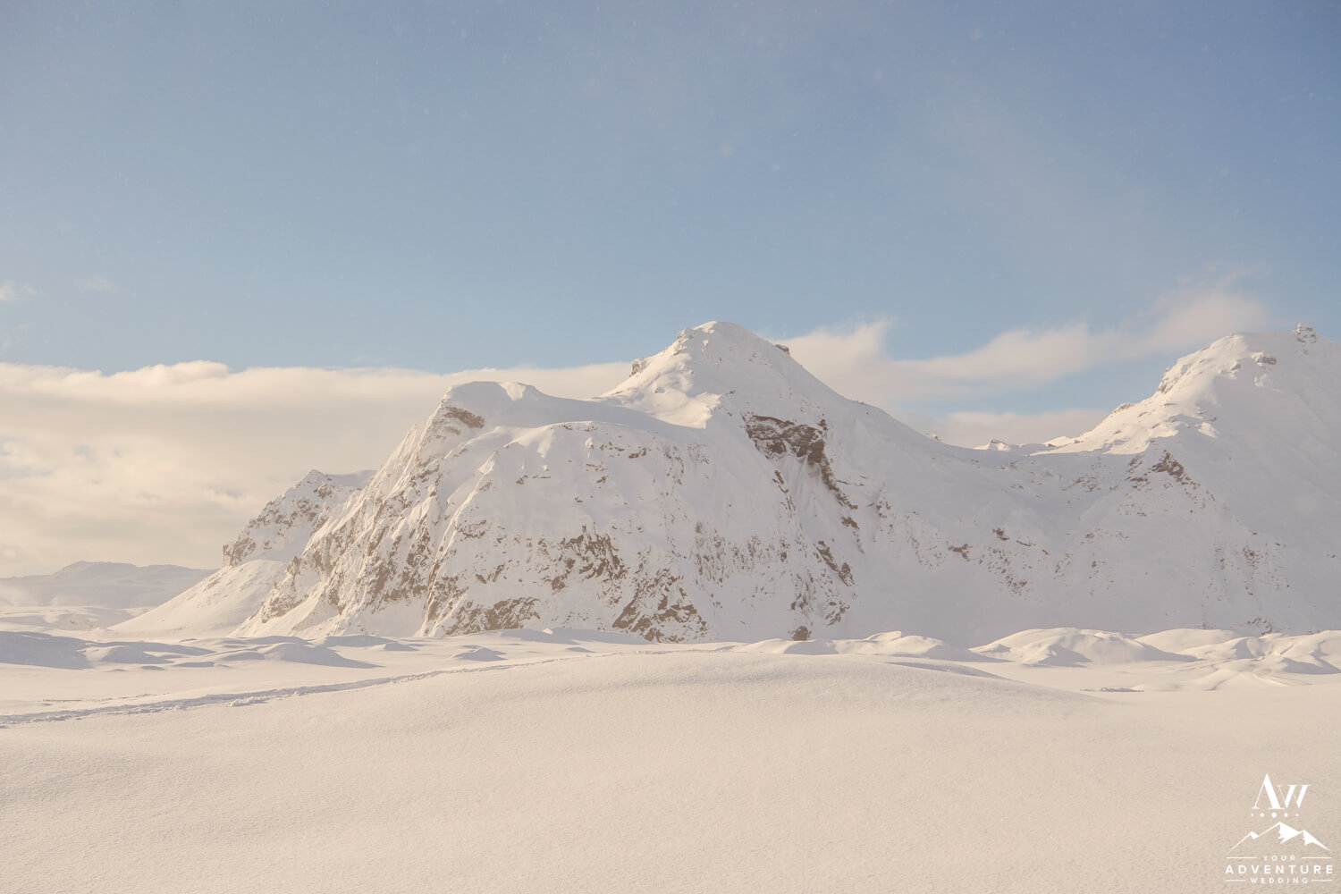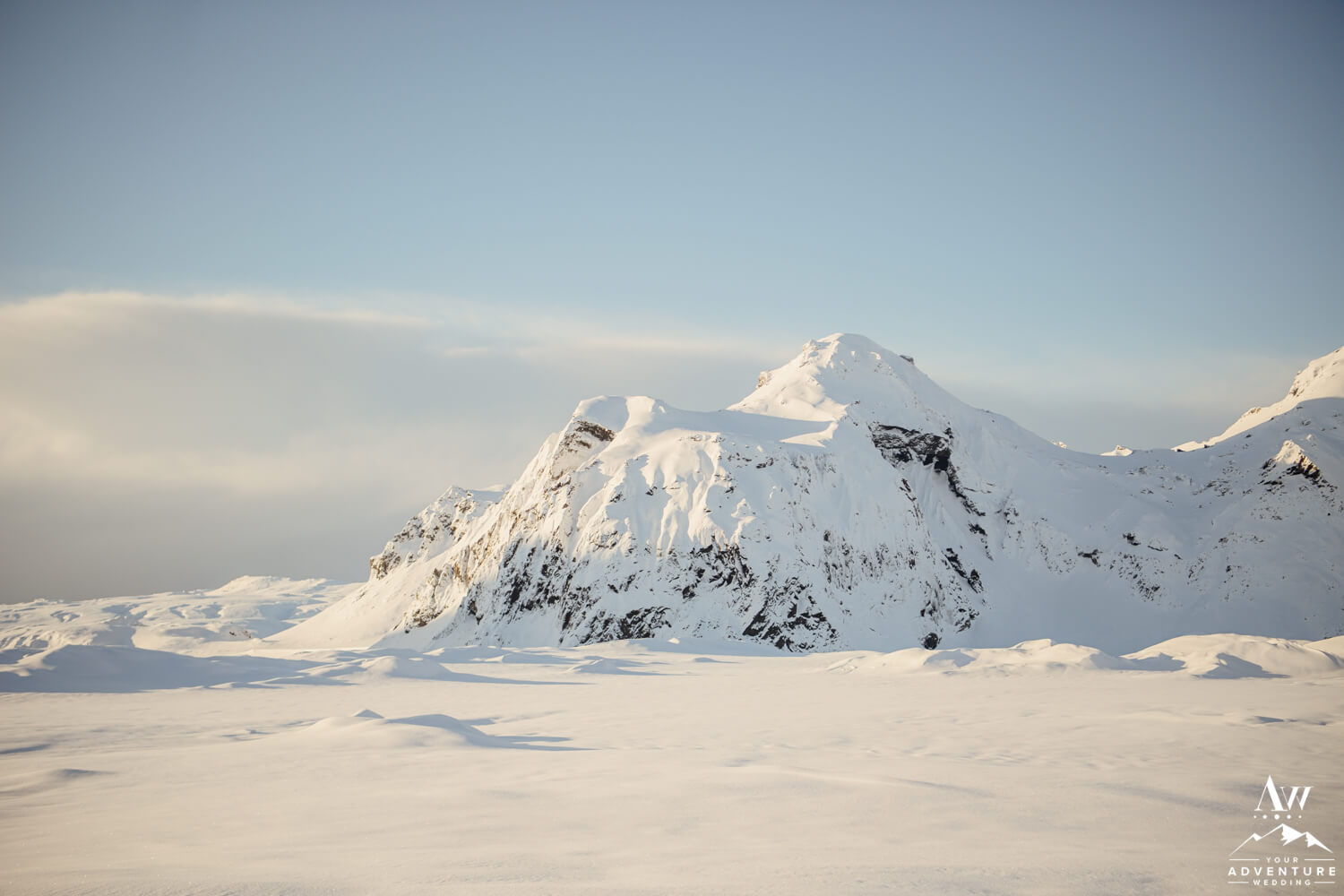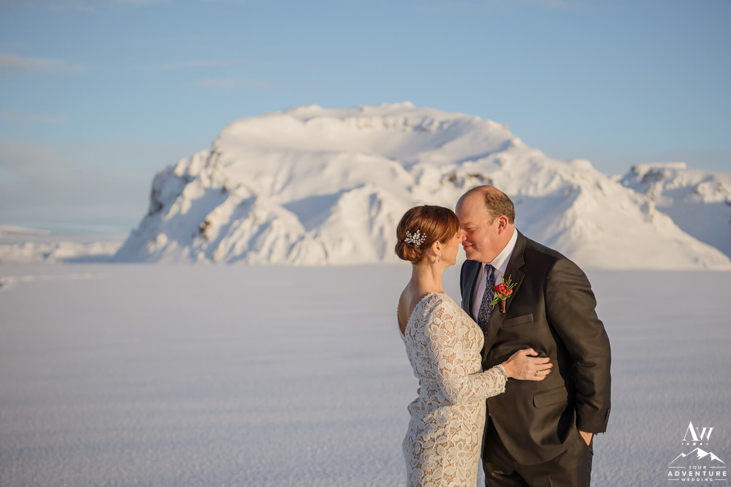 Believe it or not, you can still have a “first look” even when you elope AND get ready together! To illustrate, on the way to the icy elopement in an ice cave in Iceland, we paused for the glorious sunrise on one of our favorite mountains. The groom jumped out, the bride popped off her coat and unveiled the full beauty of her dress! Next she walked towards him in the snow and gave him a sweet little tap on the shoulder for him to get the full view of her entire gorgeous look! Super fun and sweet moment between the two!