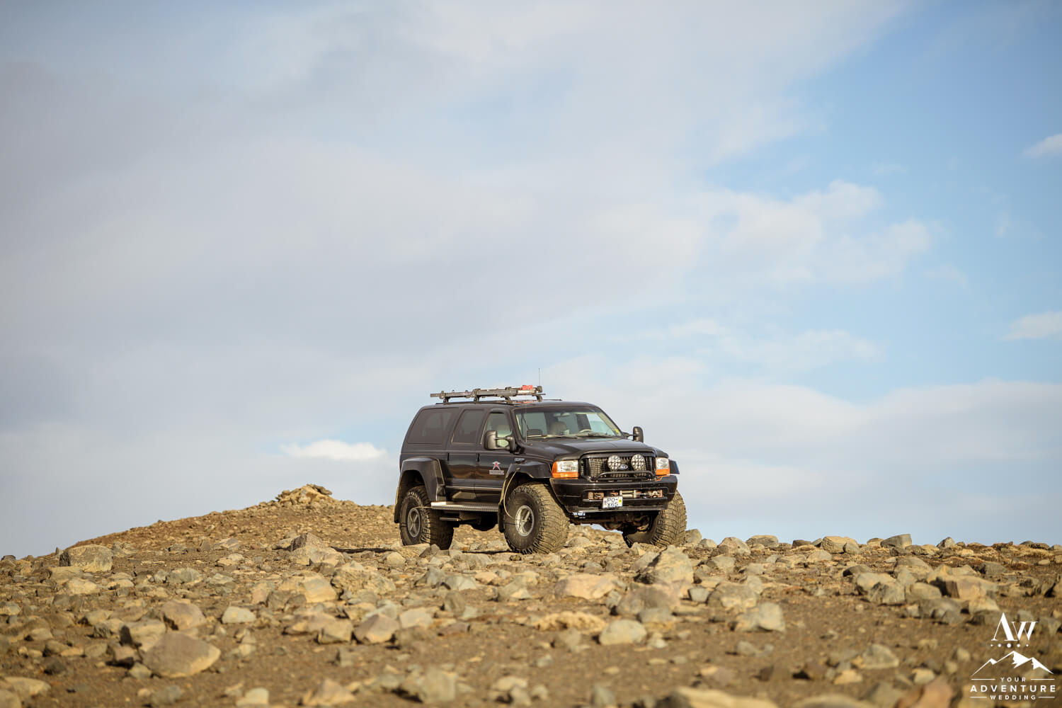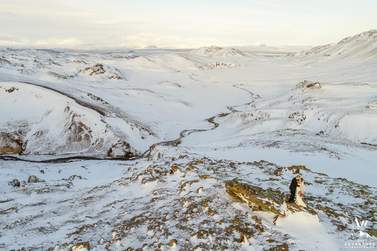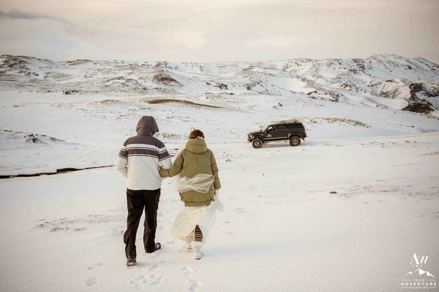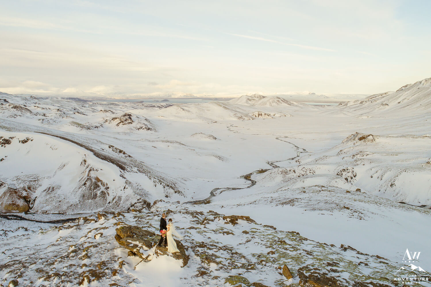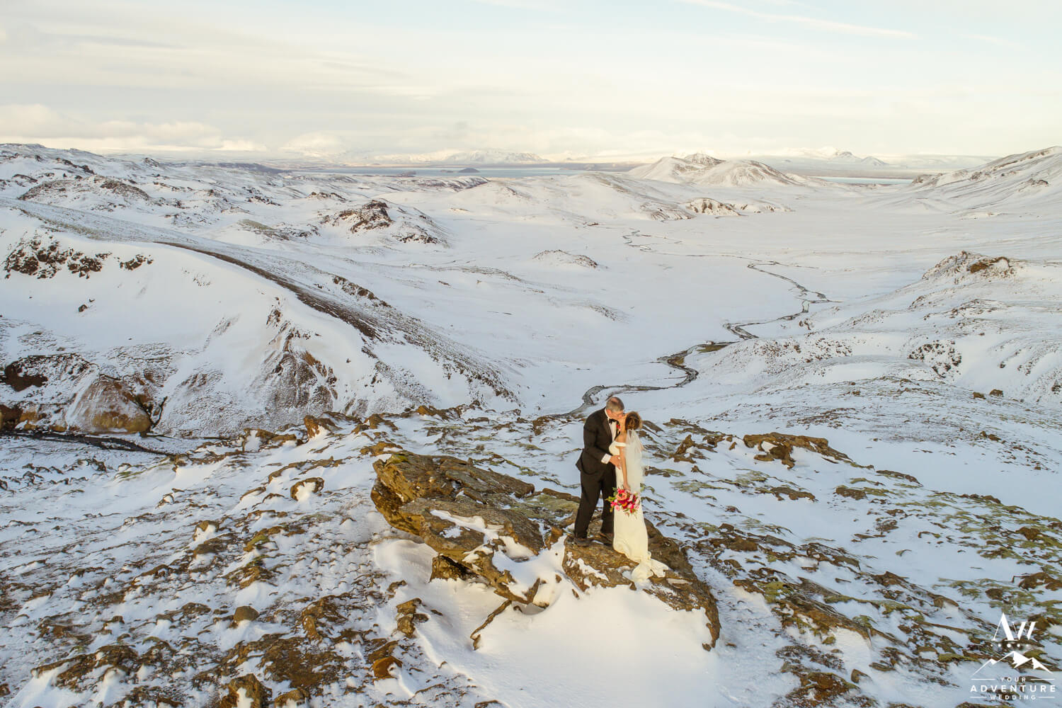 Being able to experience Iceland from the height of the top of mountains and witnessing 360 degree views on a clear day is addicting! The level of adventure gets amped up too at this specific Iceland elopement location too. Why? Because our adventure wedding photographer has to be safely tethered to the super jeep to get the incredible shots! Although the wind kicked up, our newlyweds thoroughly enjoyed this winter Iceland wedding spot.