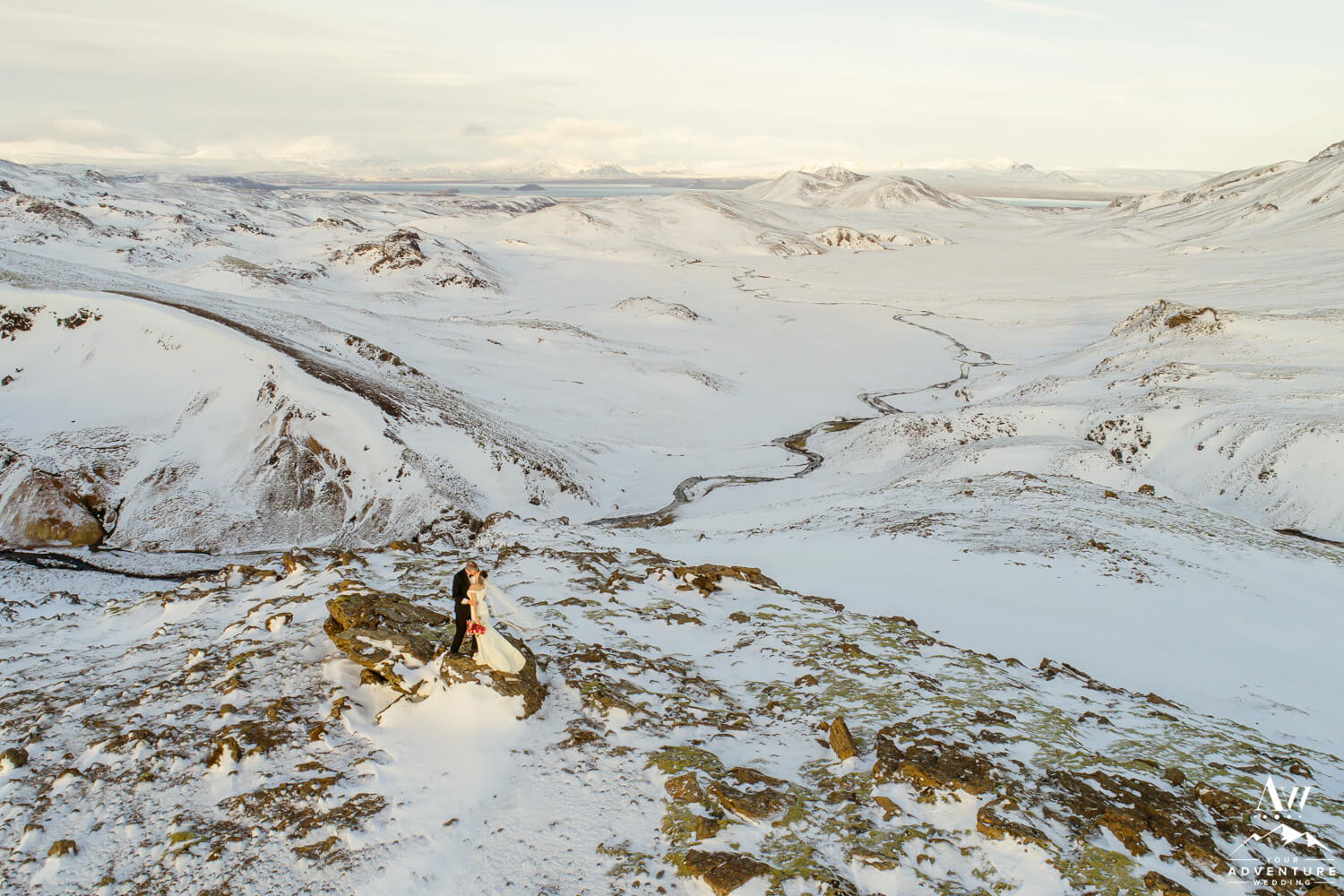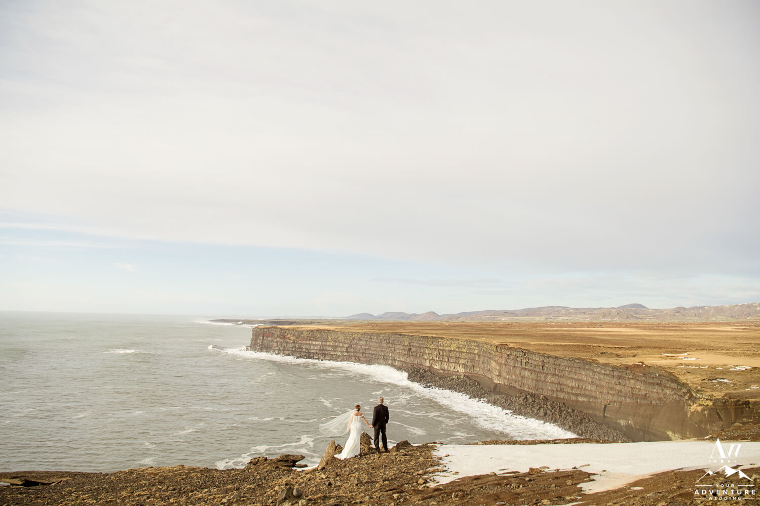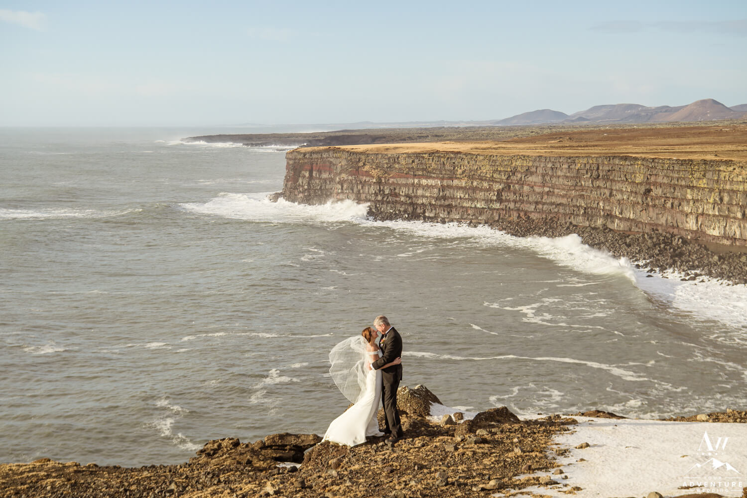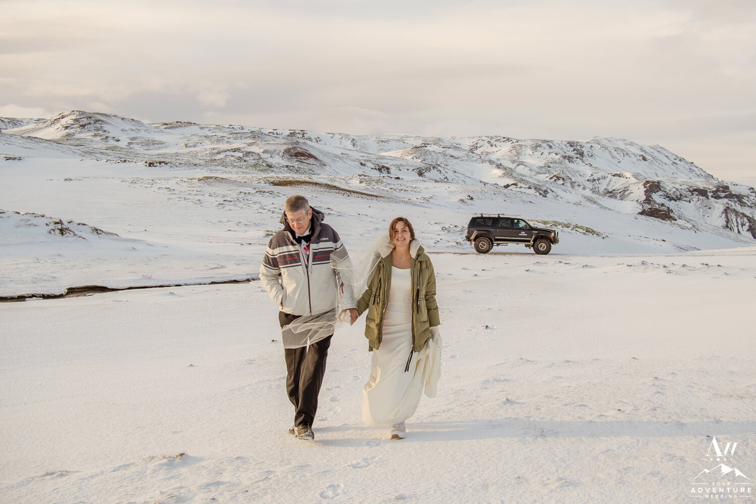 Being able to experience Iceland from the height of the top of mountains and witnessing 360 degree views on a clear day is addicting! The level of adventure gets amped up too at this specific Iceland elopement location too. Why? Because our adventure wedding photographer has to be safely tethered to the super jeep to get the incredible shots! Although the wind kicked up, our newlyweds thoroughly enjoyed this winter Iceland wedding spot.