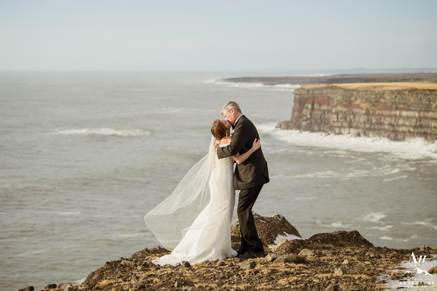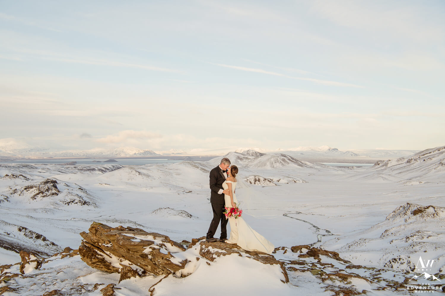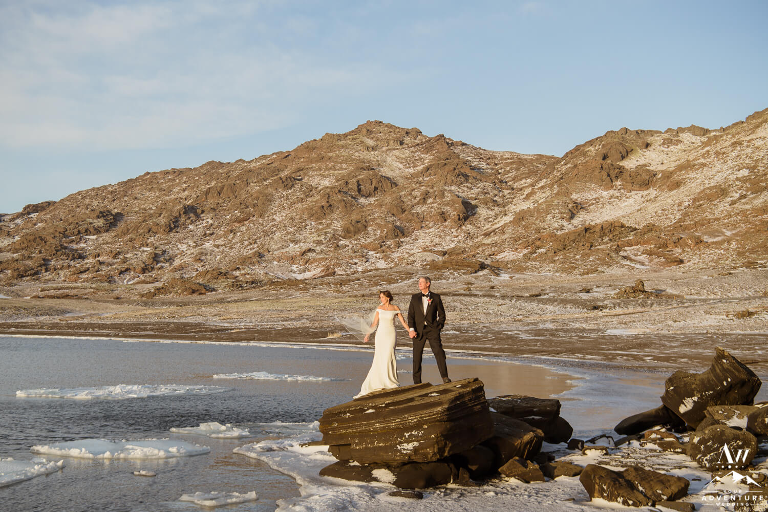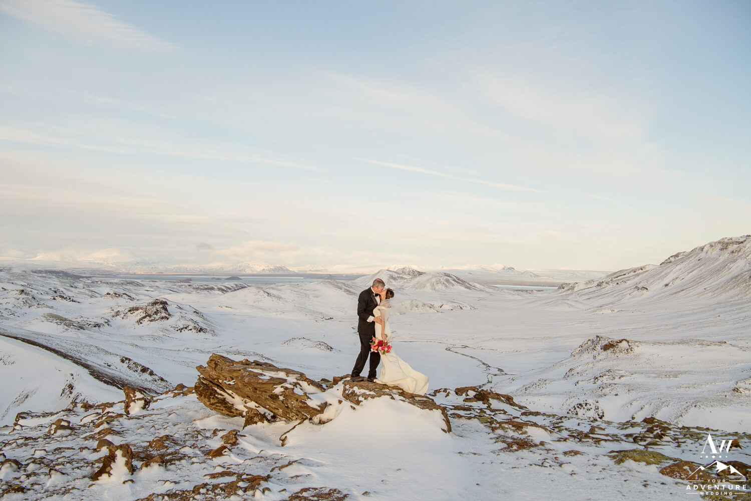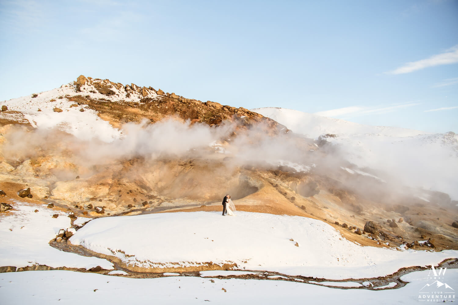 Being able to experience Iceland from the height of the top of mountains and witnessing 360 degree views on a clear day is addicting! The level of adventure gets amped up too at this specific Iceland elopement location too. Why? Because our adventure wedding photographer has to be safely tethered to the super jeep to get the incredible shots! Although the wind kicked up, our newlyweds thoroughly enjoyed this winter Iceland wedding spot.