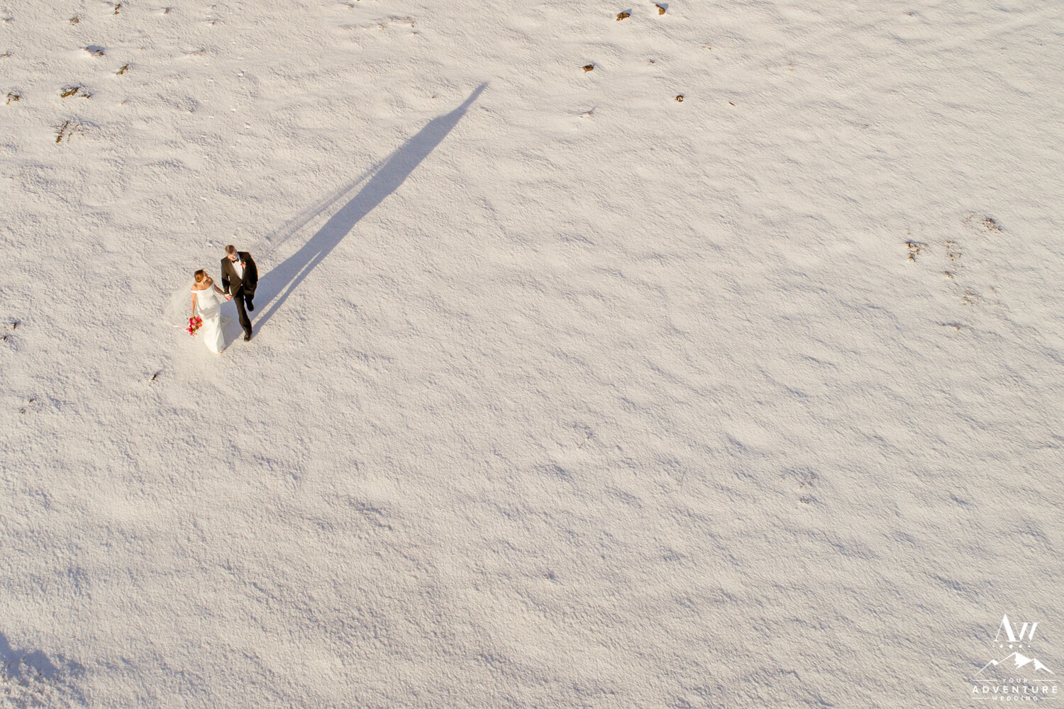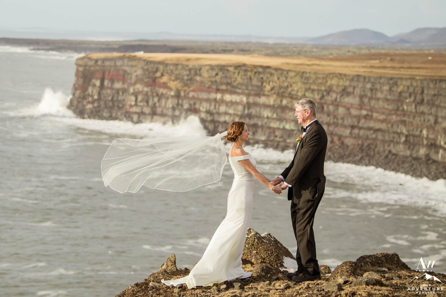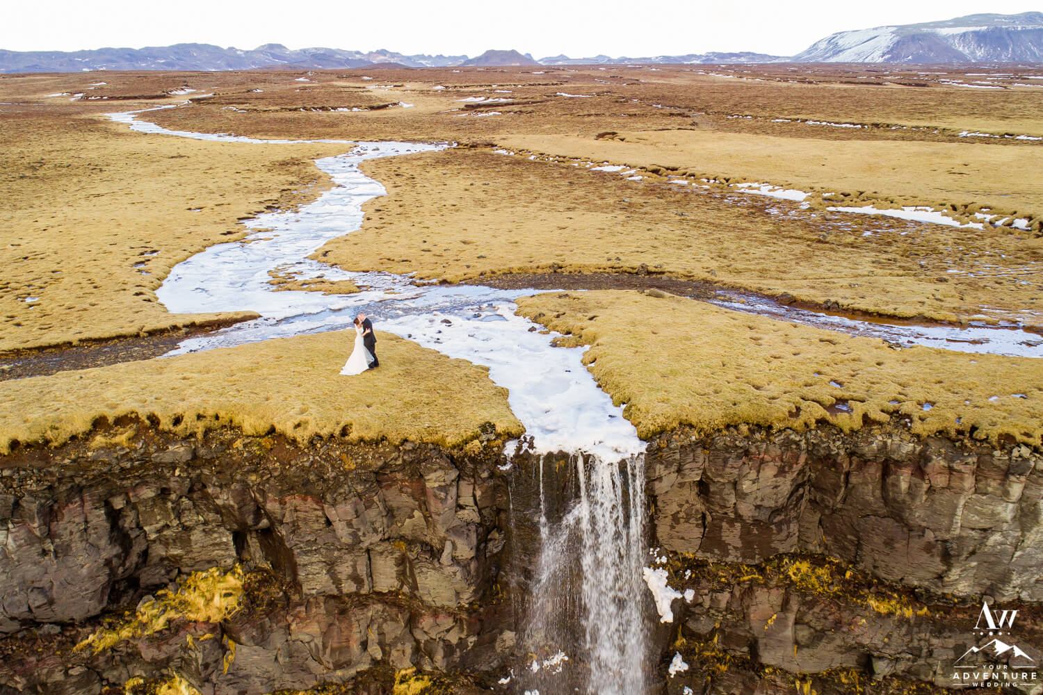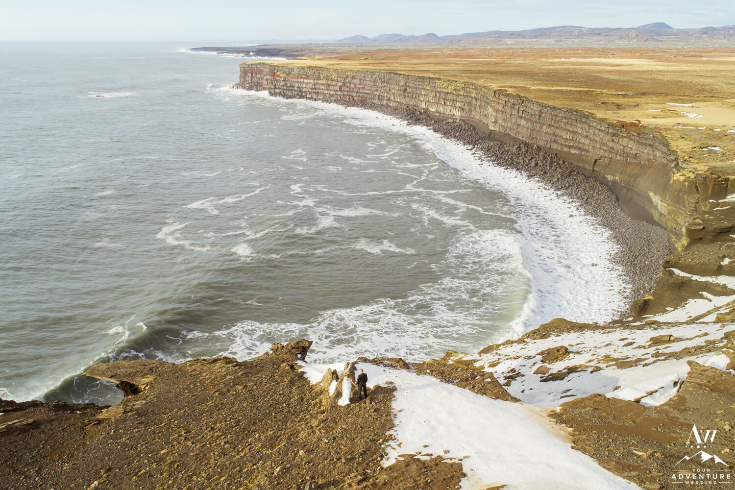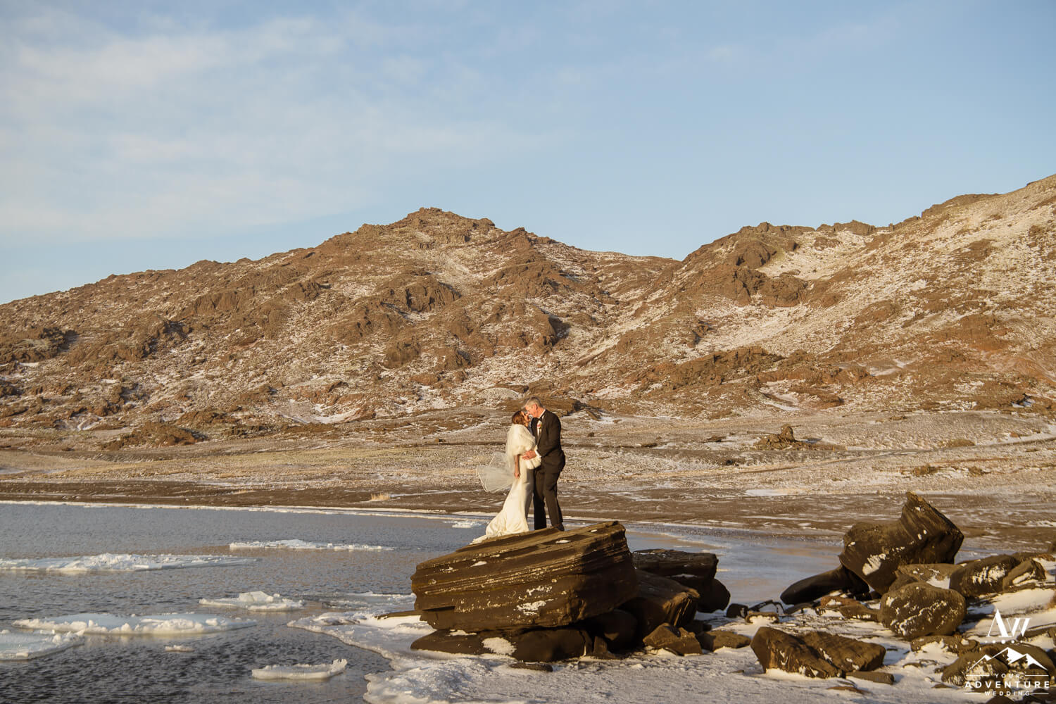 Being able to experience Iceland from the height of the top of mountains and witnessing 360 degree views on a clear day is addicting! The level of adventure gets amped up too at this specific Iceland elopement location too. Why? Because our adventure wedding photographer has to be safely tethered to the super jeep to get the incredible shots! Although the wind kicked up, our newlyweds thoroughly enjoyed this winter Iceland wedding spot.