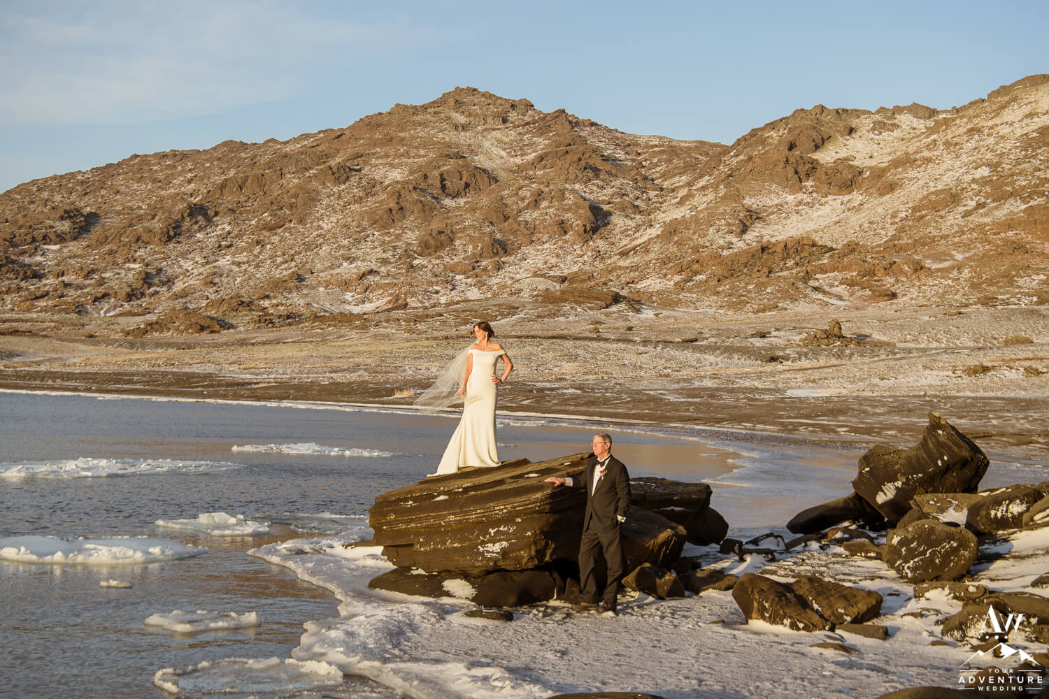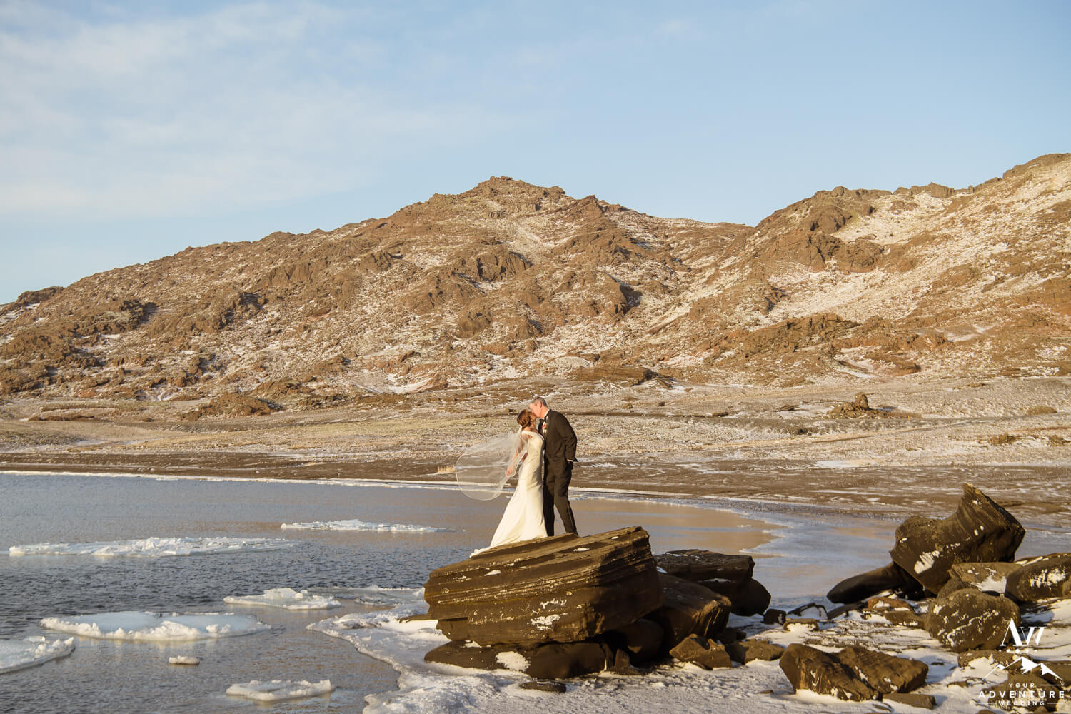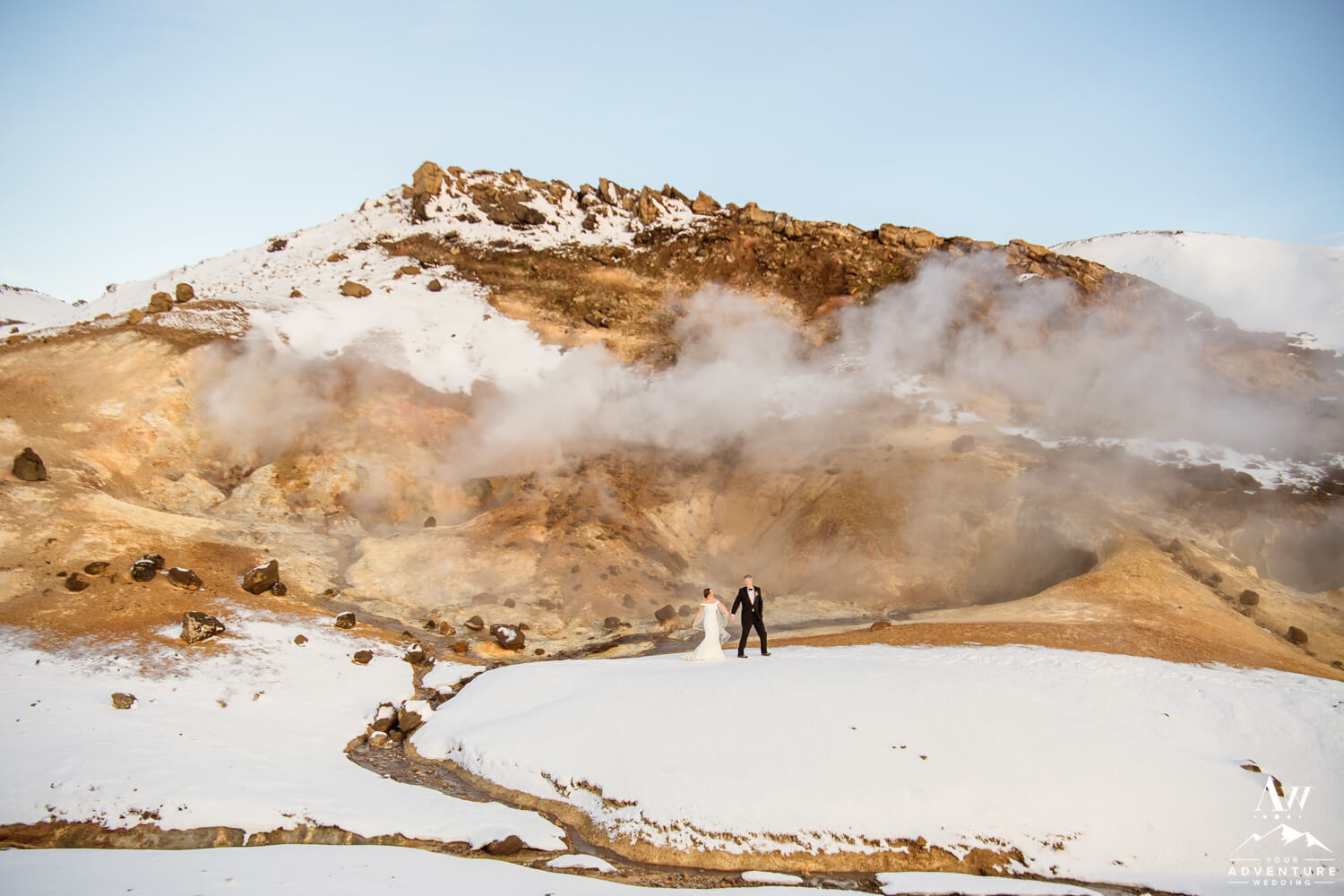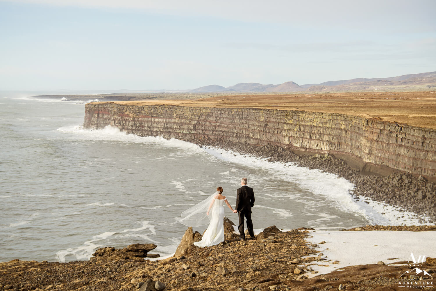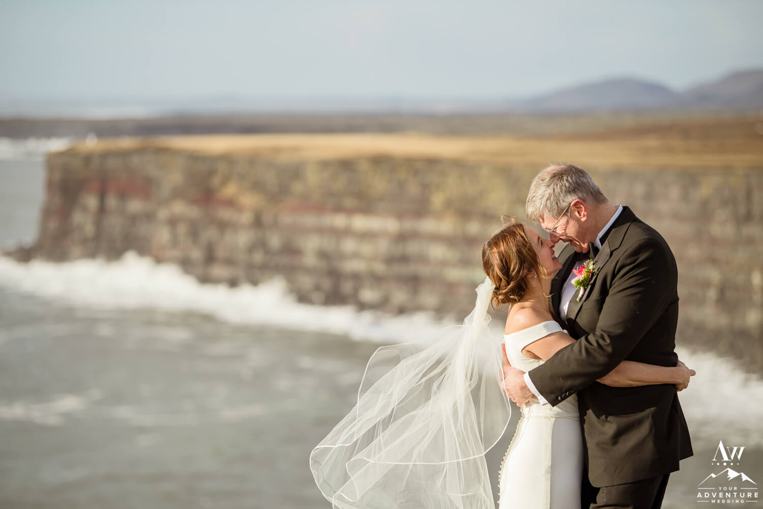 Being able to experience Iceland from the height of the top of mountains and witnessing 360 degree views on a clear day is addicting! The level of adventure gets amped up too at this specific Iceland elopement location too. Why? Because our adventure wedding photographer has to be safely tethered to the super jeep to get the incredible shots! Although the wind kicked up, our newlyweds thoroughly enjoyed this winter Iceland wedding spot.