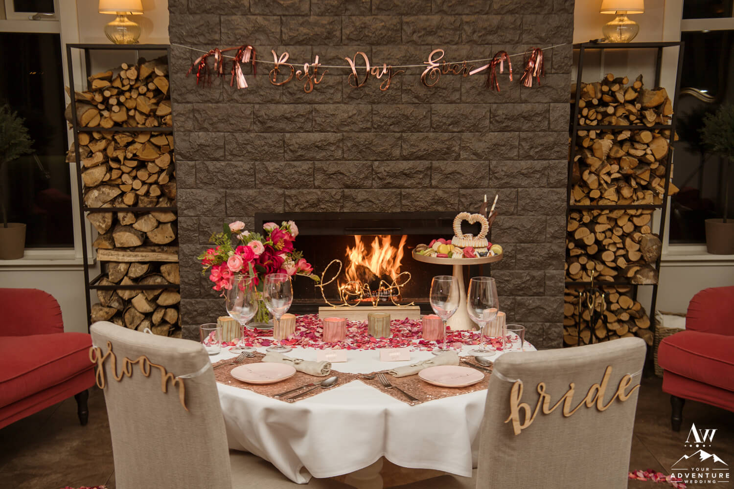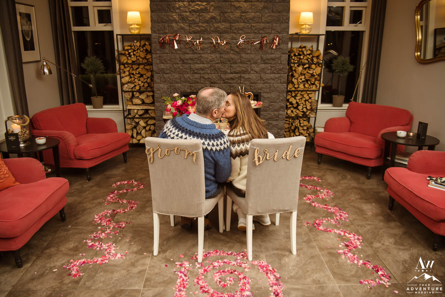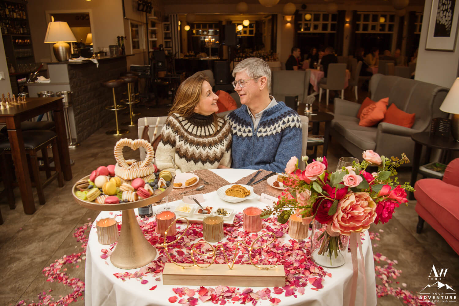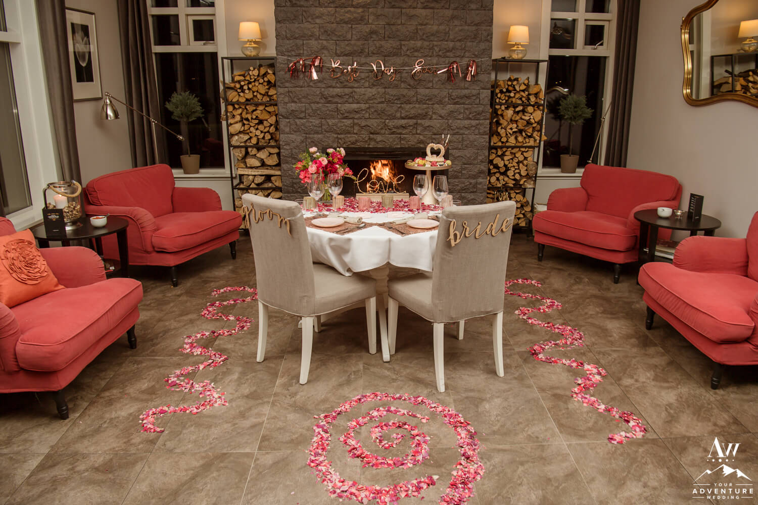Eloping in Iceland still means you can have a cozy romantic dinner that oozes luxury! To illustrate, our styling team created a themed setup of “Best Day Ever” that sat right in front of the fireplace and had bits of sparkly pinks! Firstly, the floor was adorned with freeze dried rose petals from Flyboy Naturals, which made the area even more romantic! Secondly, these two opted to change out of their wedding attire to don locally made Icelandic sweaters from The Handknitting Association of Iceland.