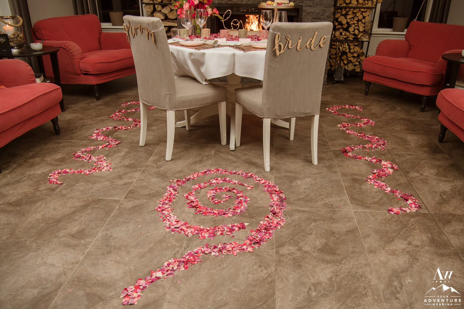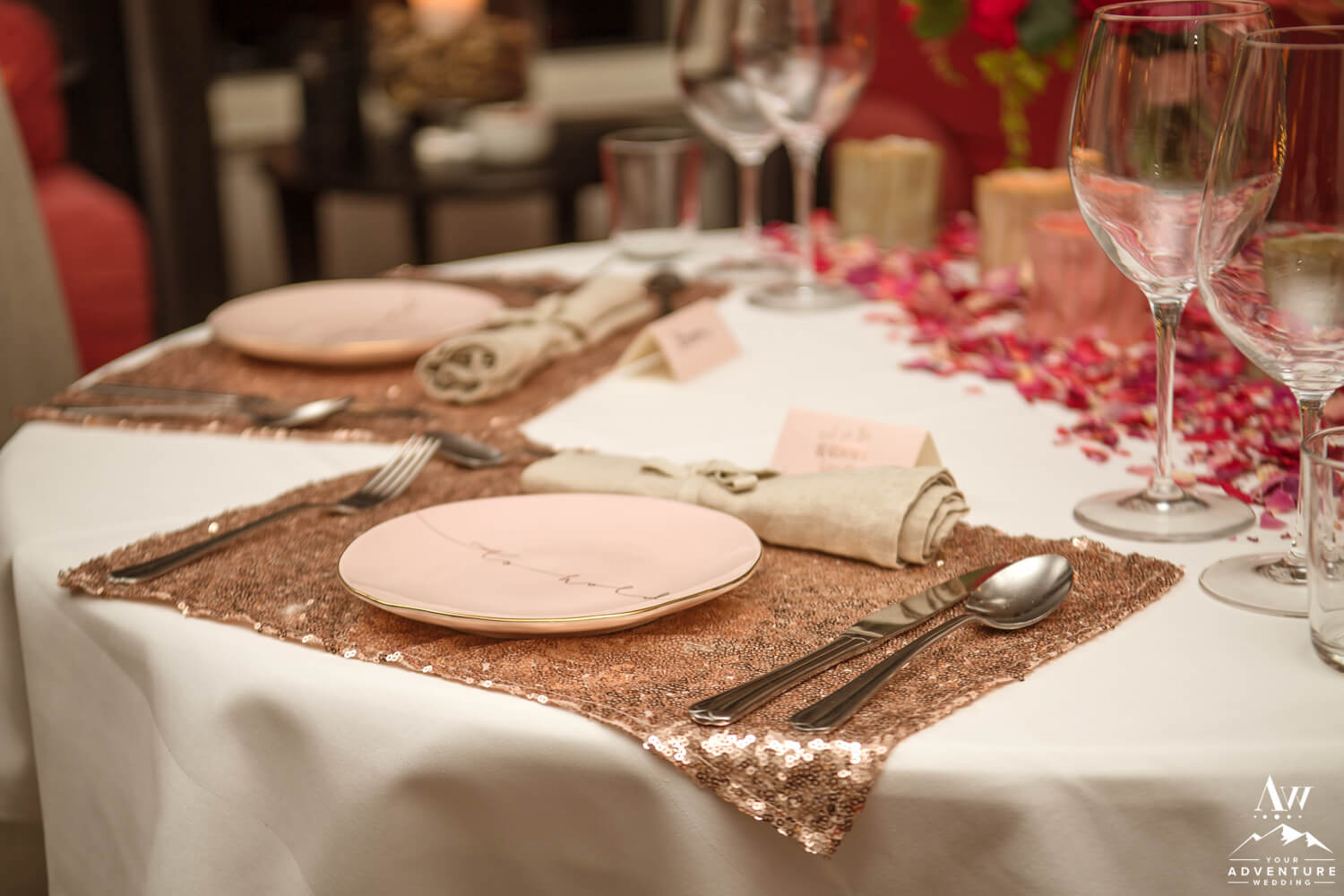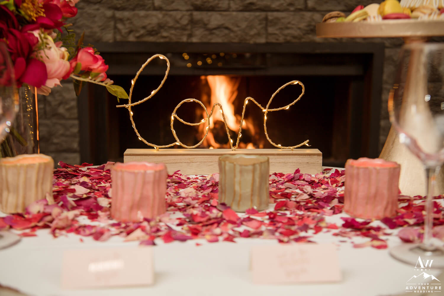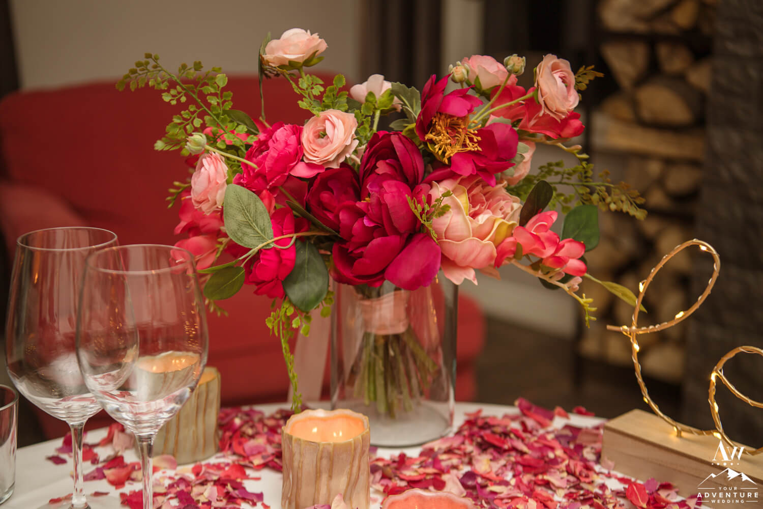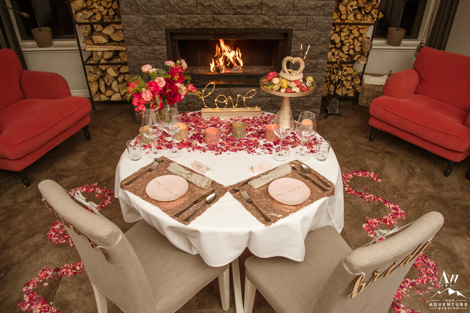 Eloping in Iceland still means you can have a cozy romantic dinner that oozes luxury! To illustrate, our styling team created a themed setup of “Best Day Ever” that sat right in front of the fireplace and had bits of sparkly pinks! Firstly, the floor was adorned with freeze dried rose petals from Flyboy Naturals, which made the area even more romantic! Secondly, these two opted to change out of their wedding attire to don locally made Icelandic sweaters from The Handknitting Association of Iceland.