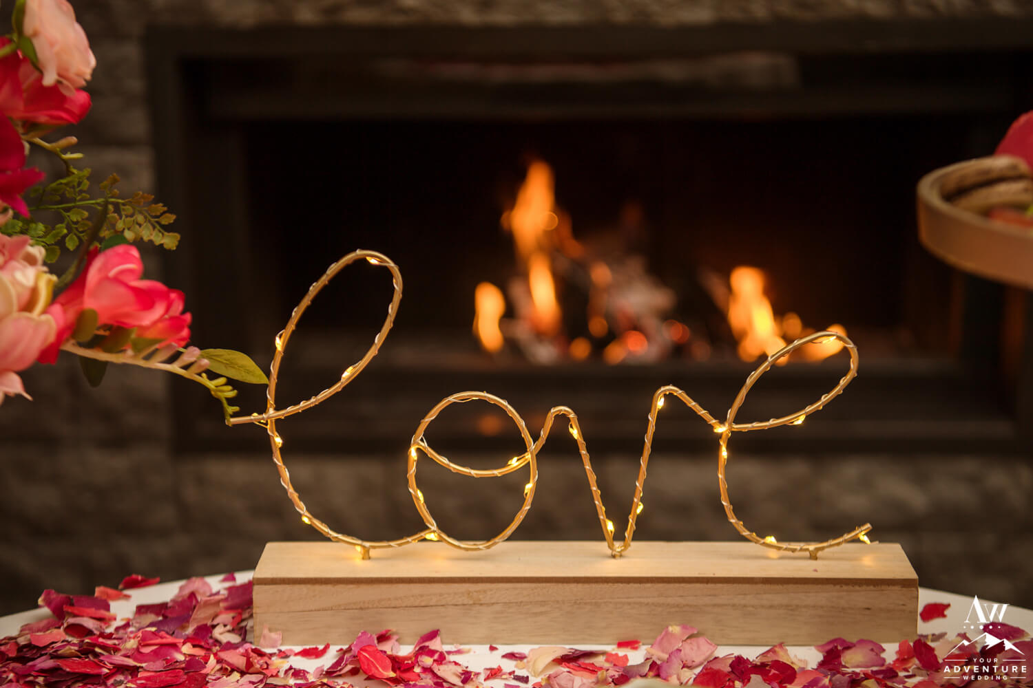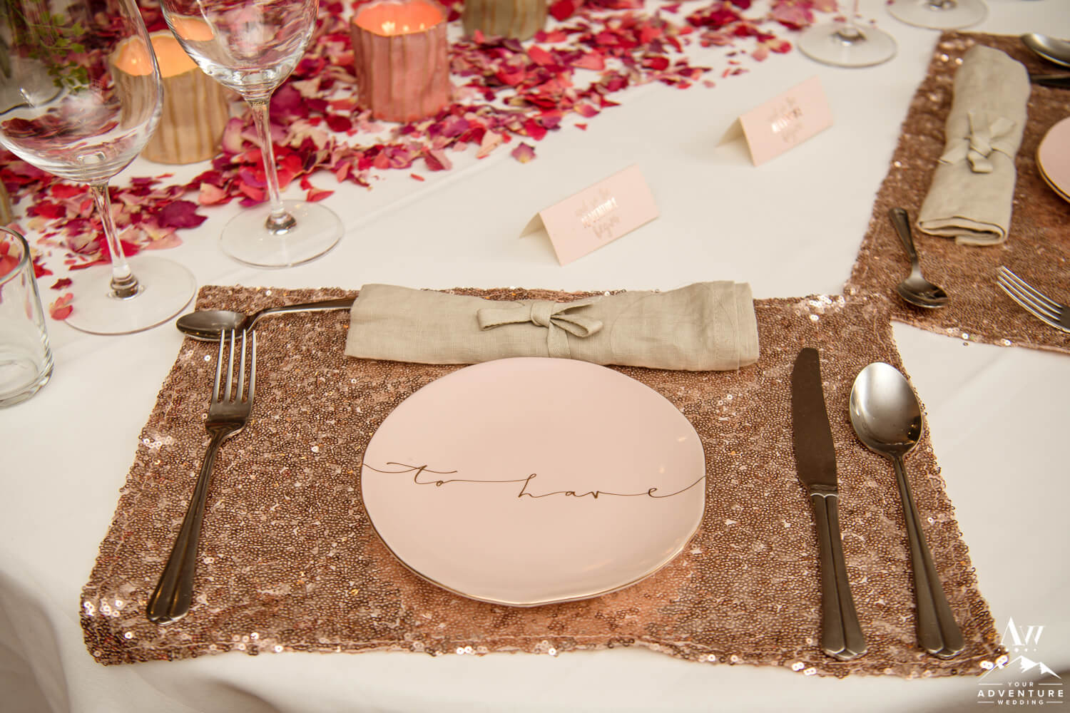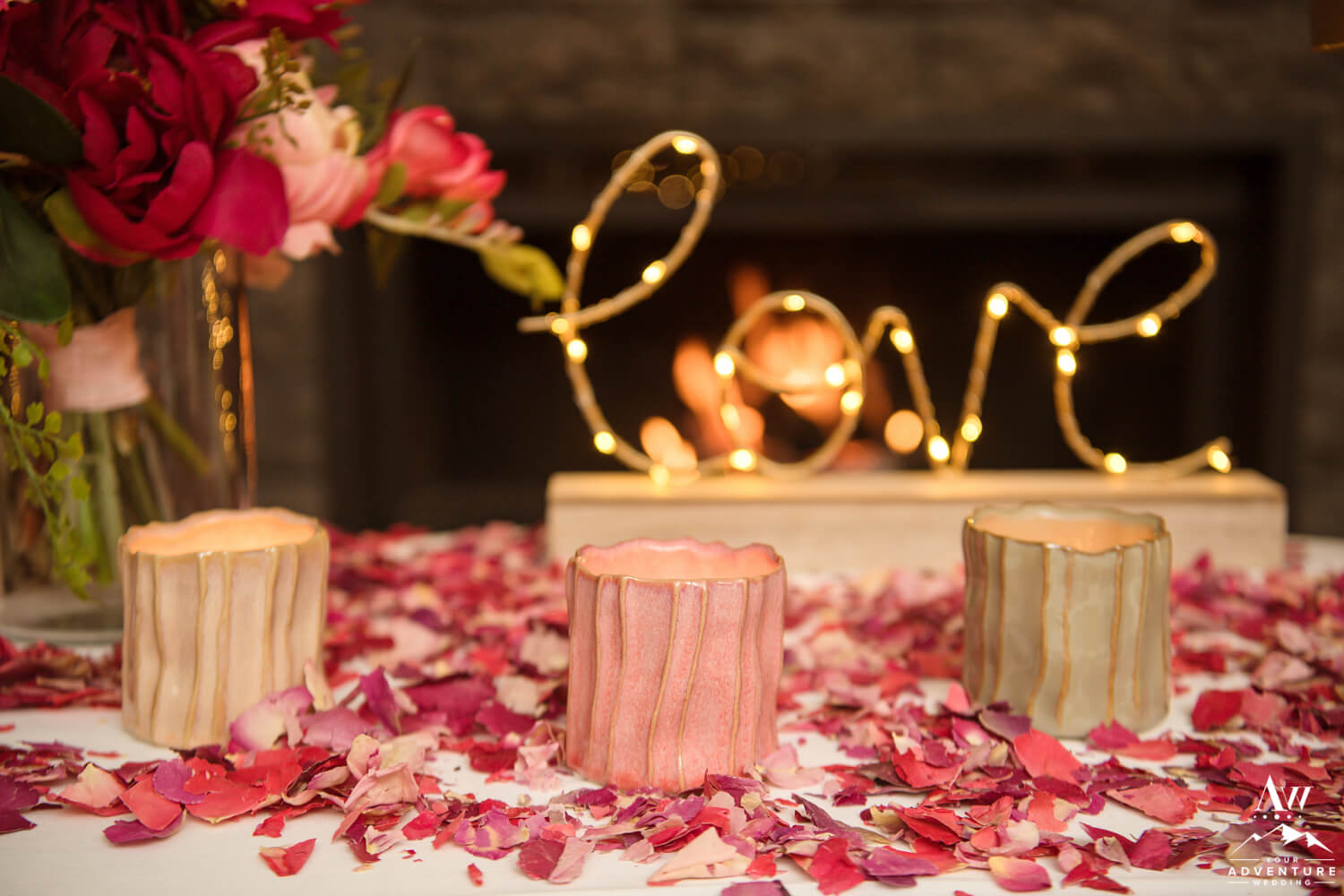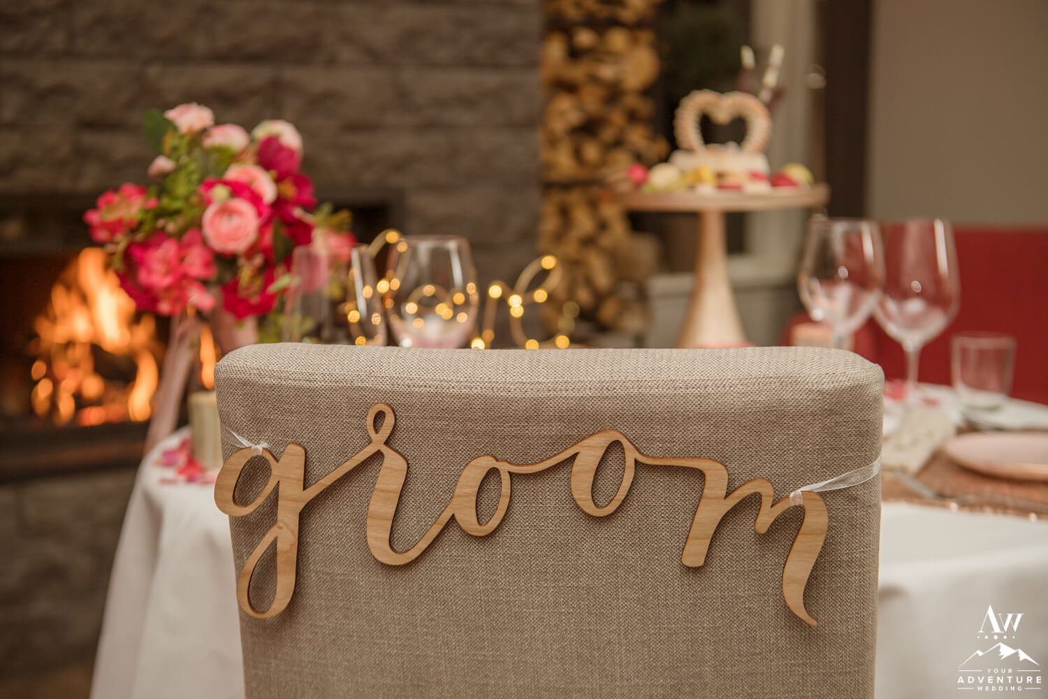 Eloping in Iceland still means you can have a cozy romantic dinner that oozes luxury! To illustrate, our styling team created a themed setup of “Best Day Ever” that sat right in front of the fireplace and had bits of sparkly pinks! Firstly, the floor was adorned with freeze dried rose petals from Flyboy Naturals, which made the area even more romantic! Secondly, these two opted to change out of their wedding attire to don locally made Icelandic sweaters from The Handknitting Association of Iceland.