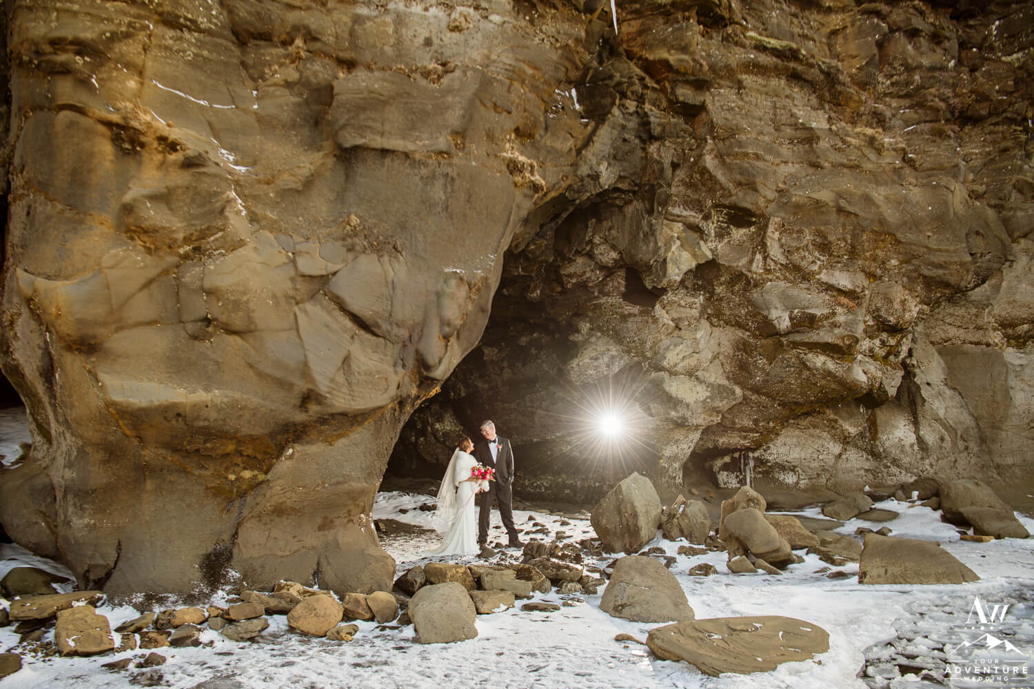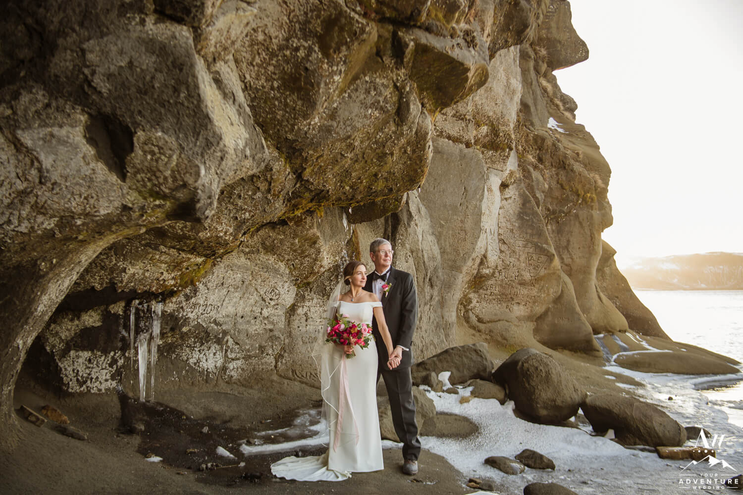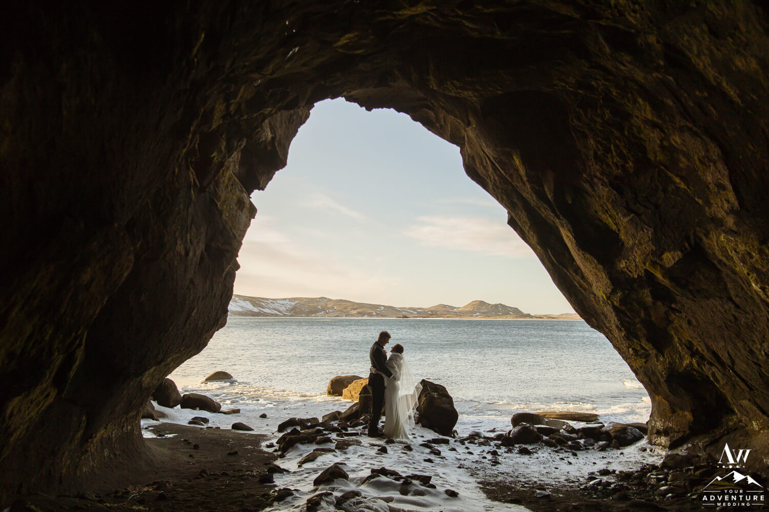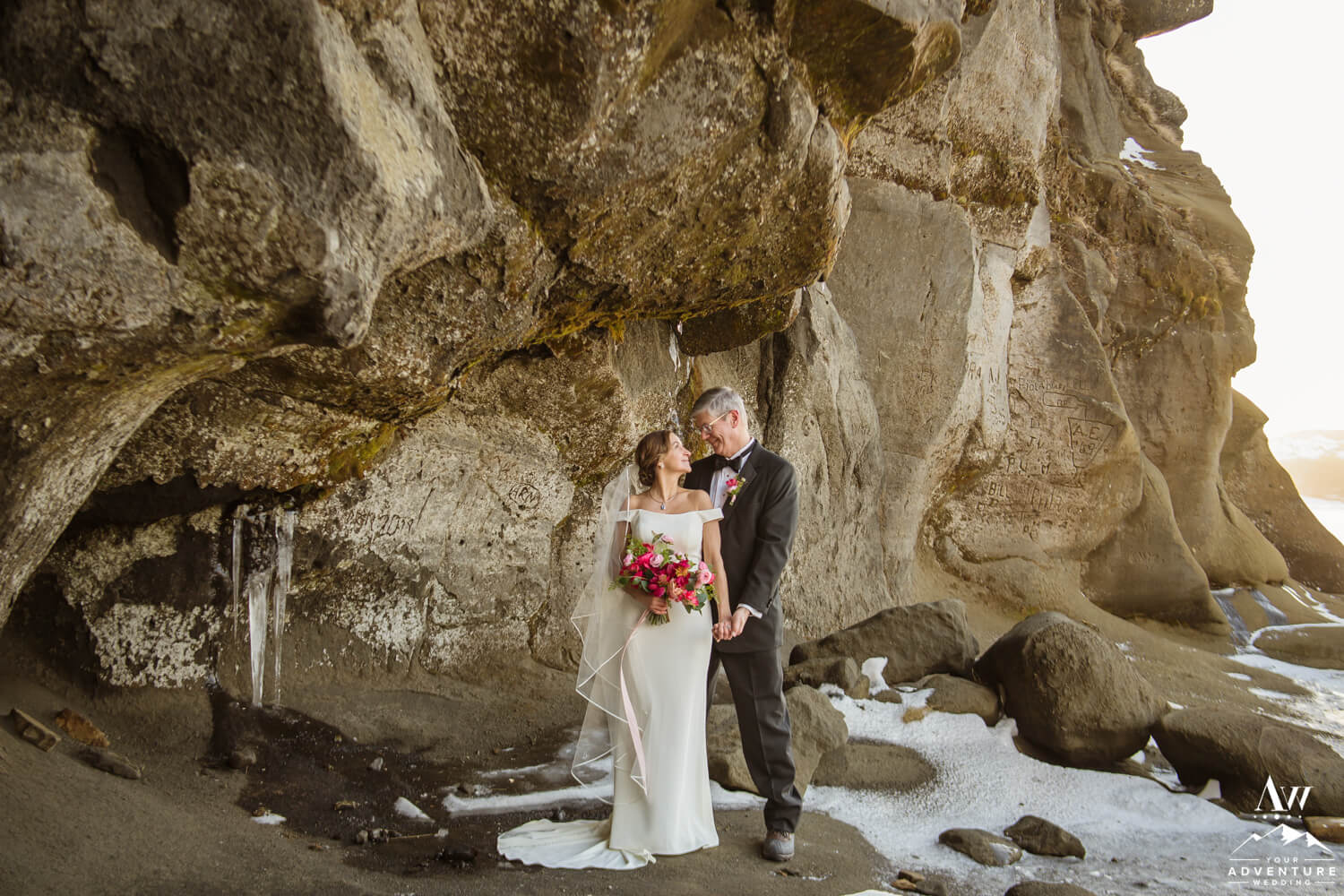 Sometimes having an Iceland cave wedding ceremony is a smart decision regardless of the weather. In fact, in Mark and Janine’s case they just wanted to ensure they would be sheltered from the wind regardless of what the weather was doing. Further, they also wanted to be able to be relaxed while they experienced their Iceland winter wedding ceremony. Next, after their cave elopement, they explored the area inside and out with their talented local wedding photographer.