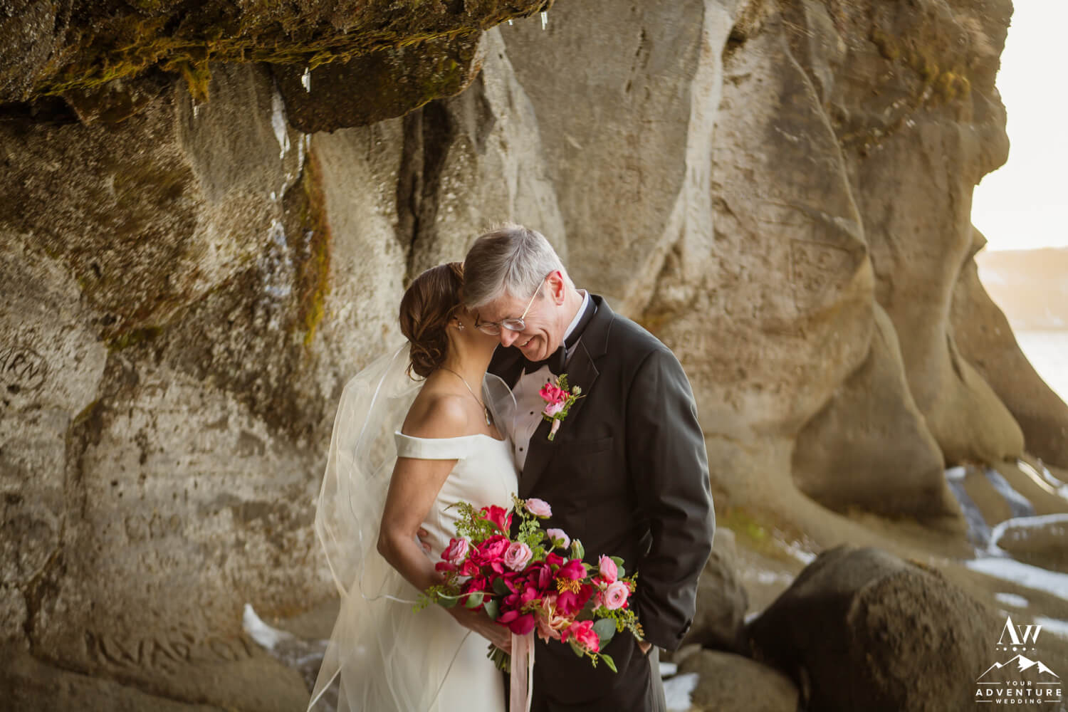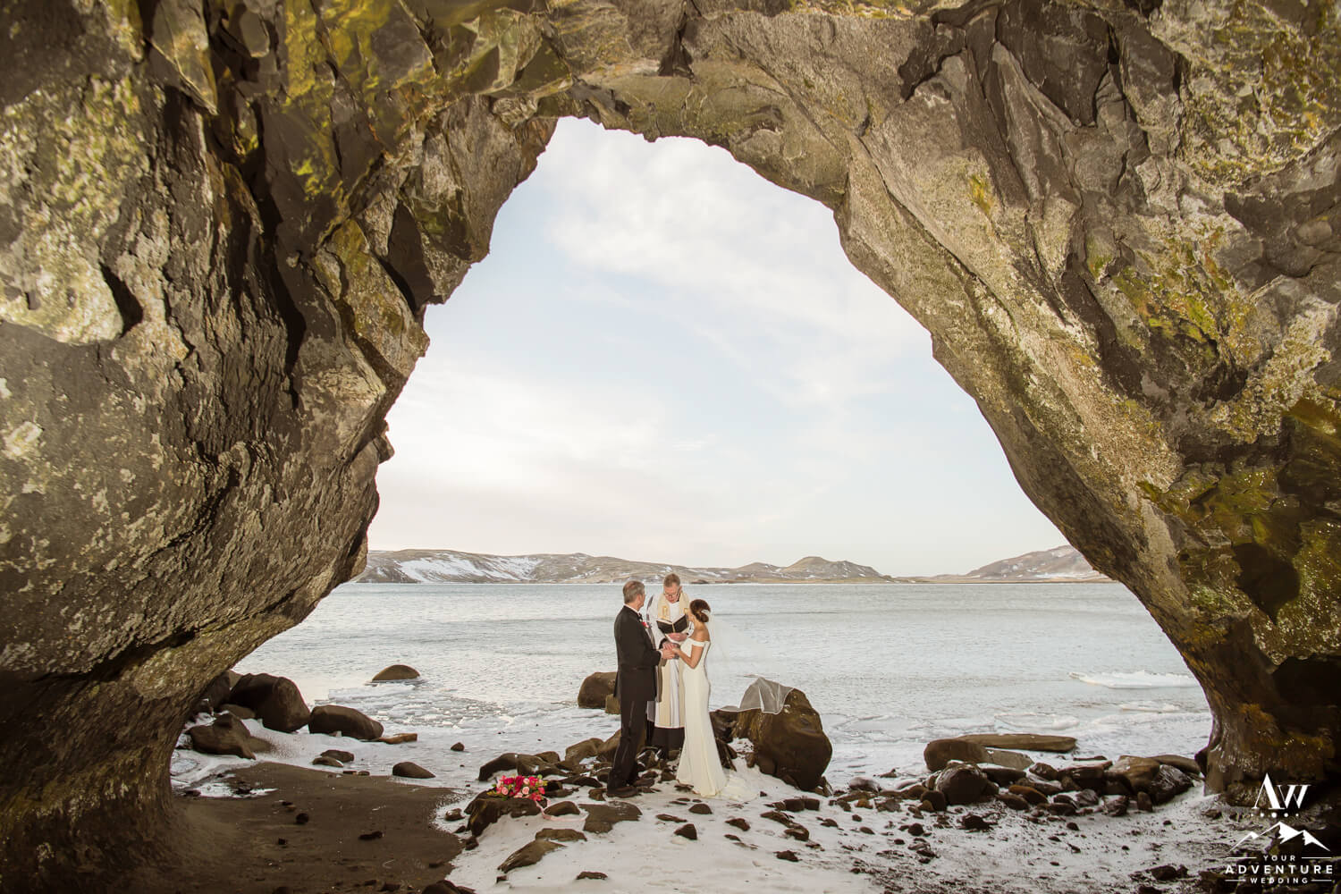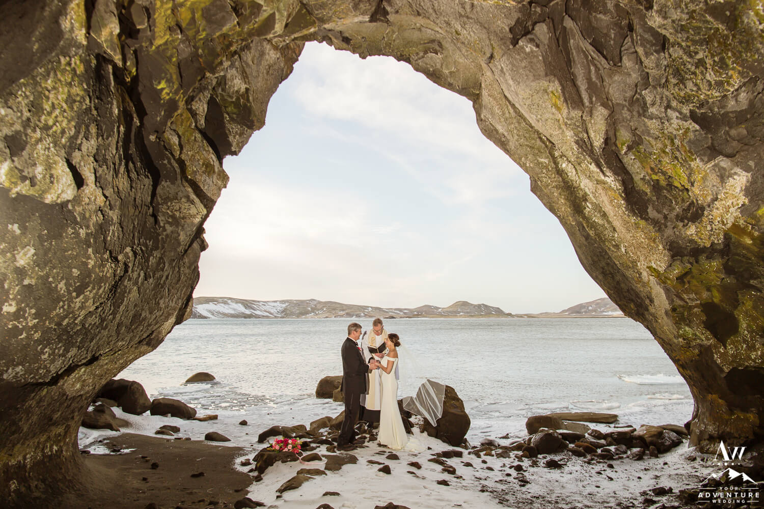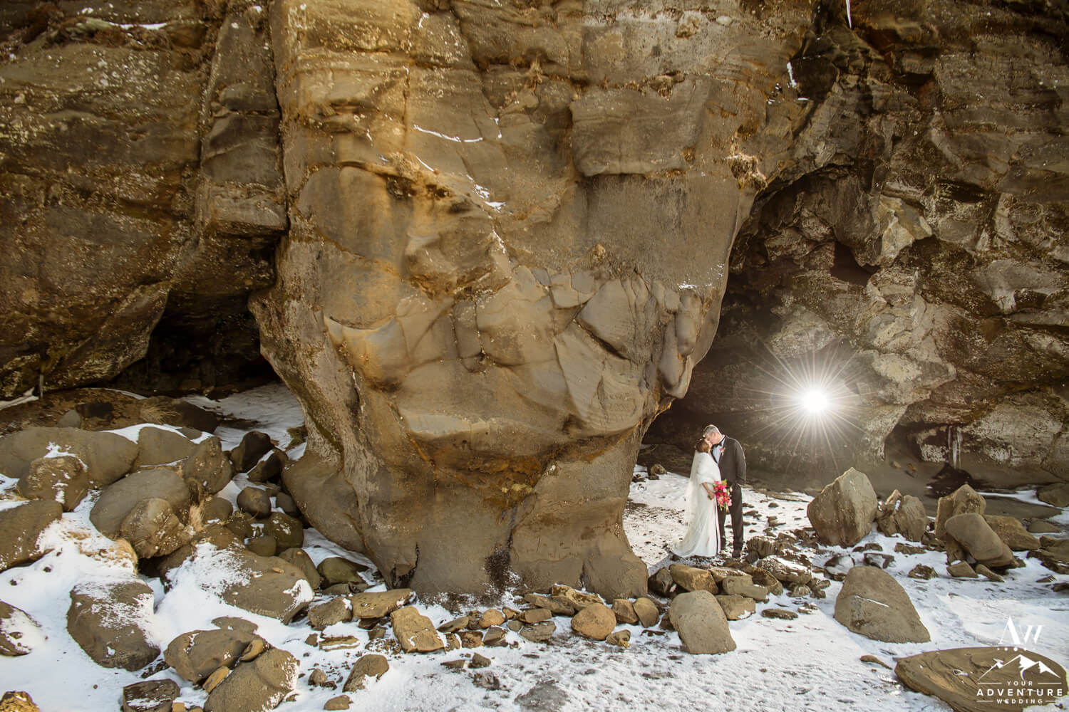 Sometimes having an Iceland cave wedding ceremony is a smart decision regardless of the weather. In fact, in Mark and Janine’s case they just wanted to ensure they would be sheltered from the wind regardless of what the weather was doing. Further, they also wanted to be able to be relaxed while they experienced their Iceland winter wedding ceremony. Next, after their cave elopement, they explored the area inside and out with their talented local wedding photographer.