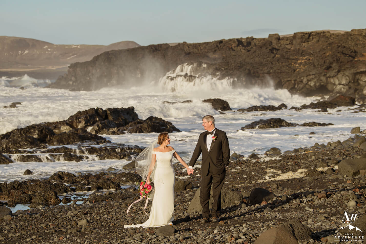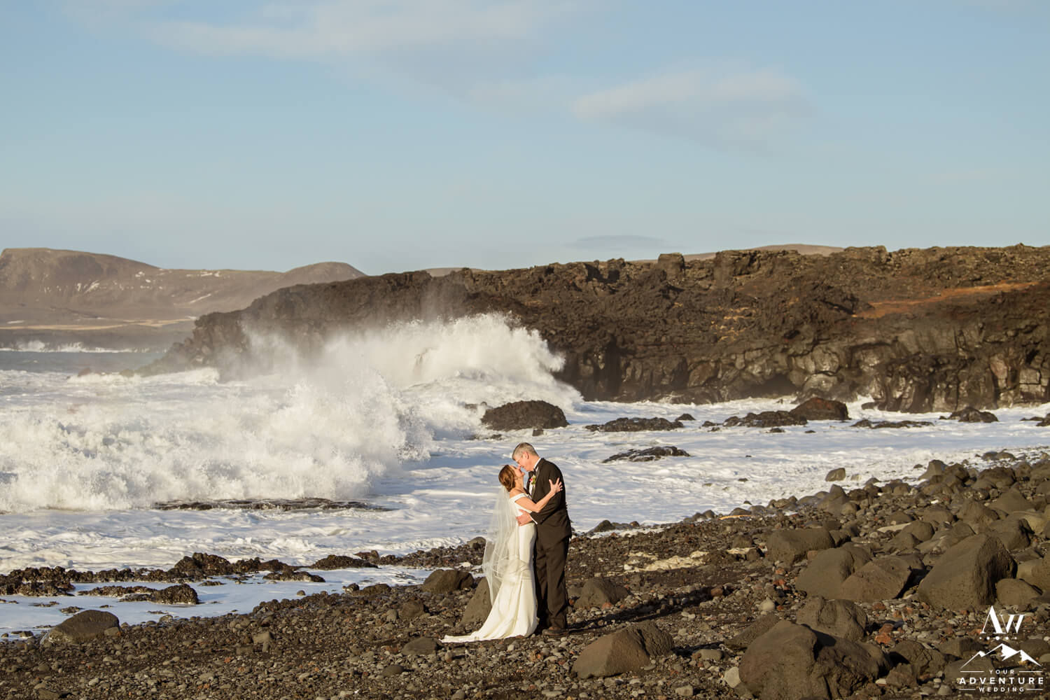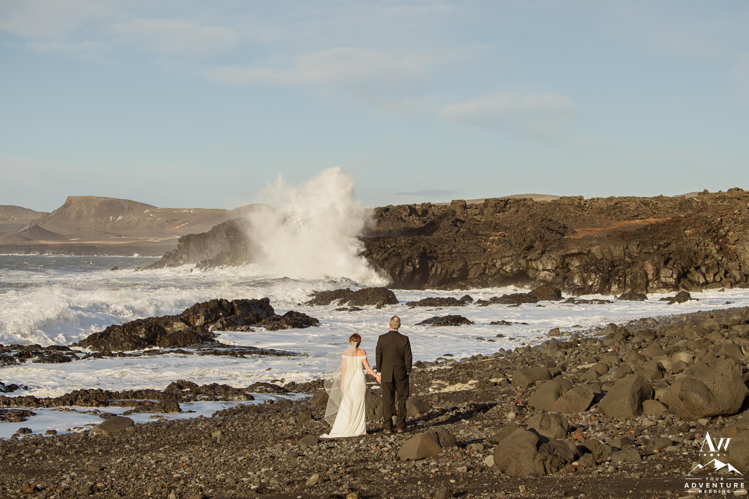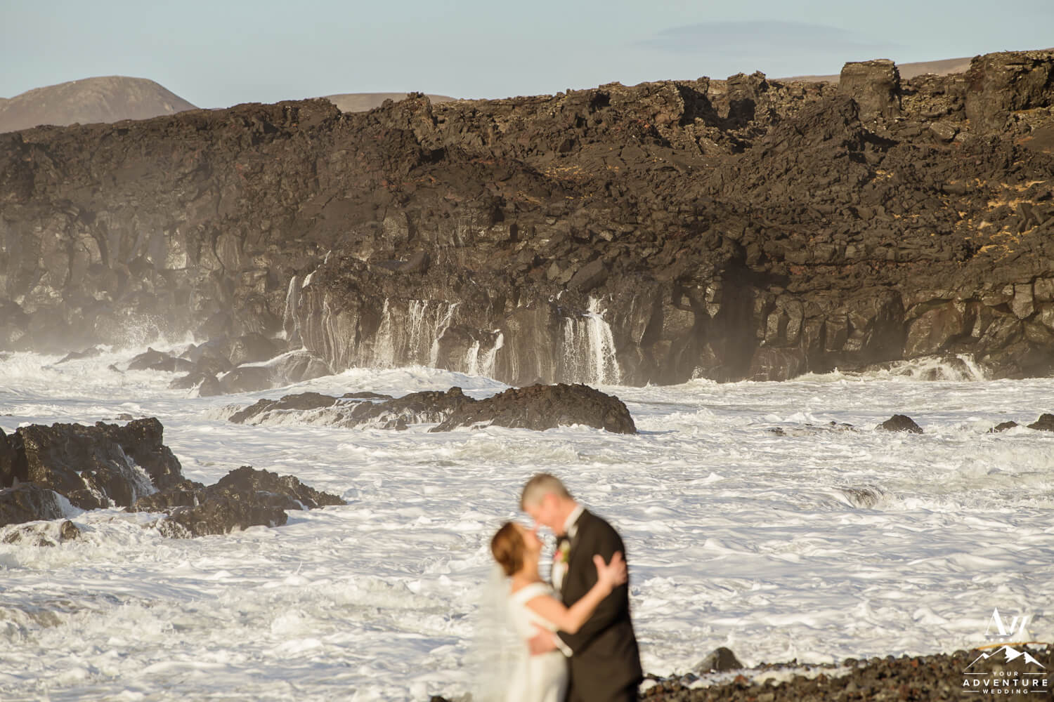 There is something about the combination of lava rocks and rolling ocean waves that is really inspiring. I don’t know if it’s the history that runs through the rocks, the power of the waves, or the fact that the waves hitting the lava walls can create a unique waterfall! For instance, as many times as our team has visited this gorgeous black beach, it seems like the area changes. Furthermore, this specific day, the waves were so strong that it created what looked like a waterfall in the lava walls allowing the opportunity for EPIC winter Iceland wedding photos!