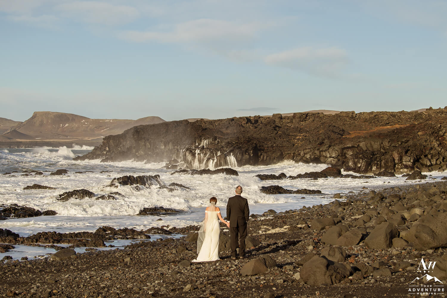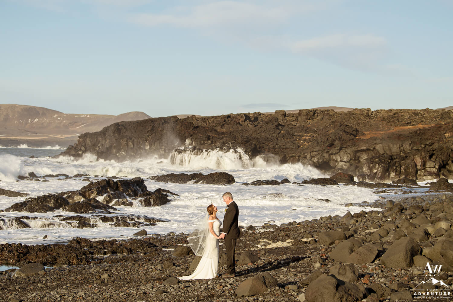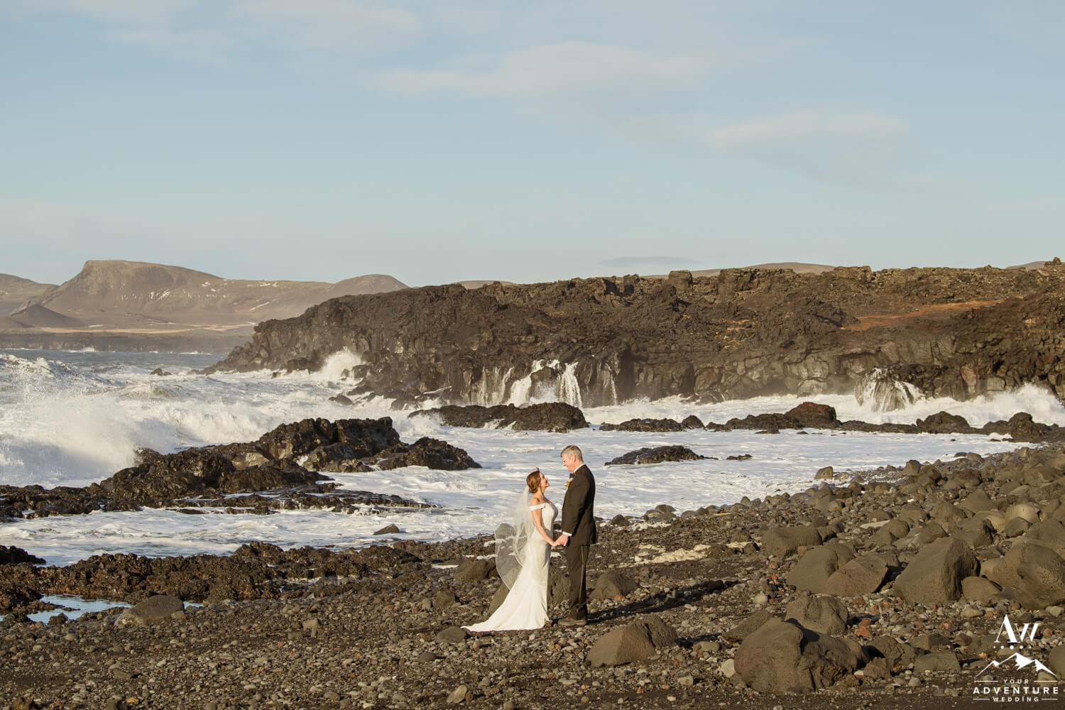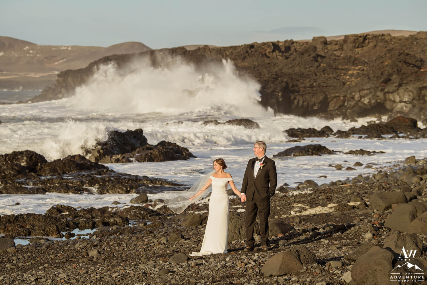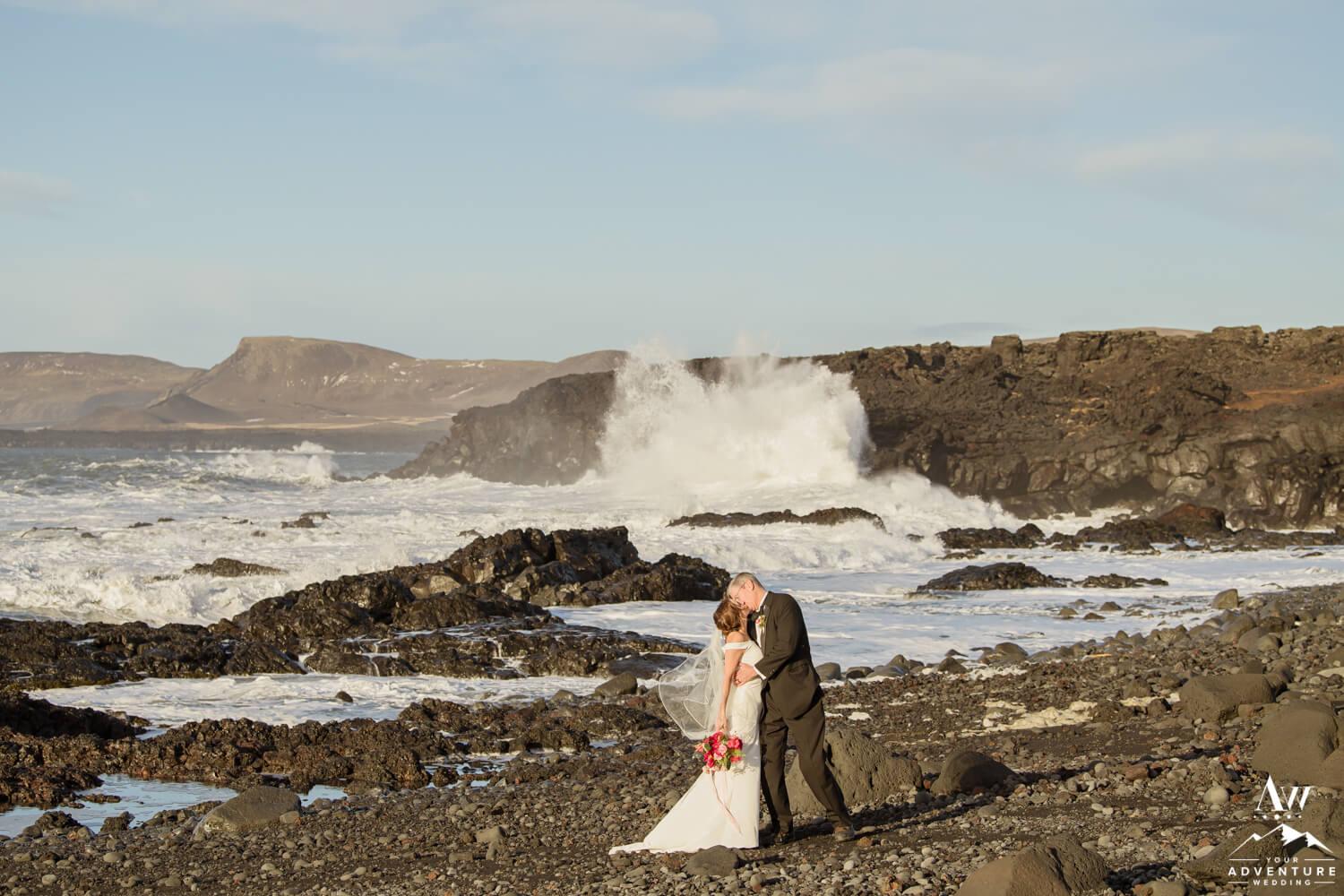 There is something about the combination of lava rocks and rolling ocean waves that is really inspiring. I don’t know if it’s the history that runs through the rocks, the power of the waves, or the fact that the waves hitting the lava walls can create a unique waterfall! For instance, as many times as our team has visited this gorgeous black beach, it seems like the area changes. Furthermore, this specific day, the waves were so strong that it created what looked like a waterfall in the lava walls allowing the opportunity for EPIC winter Iceland wedding photos!