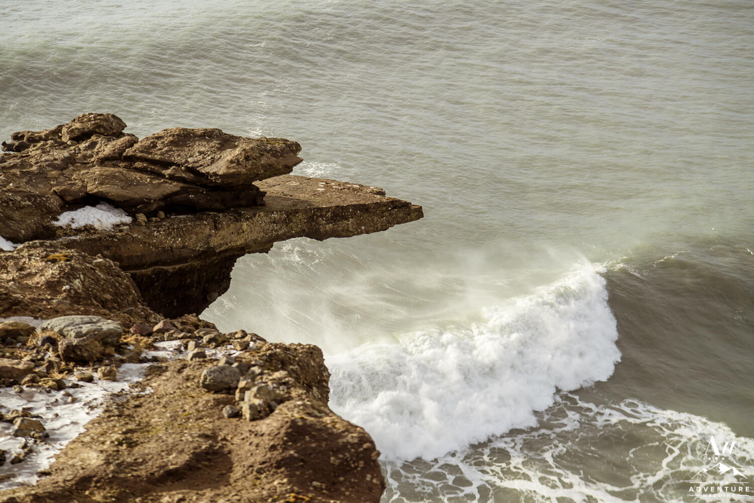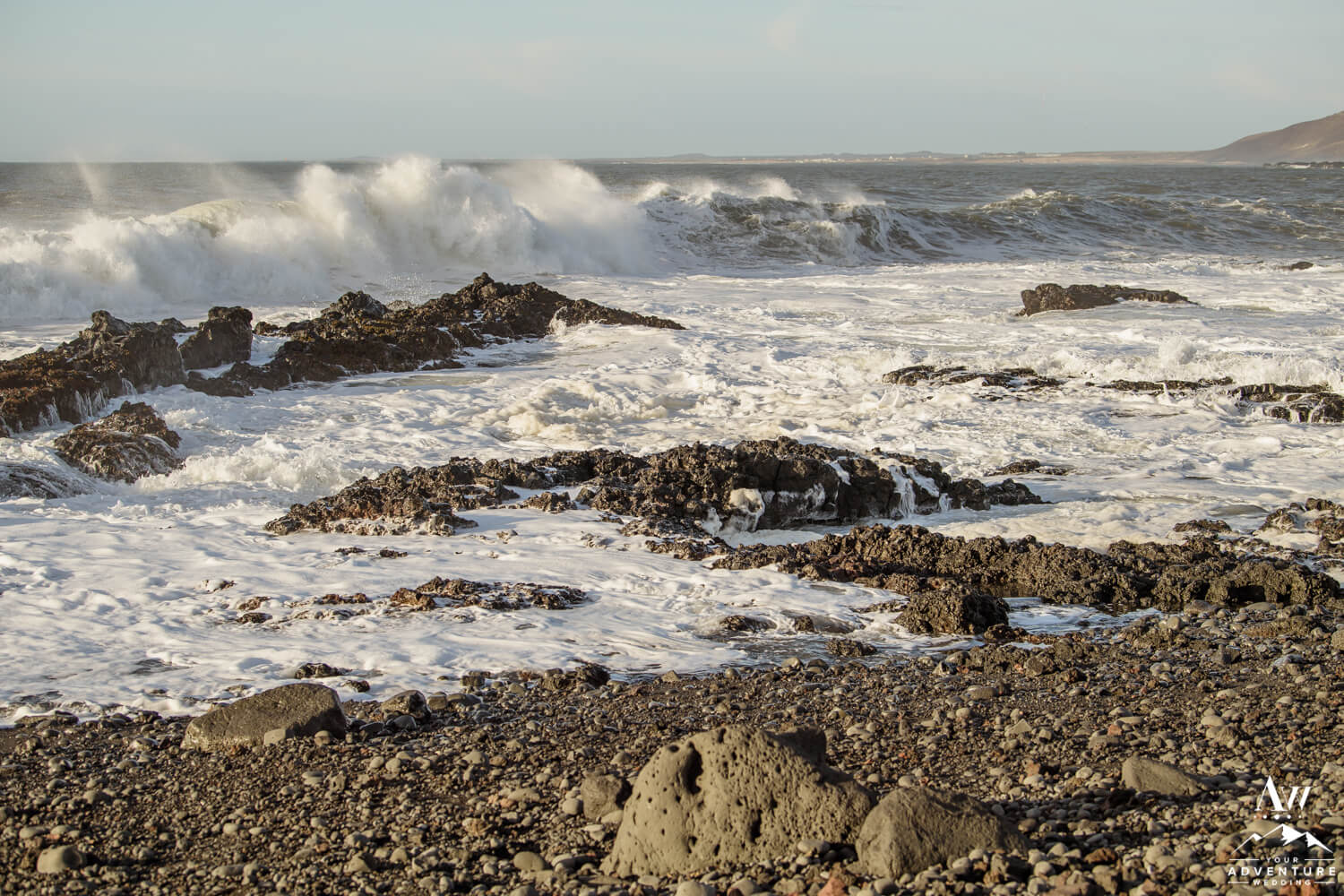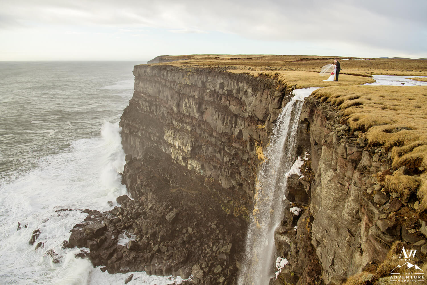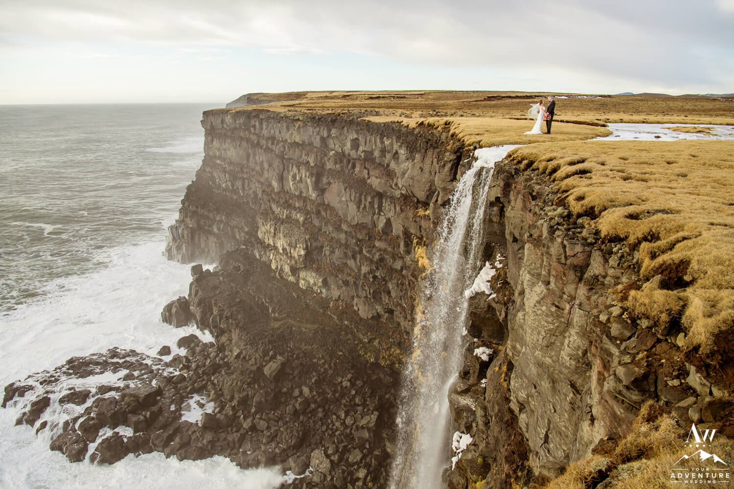 There is something about the combination of lava rocks and rolling ocean waves that is really inspiring. I don’t know if it’s the history that runs through the rocks, the power of the waves, or the fact that the waves hitting the lava walls can create a unique waterfall! For instance, as many times as our team has visited this gorgeous black beach, it seems like the area changes. Furthermore, this specific day, the waves were so strong that it created what looked like a waterfall in the lava walls allowing the opportunity for EPIC winter Iceland wedding photos!