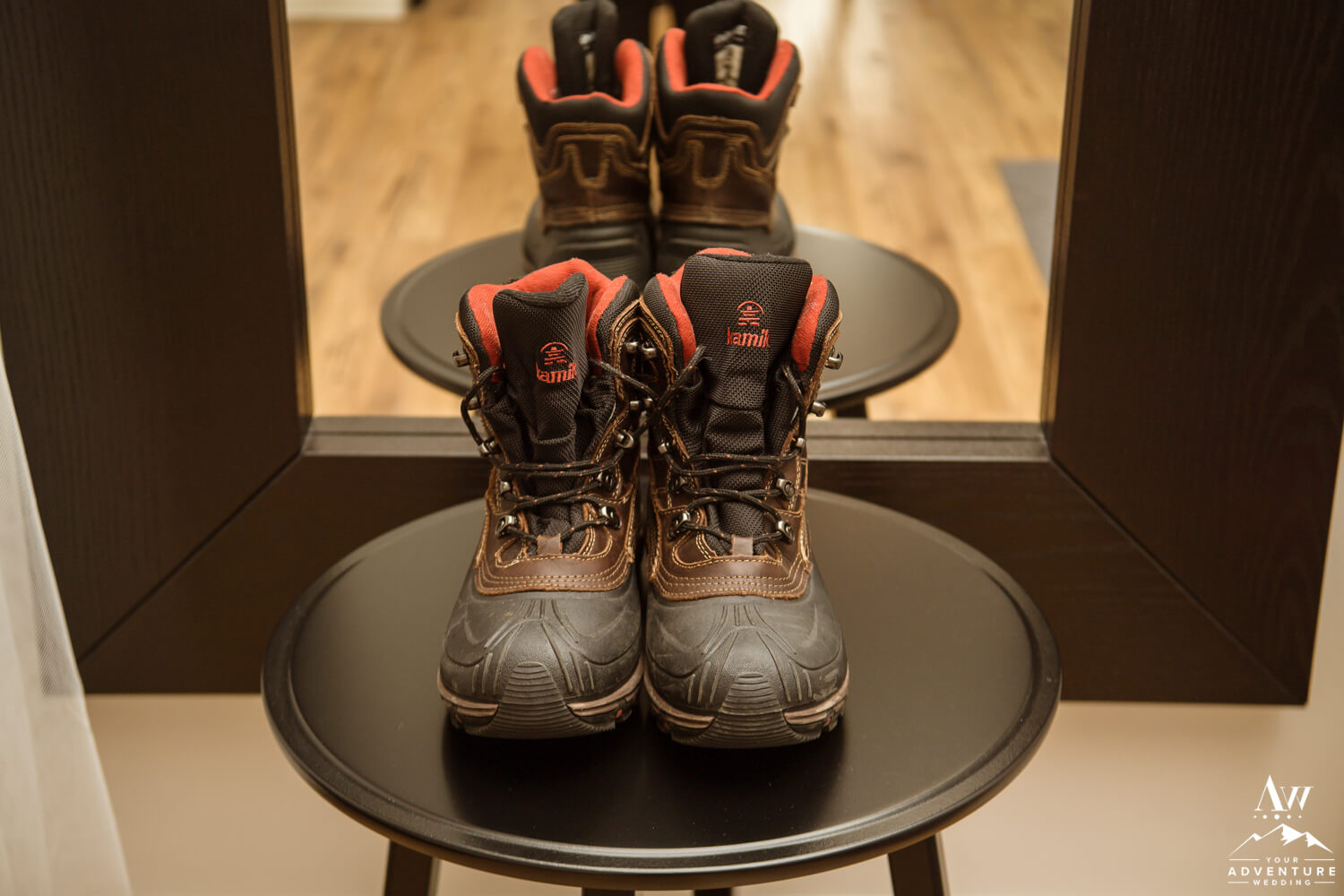 Morning brought a very early start in their Luxury Suite at Hotel Grimsborgir. Our hair stylist and Iceland elopement photographer went to work crafting! How fun is it that Janine surprised Mark with a day of gift too of custom cuff links! Following a delicious breakfast, getting their wedding attire on, and grabbing their “go bags” they were ready to load into the super jeep to begin their Iceland winter wedding adventure!