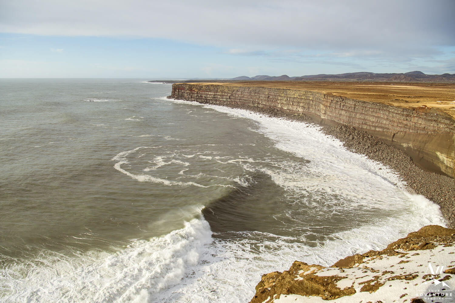Regardless if the sun shines or not these cliffs, they sparkle! Visiting this Iceland golden cliff area, you need to know, part is within the Reykjanes GeoPark (lower part) and the other is on private property (higher area). Please be mindful and respectful by being a responsible tourist as you enjoy. Likewise, make sure you are also keeping a safe distance (like 2 body lengths or more) from the cliff edge. Areas like this could have erosion that is not visible which in turn could than turn into a landslide.