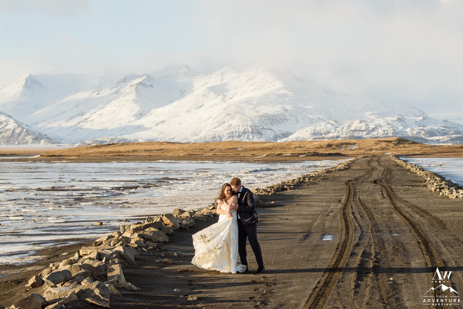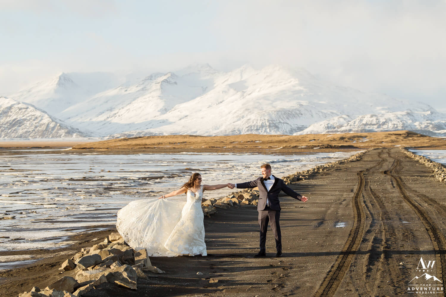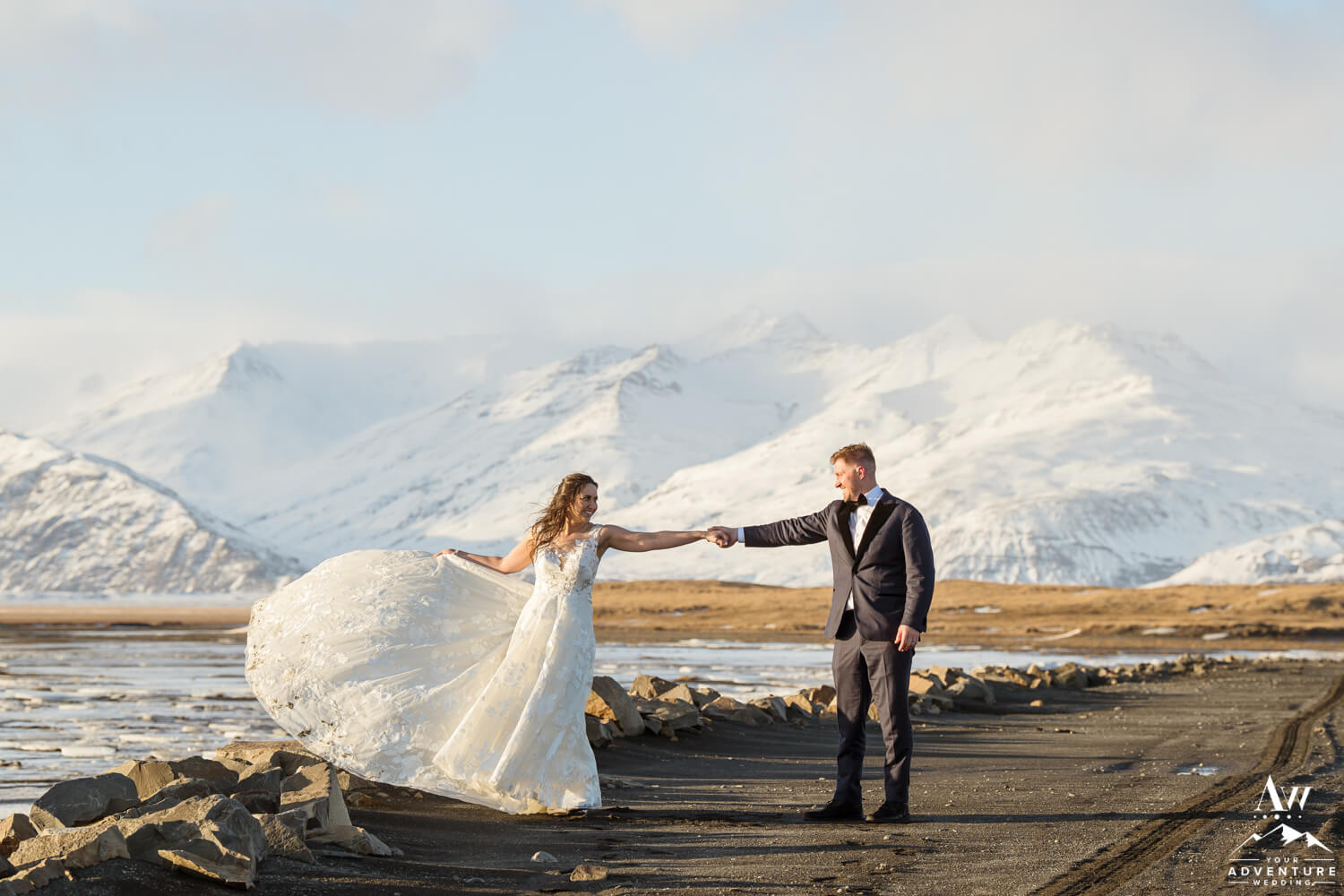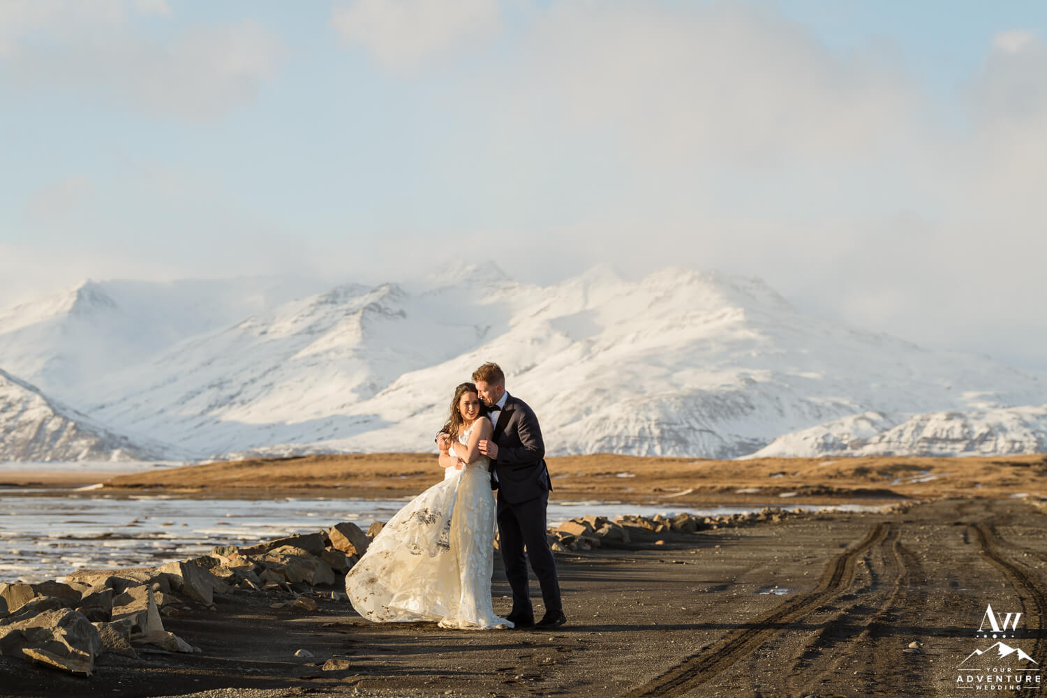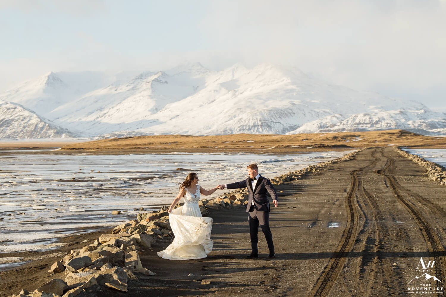 Hiking about an hour after the frozen glacier lake elopement, back to the super jeep, it was time to warm up and continue on with their adventurous day. Did you know East Iceland is known for having Iceland’s tallest mountain and reindeer? It just so happened Kristina and Ben experienced both! Further, the schedule continues on with gorgeous warm sunlight on an offbeat black beach road which had the most incredible mountain view… Kristina busted out her veil for a few Iceland elopement photos and they shared some super fun dance moves!
