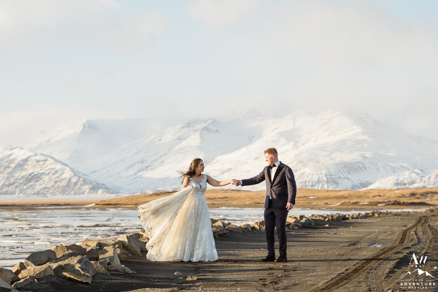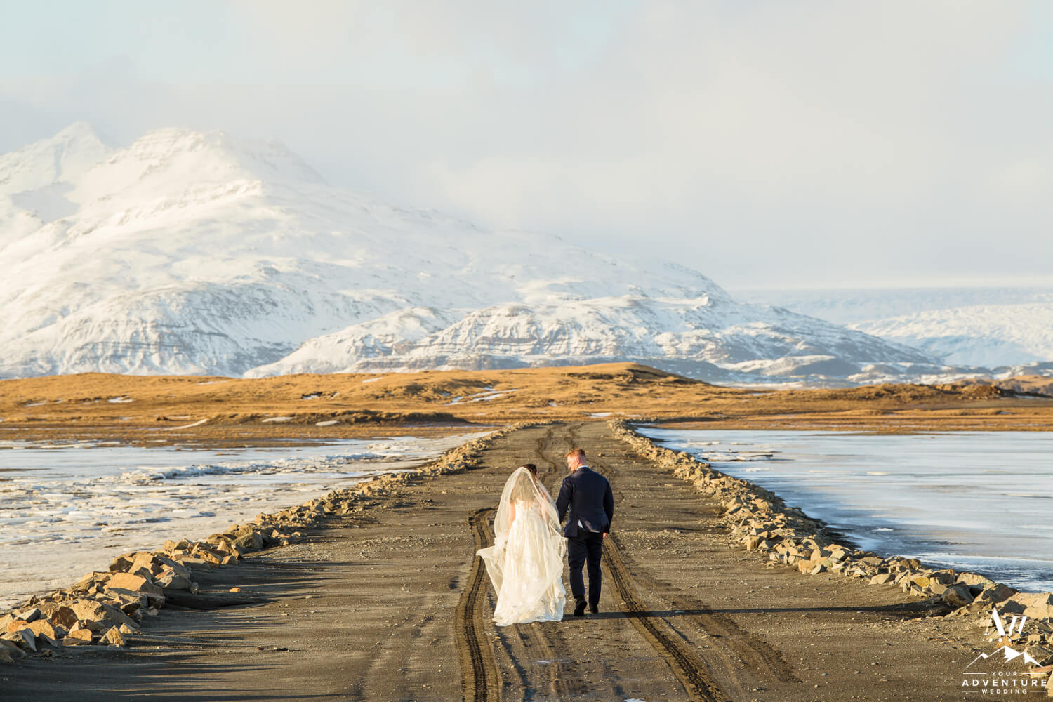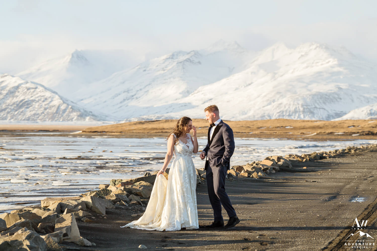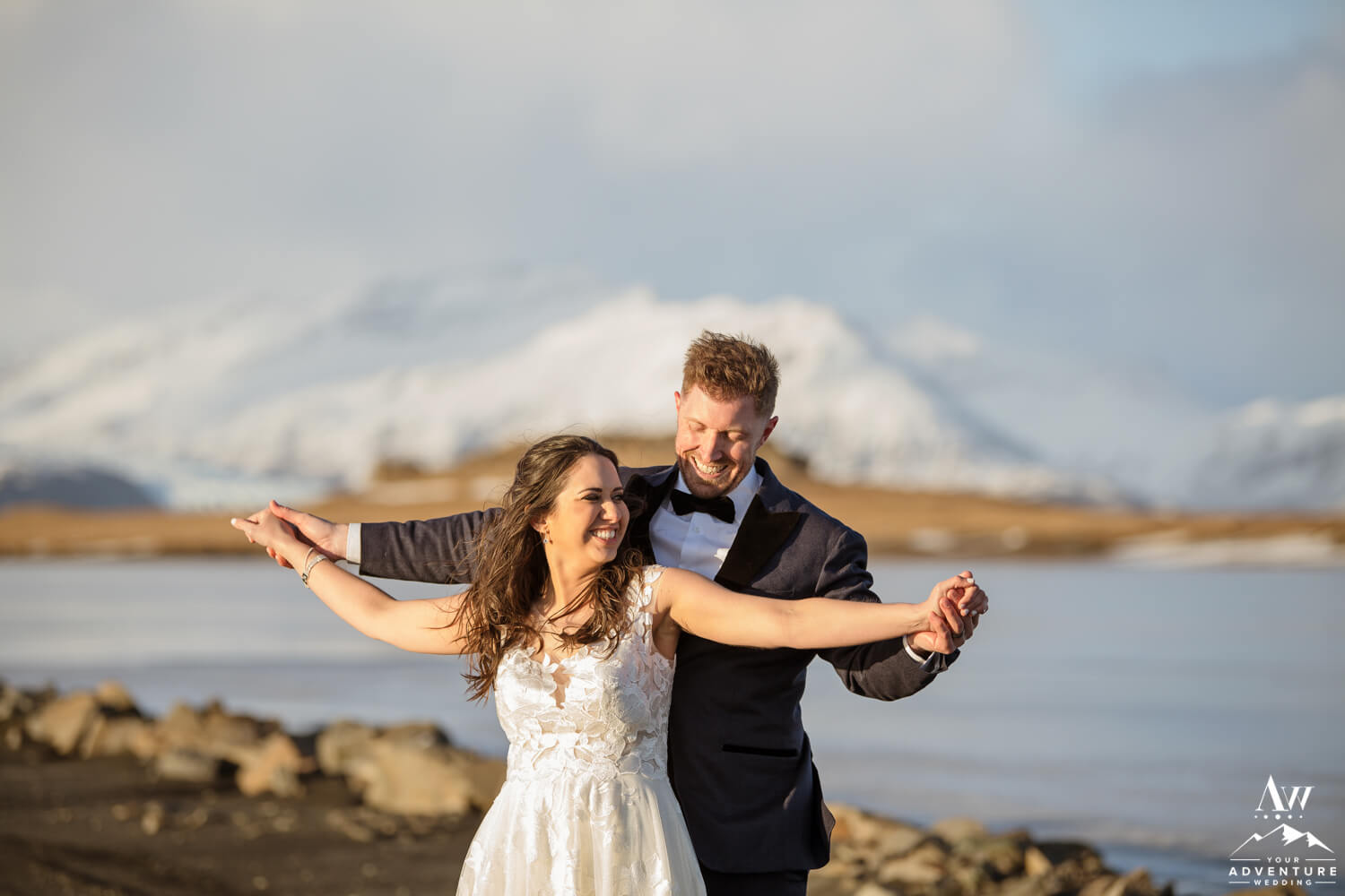 Hiking about an hour after the frozen glacier lake elopement, back to the super jeep, it was time to warm up and continue on with their adventurous day. Did you know East Iceland is known for having Iceland’s tallest mountain and reindeer? It just so happened Kristina and Ben experienced both! Further, the schedule continues on with gorgeous warm sunlight on an offbeat black beach road which had the most incredible mountain view… Kristina busted out her veil for a few Iceland elopement photos and they shared some super fun dance moves!