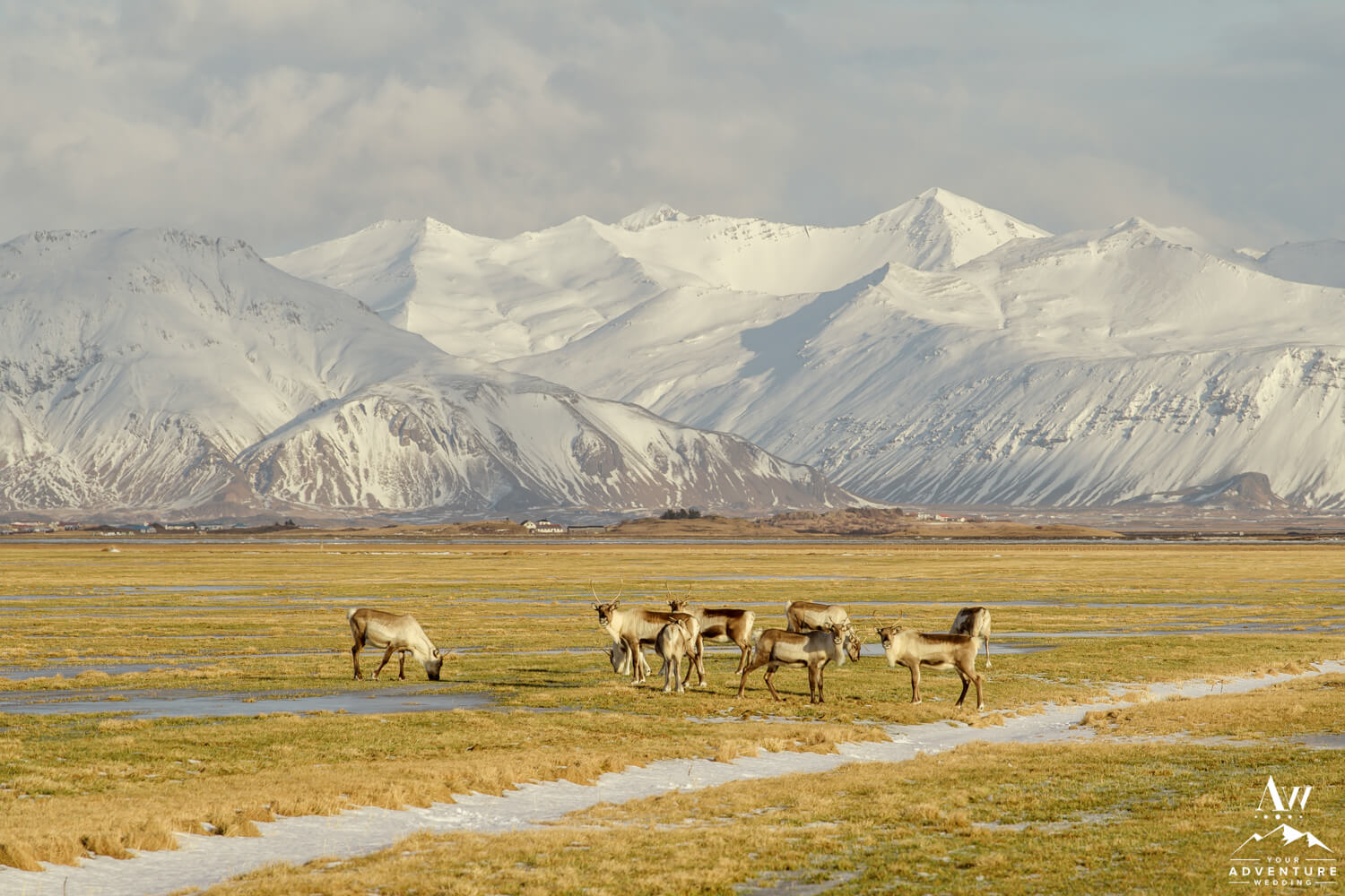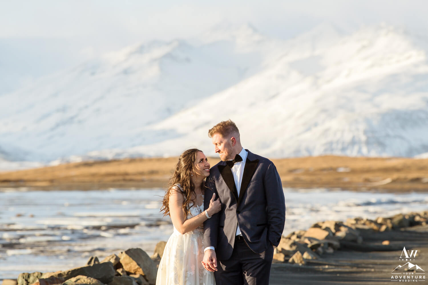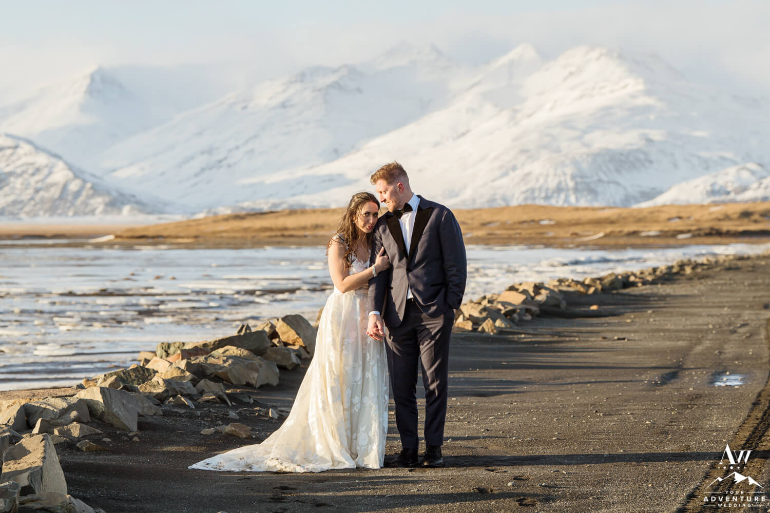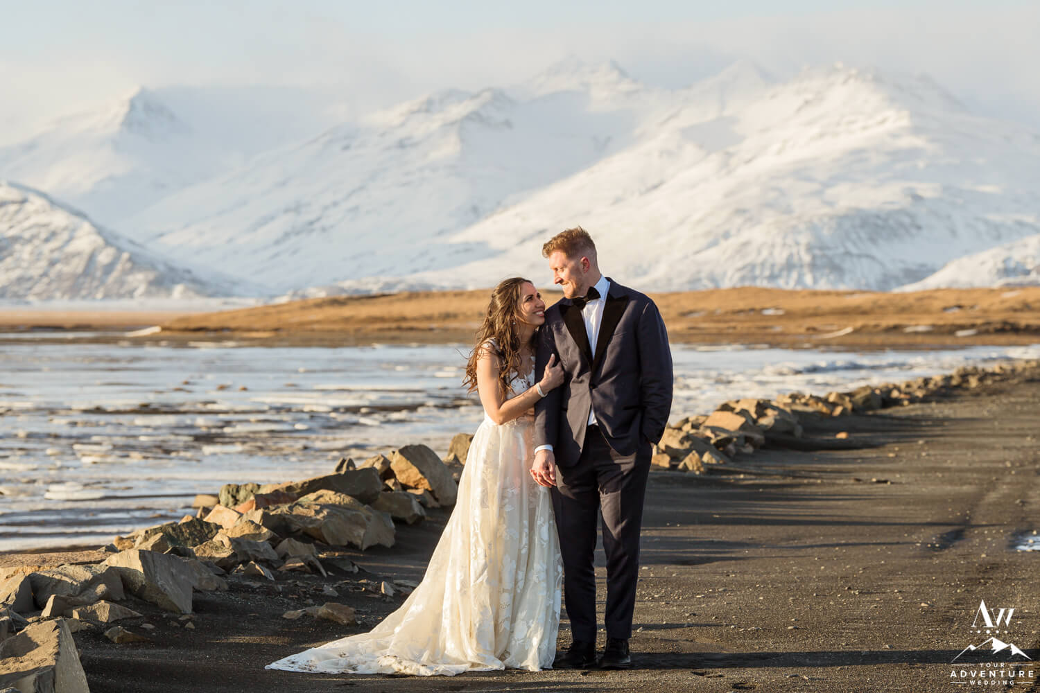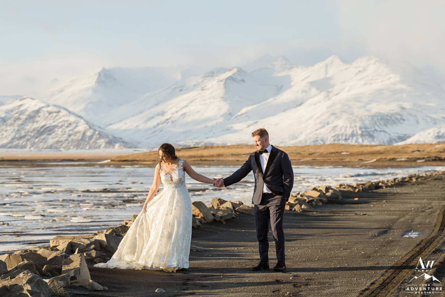 Hiking about an hour after the frozen glacier lake elopement, back to the super jeep, it was time to warm up and continue on with their adventurous day. Did you know East Iceland is known for having Iceland’s tallest mountain and reindeer? It just so happened Kristina and Ben experienced both! Further, the schedule continues on with gorgeous warm sunlight on an offbeat black beach road which had the most incredible mountain view… Kristina busted out her veil for a few Iceland elopement photos and they shared some super fun dance moves!