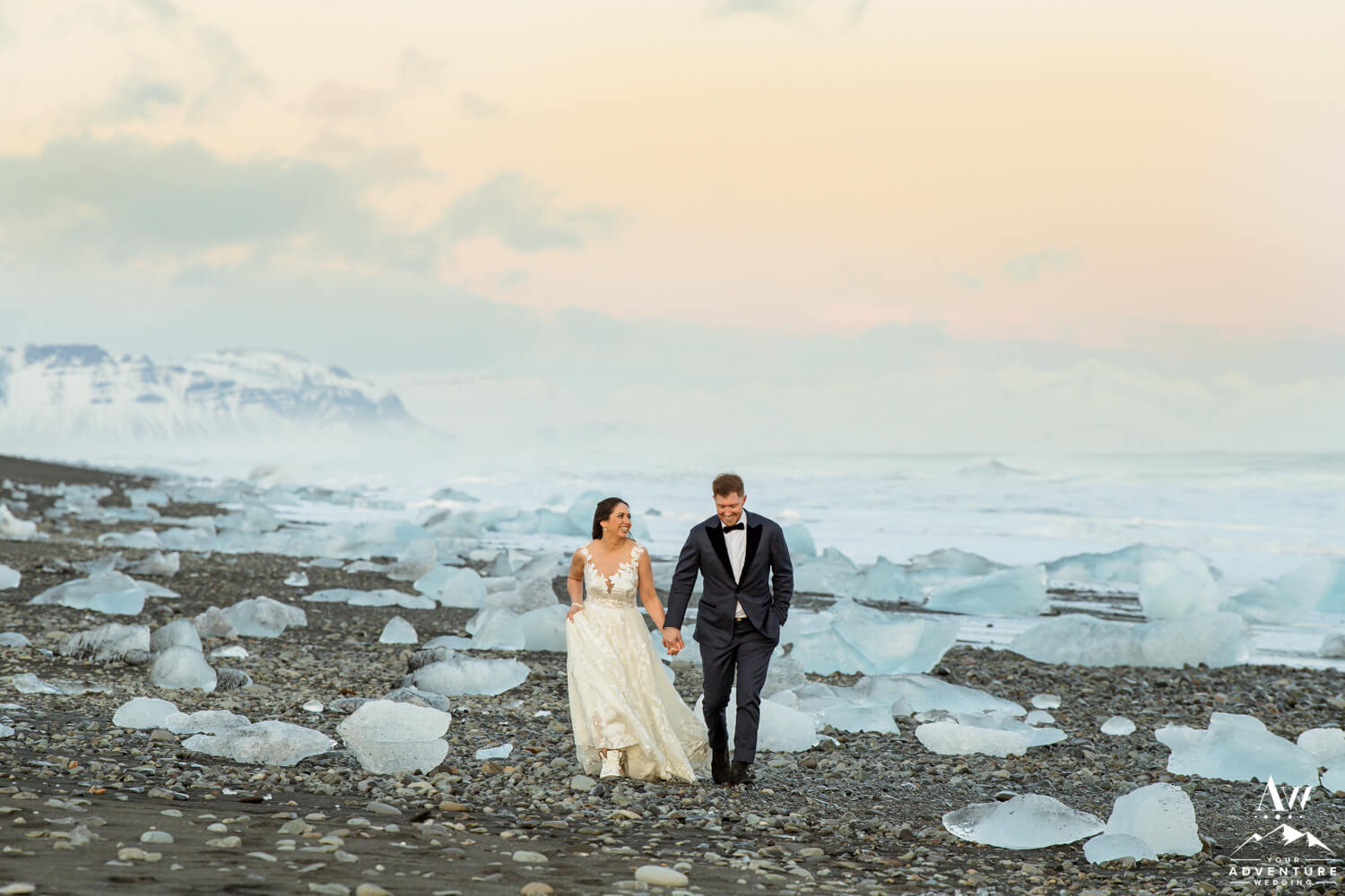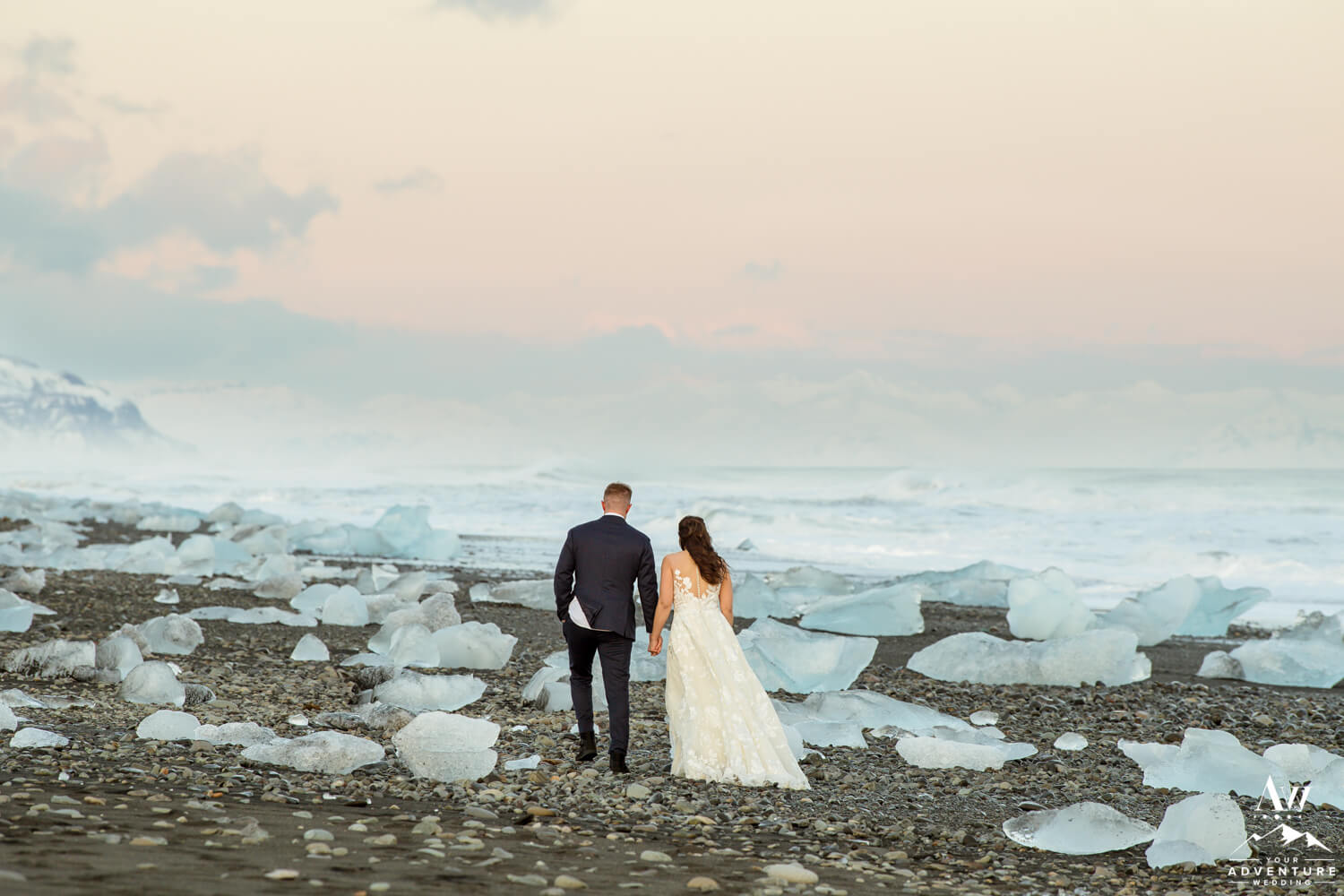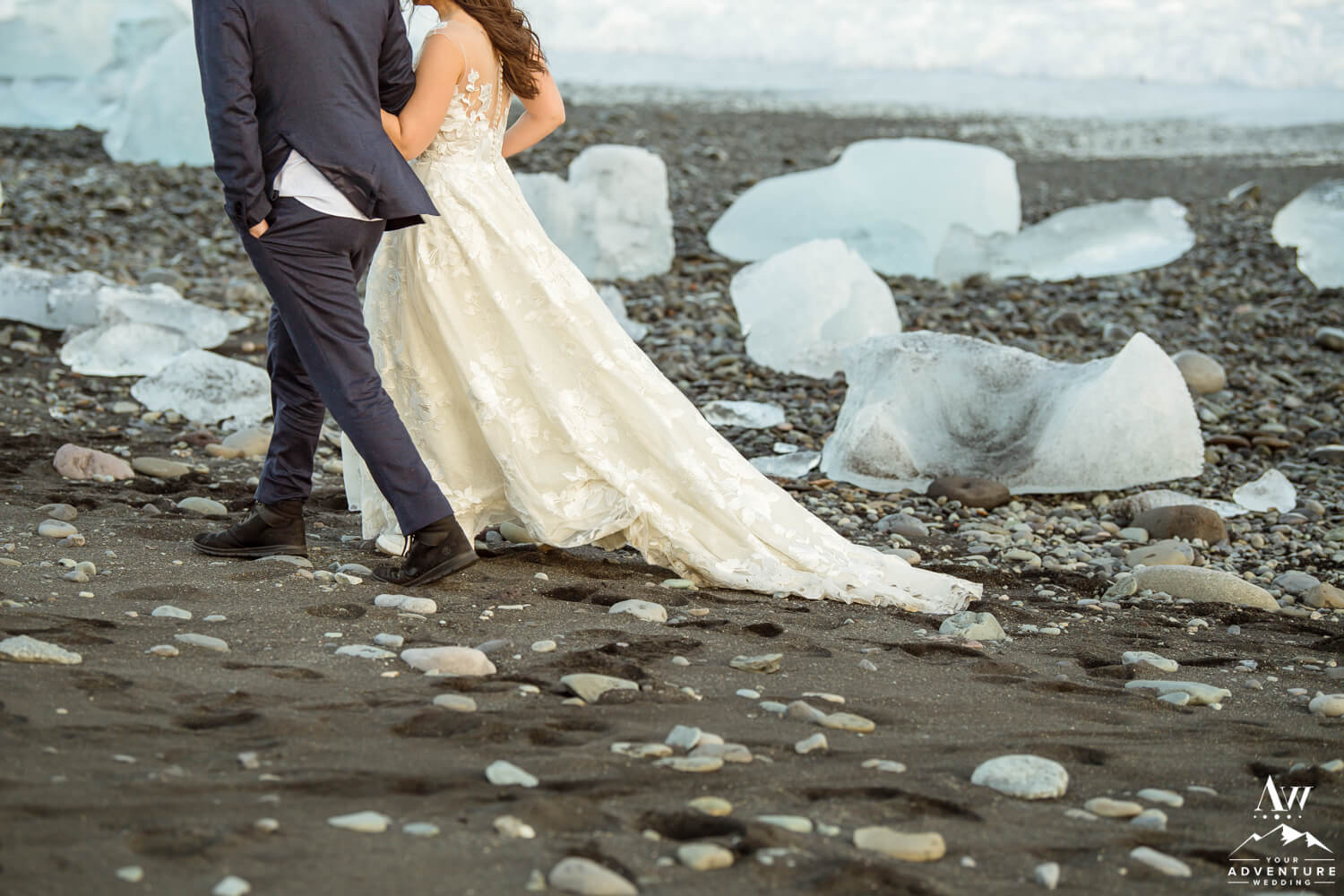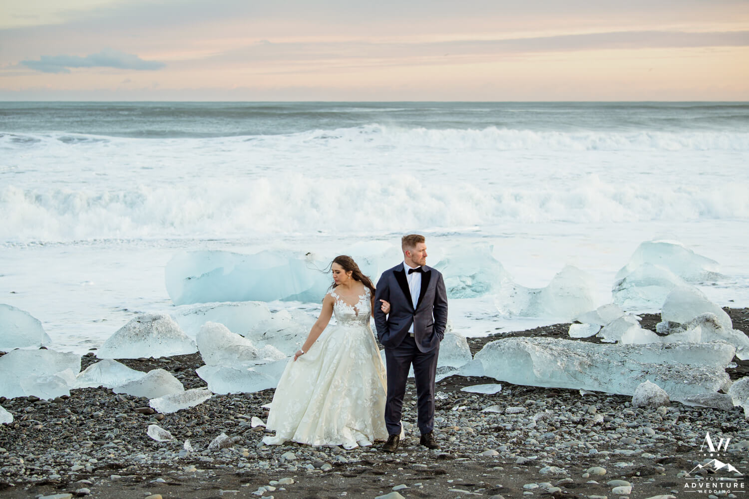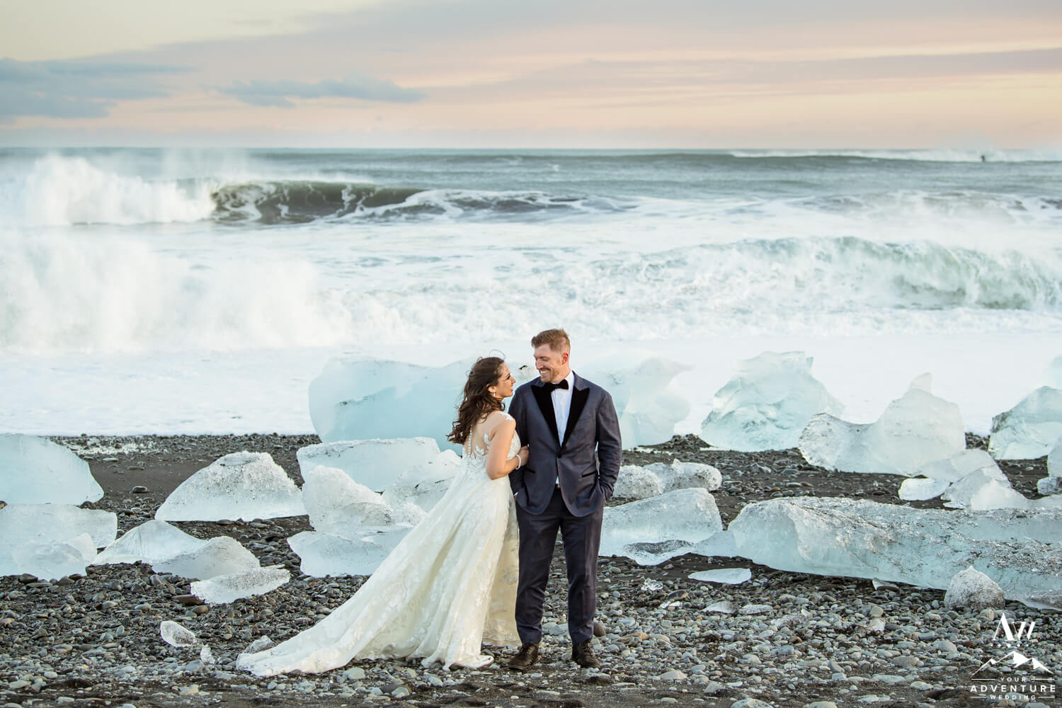 Due to the storm the previous night, the beach was full of chunks of ice (more than usual everywhere!). For instance, that partnered with the glorious evening light, made it such a romantic scene for Iceland elopement photos! Moreover, the drive back to the hotel brought a perfect sunset view of the kissing trolls!