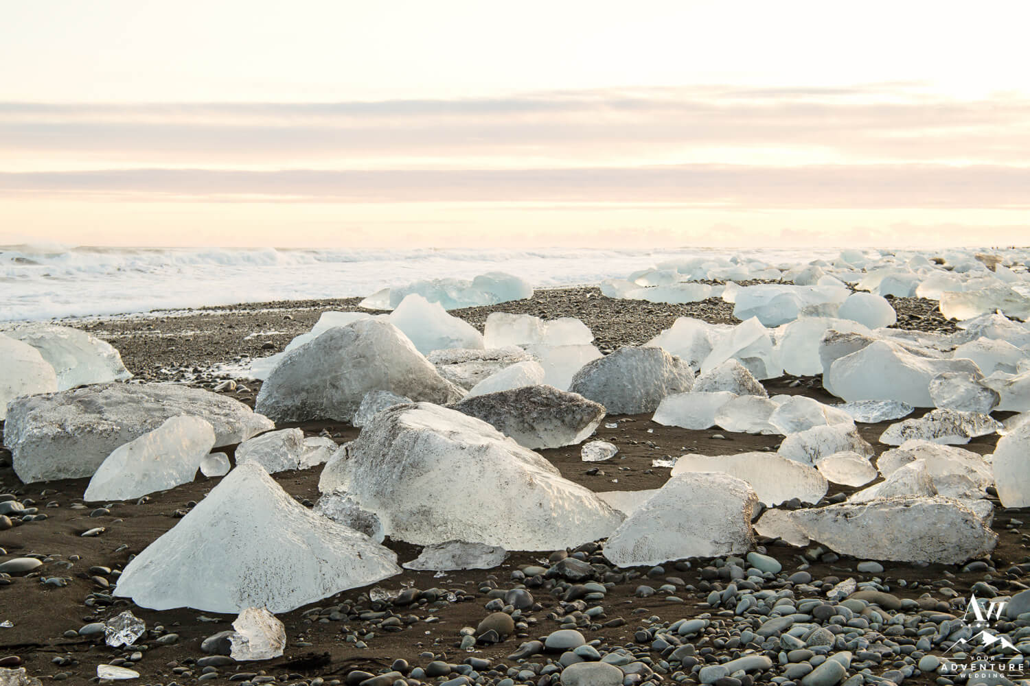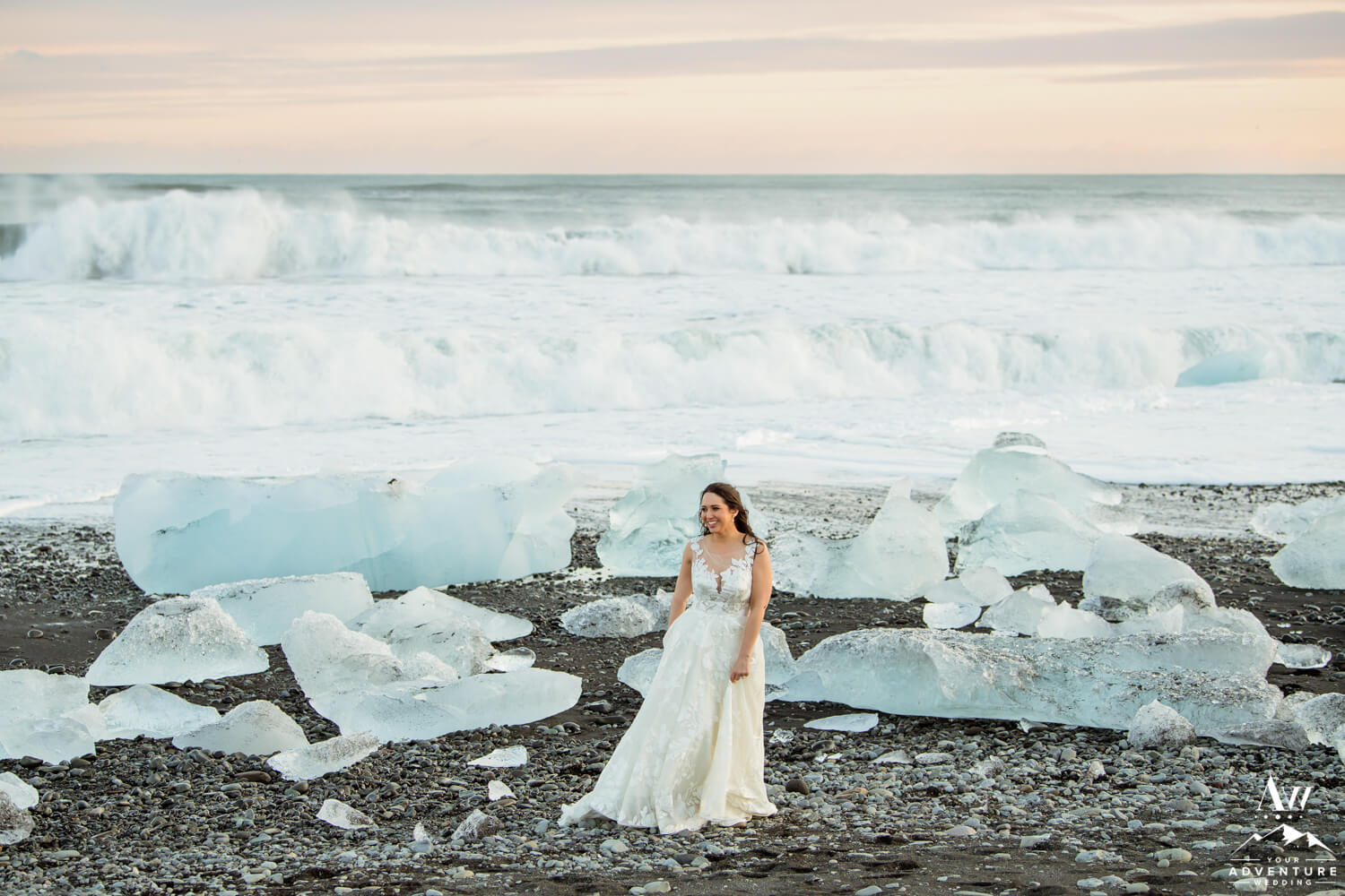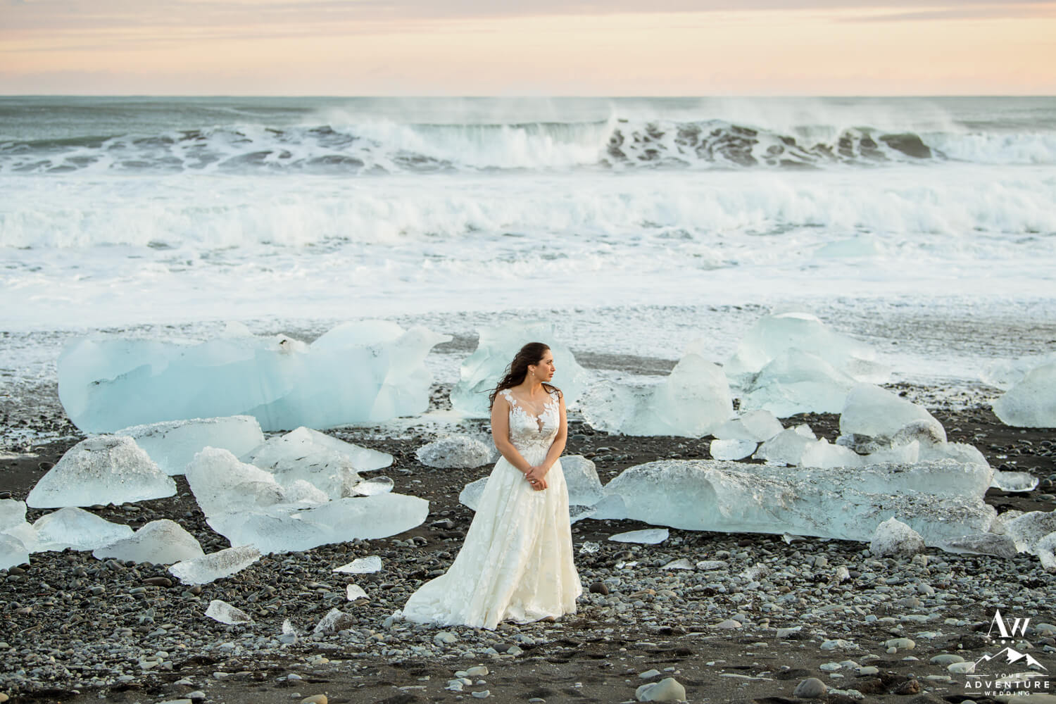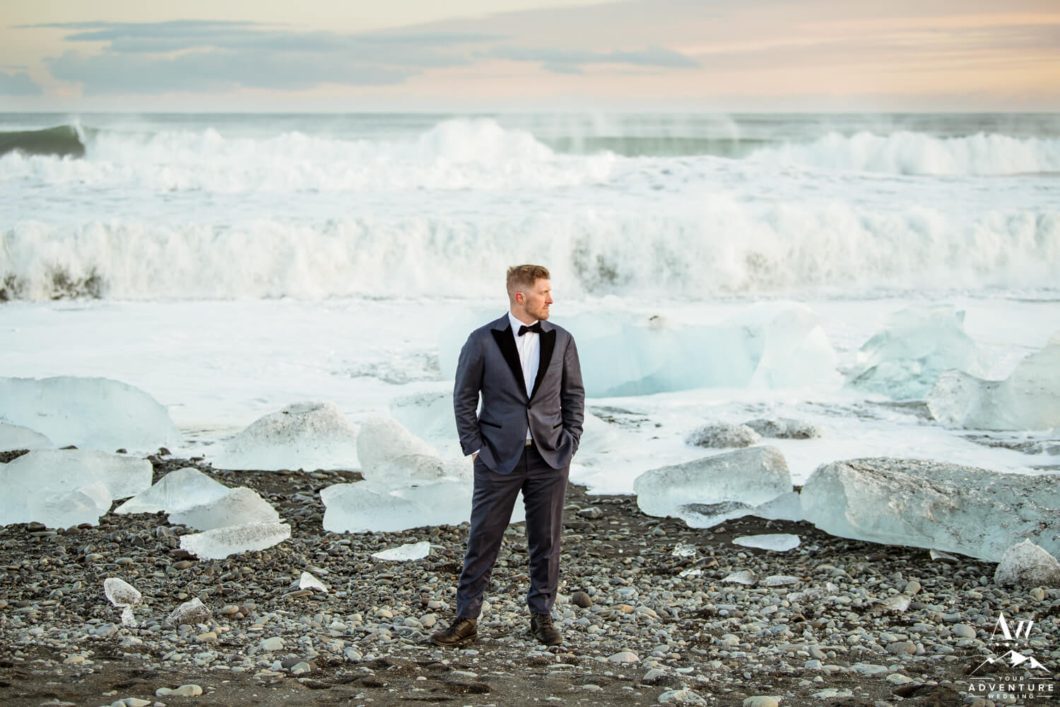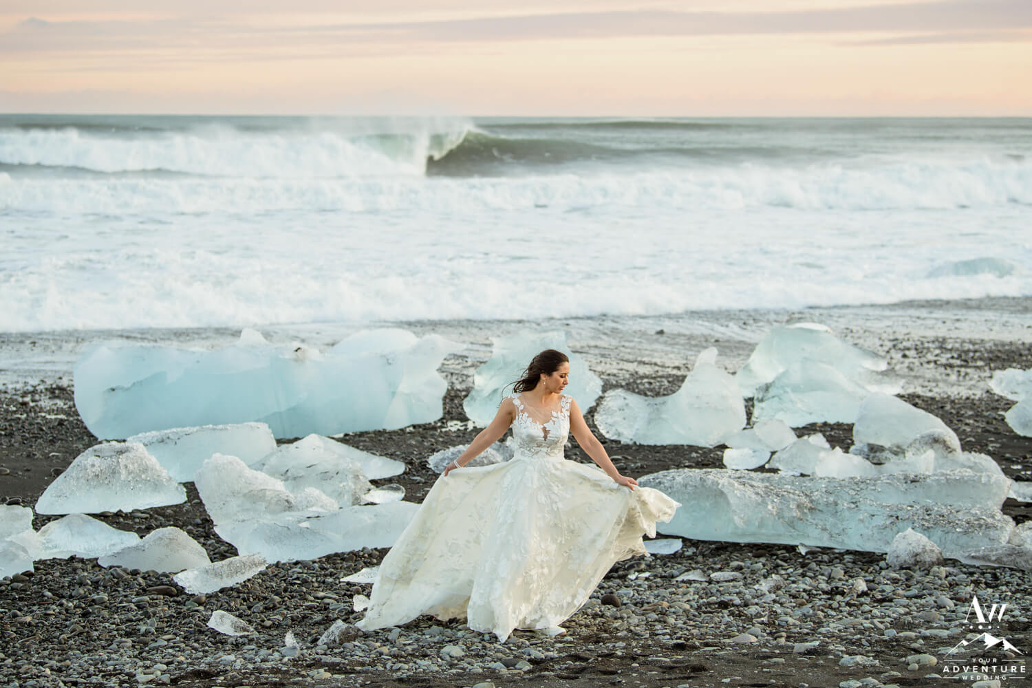 Due to the storm the previous night, the beach was full of chunks of ice (more than usual everywhere!). For instance, that partnered with the glorious evening light, made it such a romantic scene for Iceland elopement photos! Moreover, the drive back to the hotel brought a perfect sunset view of the kissing trolls!
