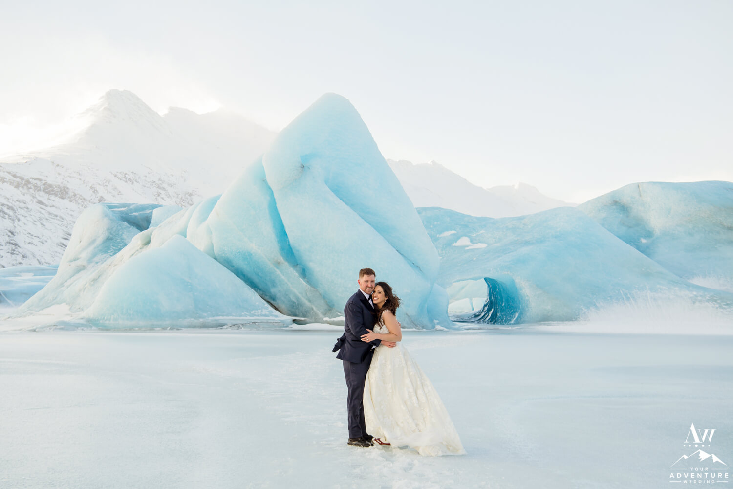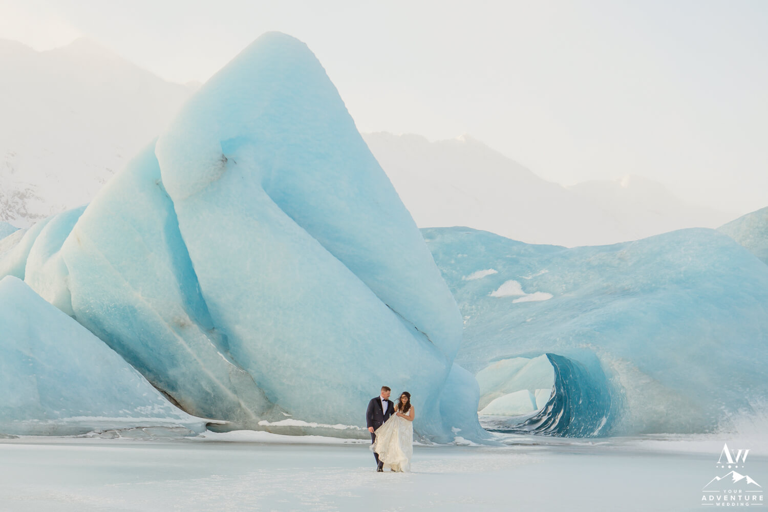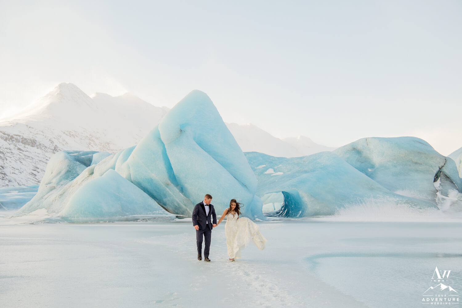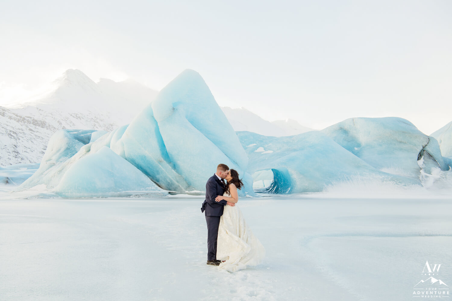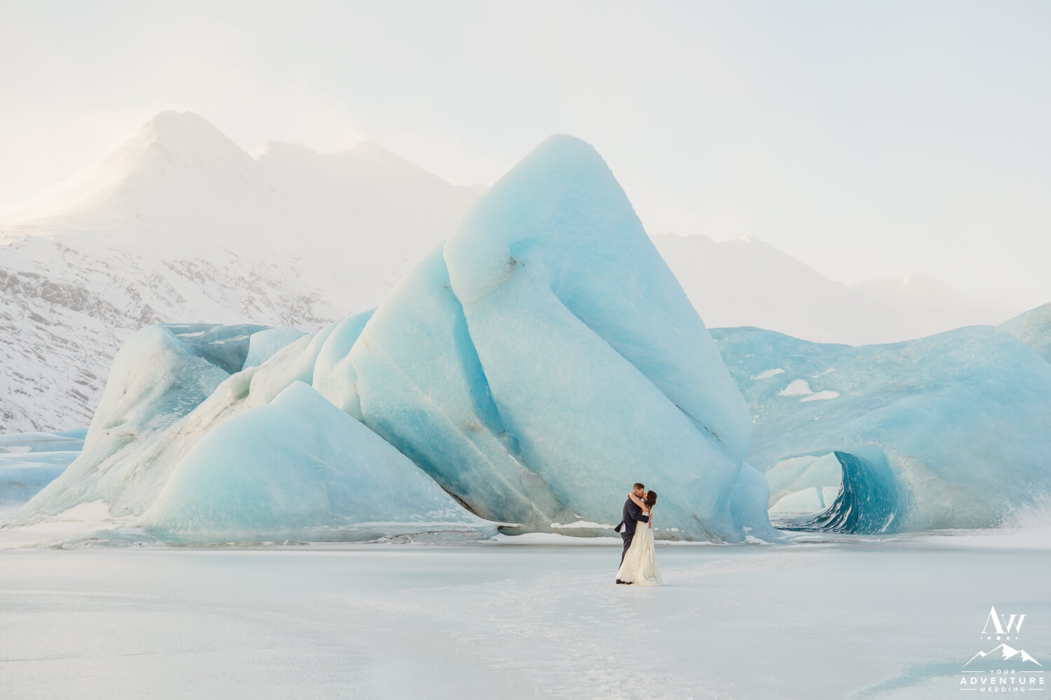 Leading up to their elopement adventure, we could not say for sure what blue ice cave would be an option for them. Usually not until the week of are we able to know what ice caves will be viable options and what the conditions could look like (IE, glacier walking crampons versus ice climbing ones, etc). However, all of the plans included some sort of blue ice cave. Meanwhile, one of our plans for the day included a frozen lake hiking elopement! For example, the morning brought cold enough temperatures to make the magical fairytale frozen glacier lake elopement and ceremony inside of a floating iceberg reality.