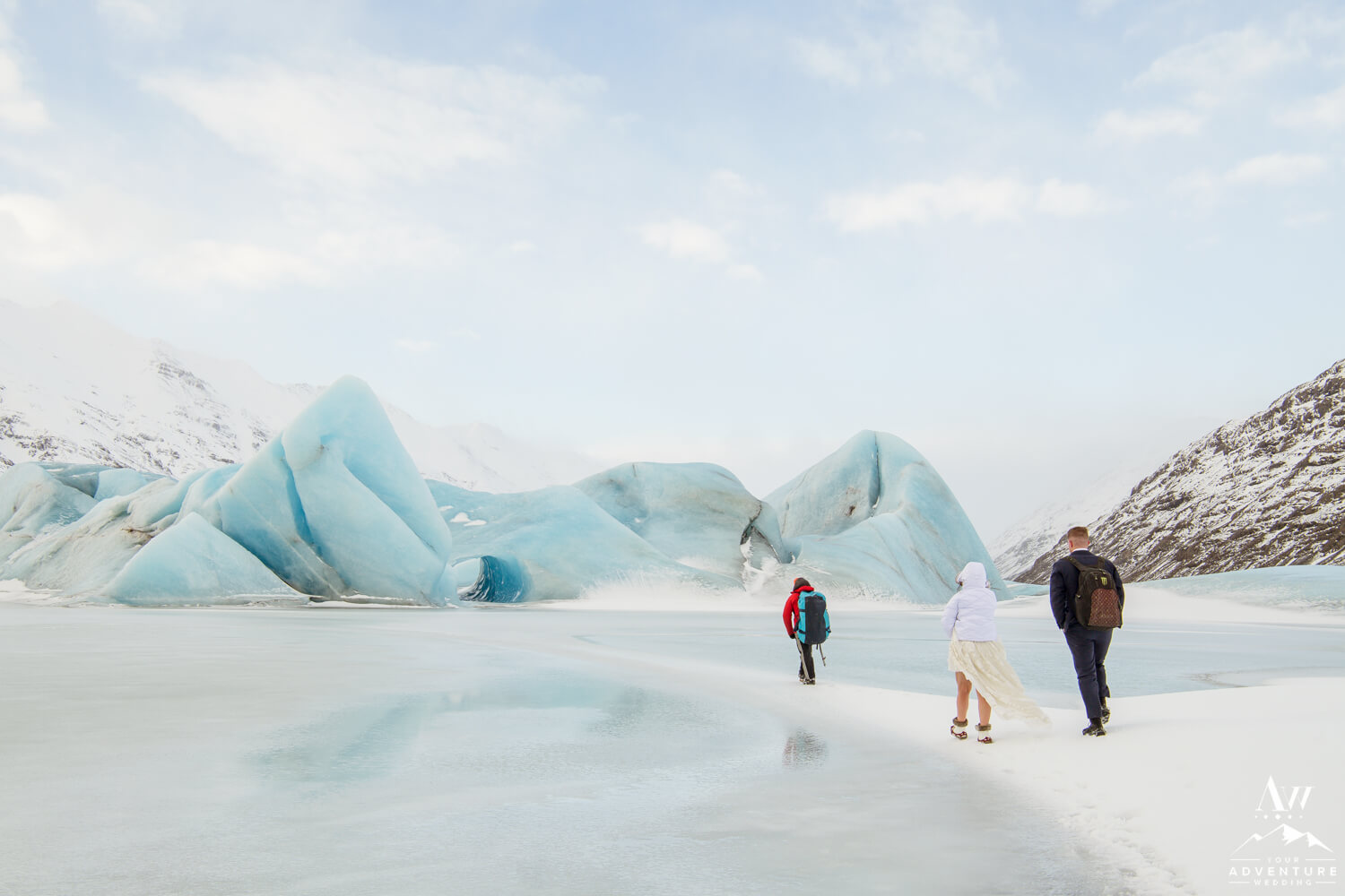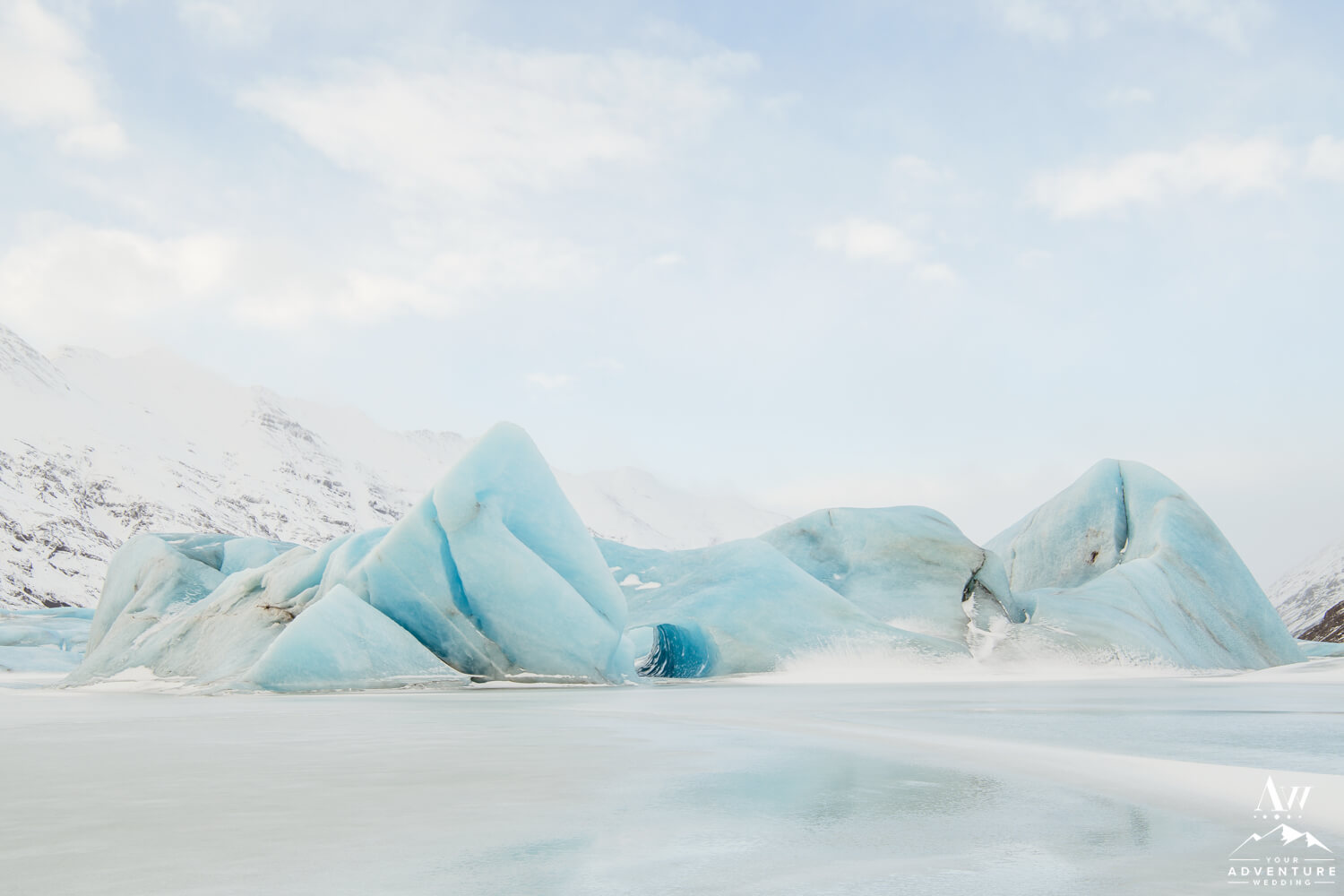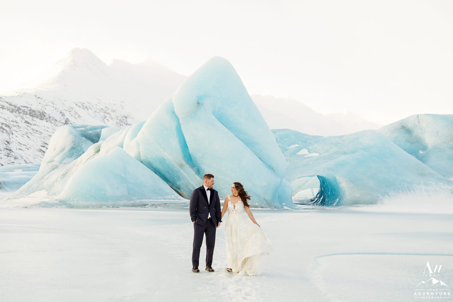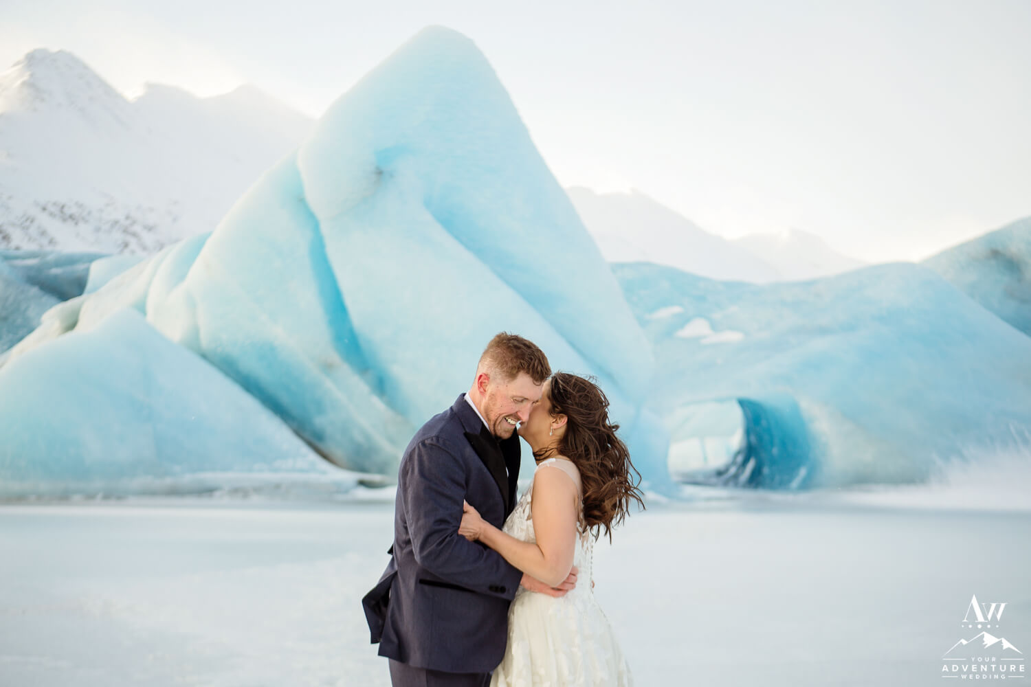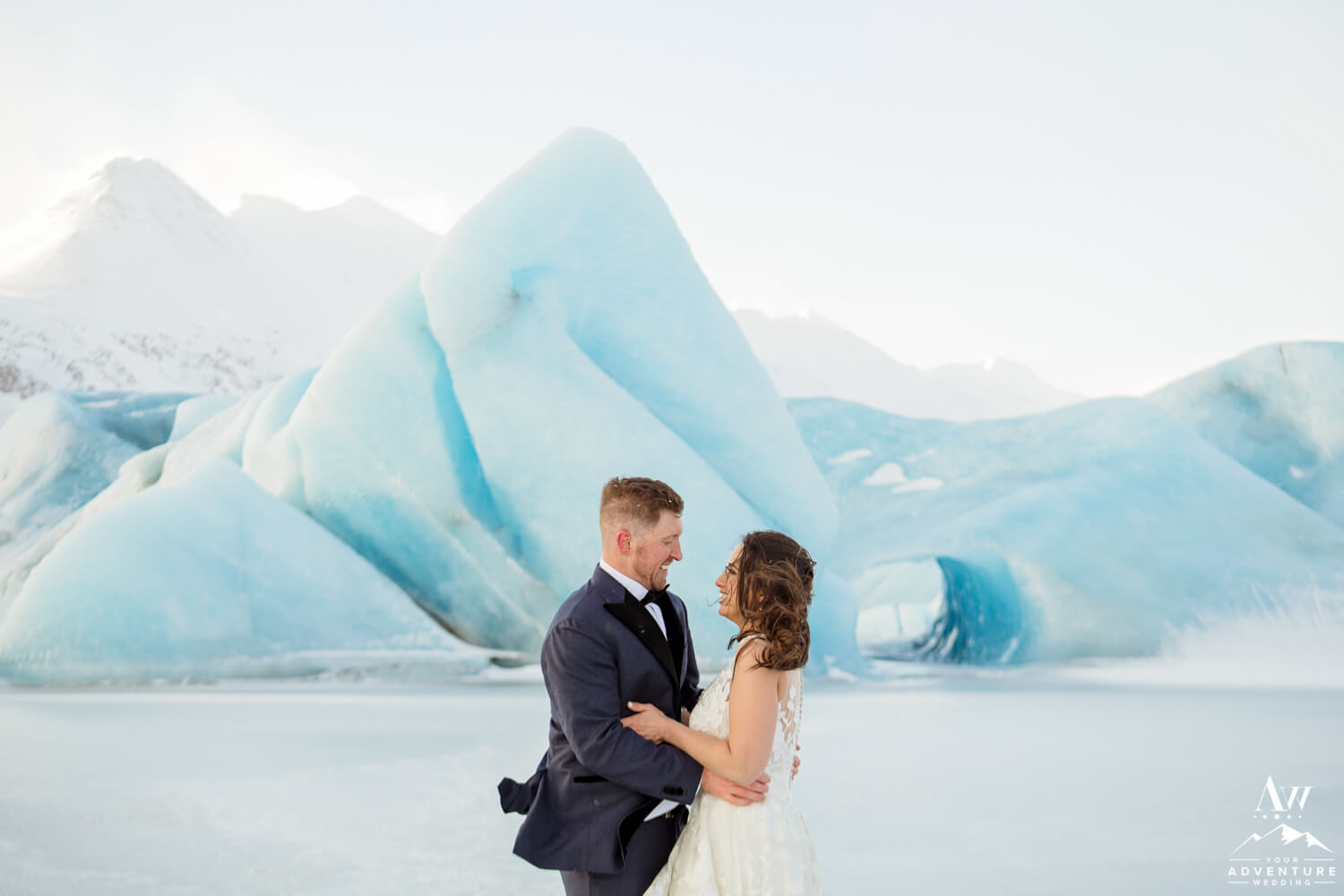 Leading up to their elopement adventure, we could not say for sure what blue ice cave would be an option for them. Usually not until the week of are we able to know what ice caves will be viable options and what the conditions could look like (IE, glacier walking crampons versus ice climbing ones, etc). However, all of the plans included some sort of blue ice cave. Meanwhile, one of our plans for the day included a frozen lake hiking elopement! For example, the morning brought cold enough temperatures to make the magical fairytale frozen glacier lake elopement and ceremony inside of a floating iceberg reality.